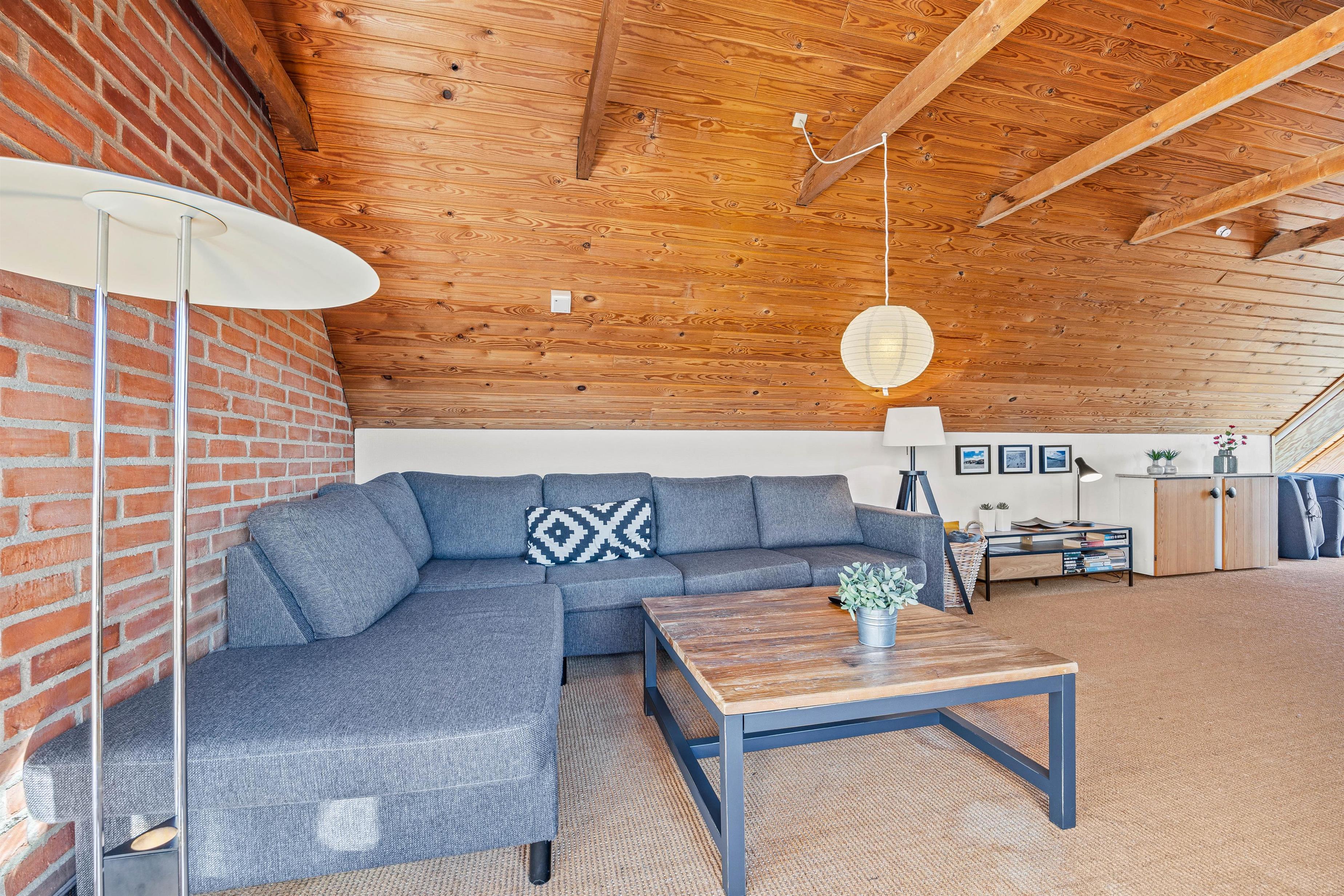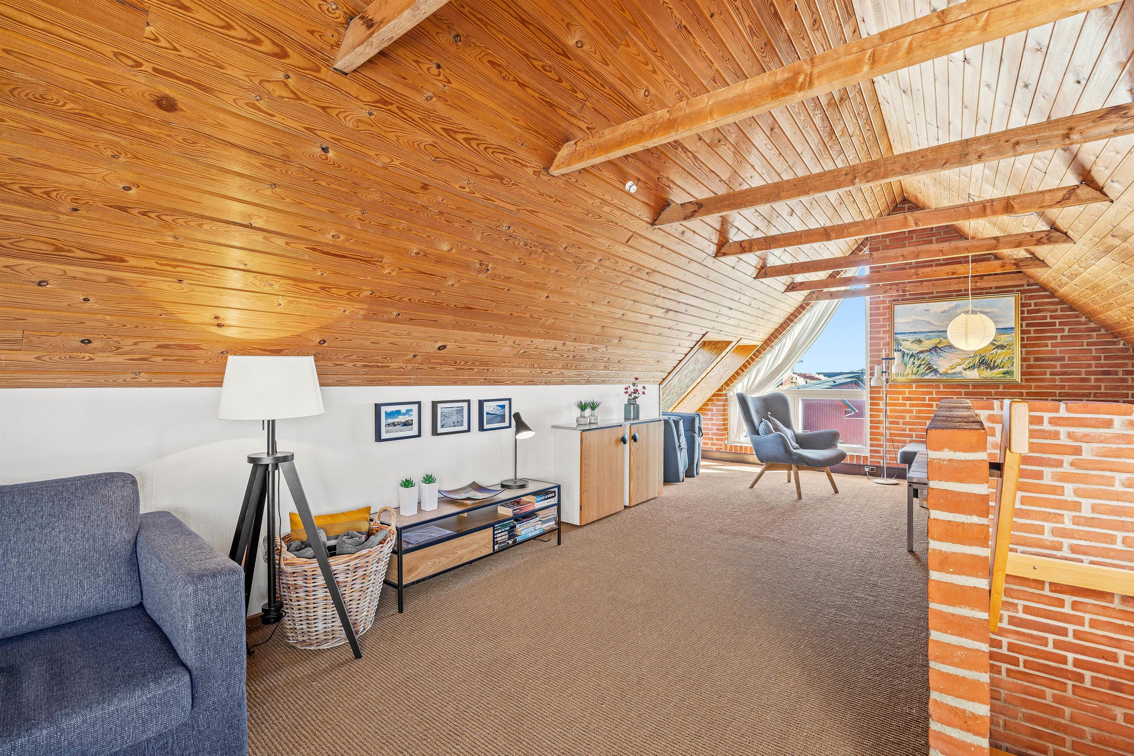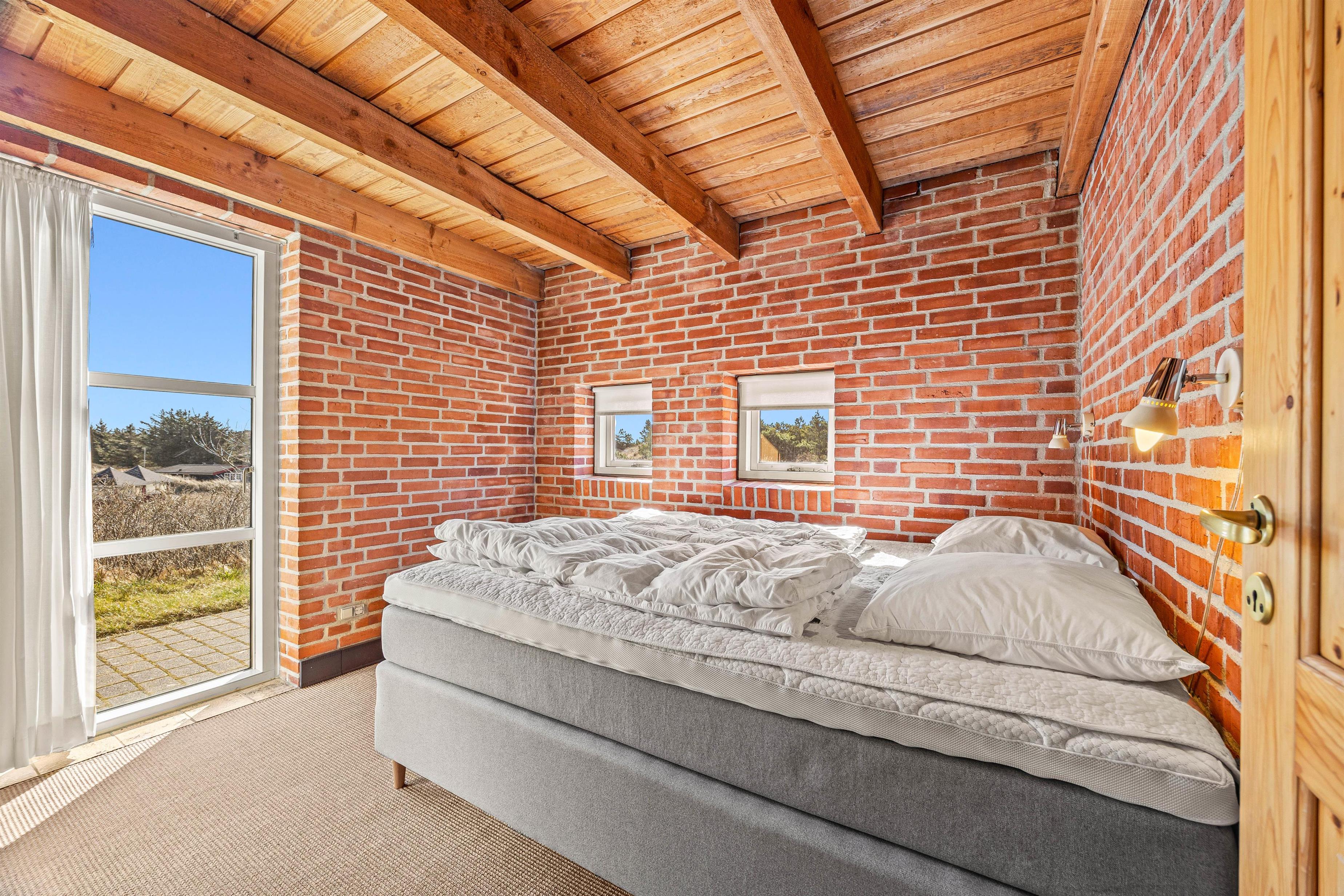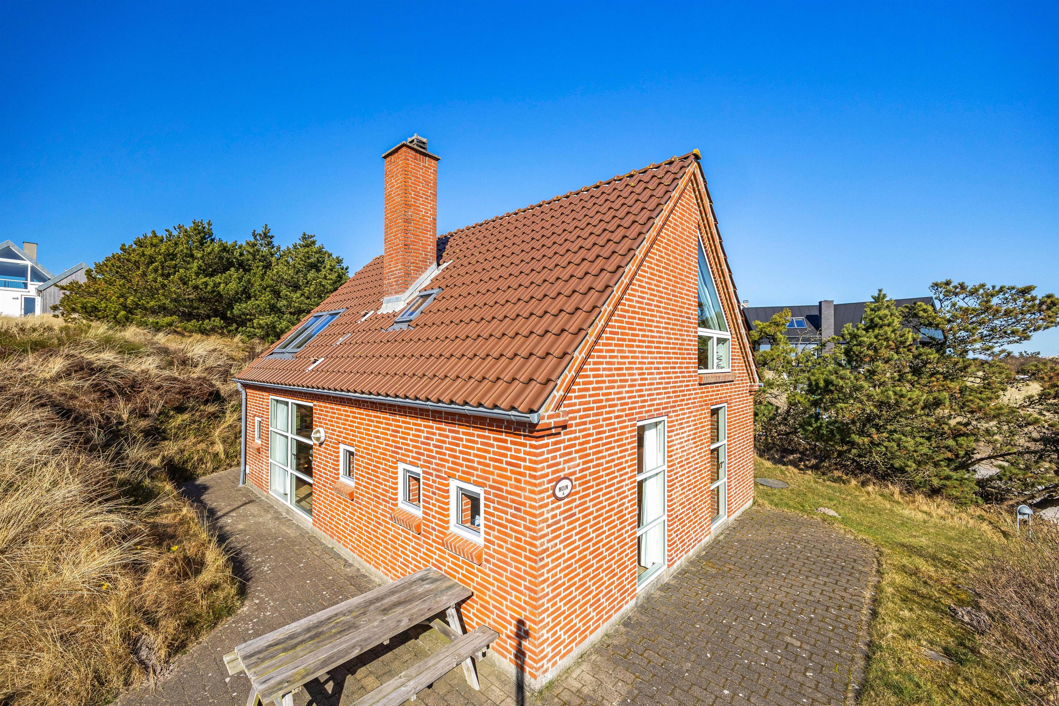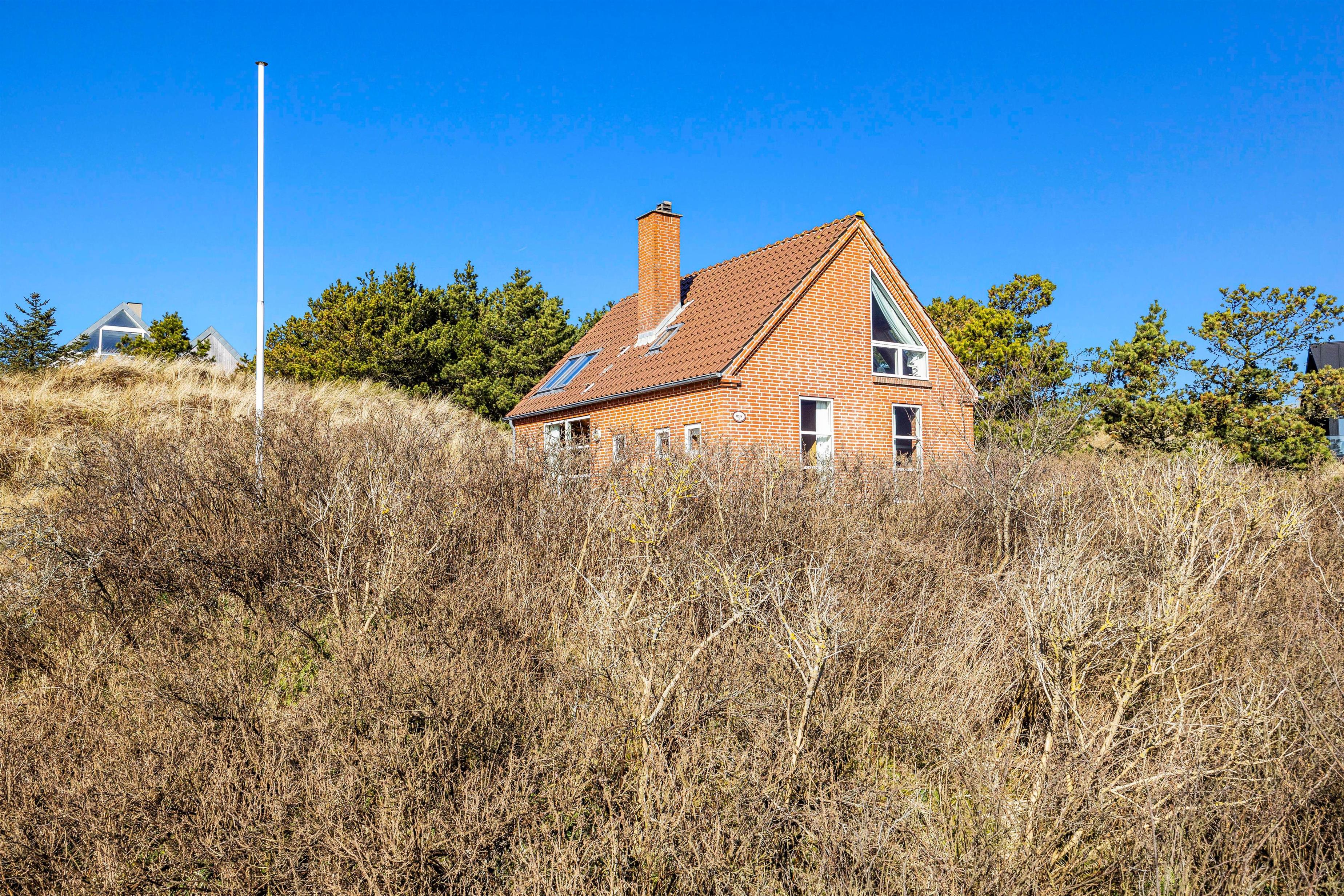En trappe fører jer op til dette murstenshus i 2 plan, som ligger på en klittop med en pragtfuld udsigt. Sommerhusets flotte køkken ligger i åben forbindelse til stuen, hvorfra det er nemt at få øje på den egnens enestående natur. Også fra Tv-stuen på 1. sal, hvor der er 2 siddegrupper, er der en skøn udsigt over området omkring dette sommerhus.
