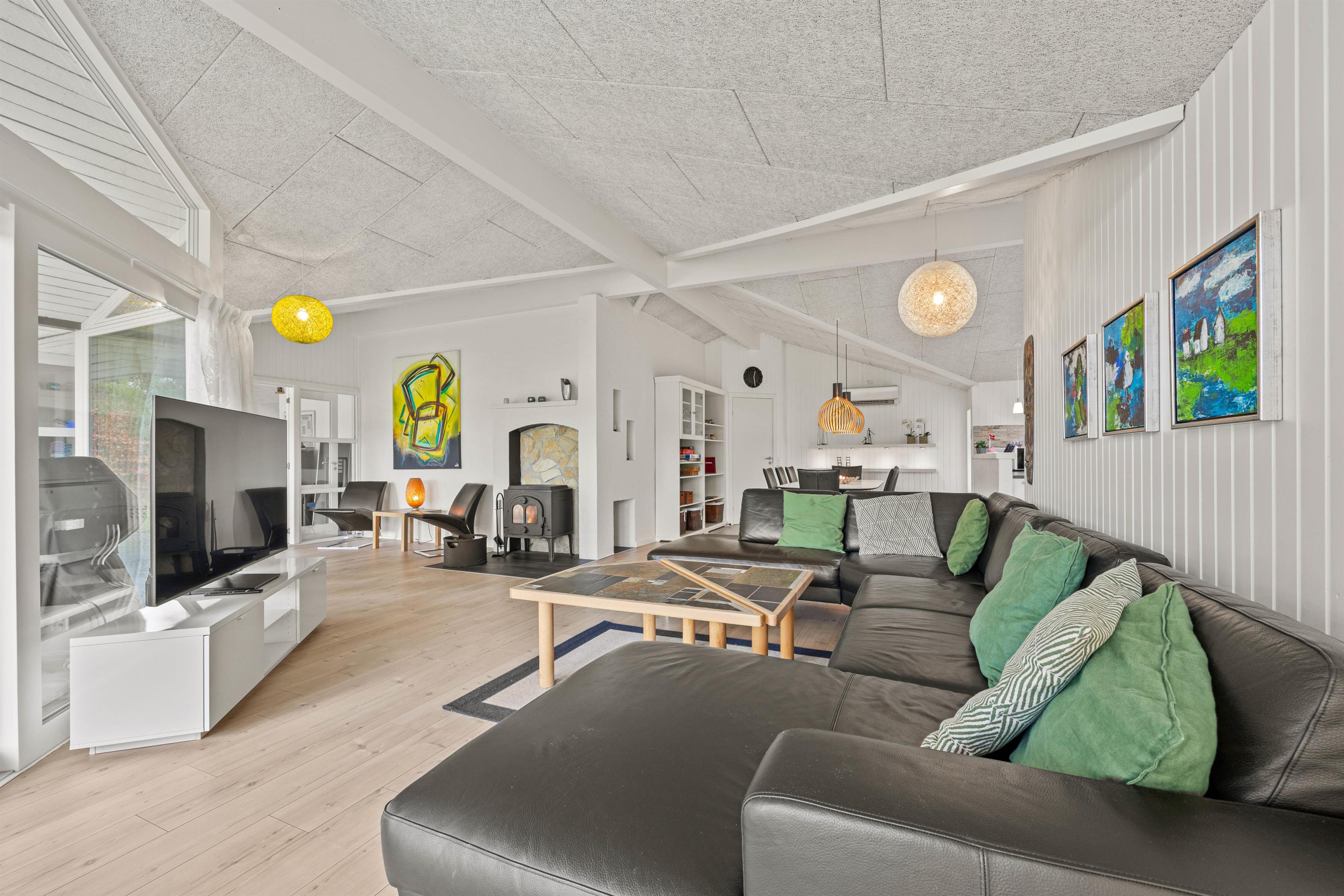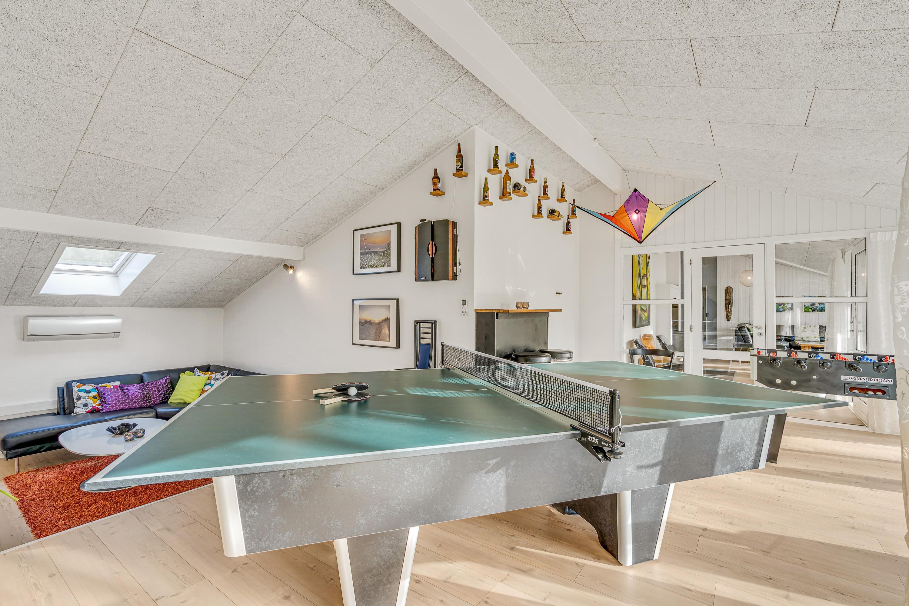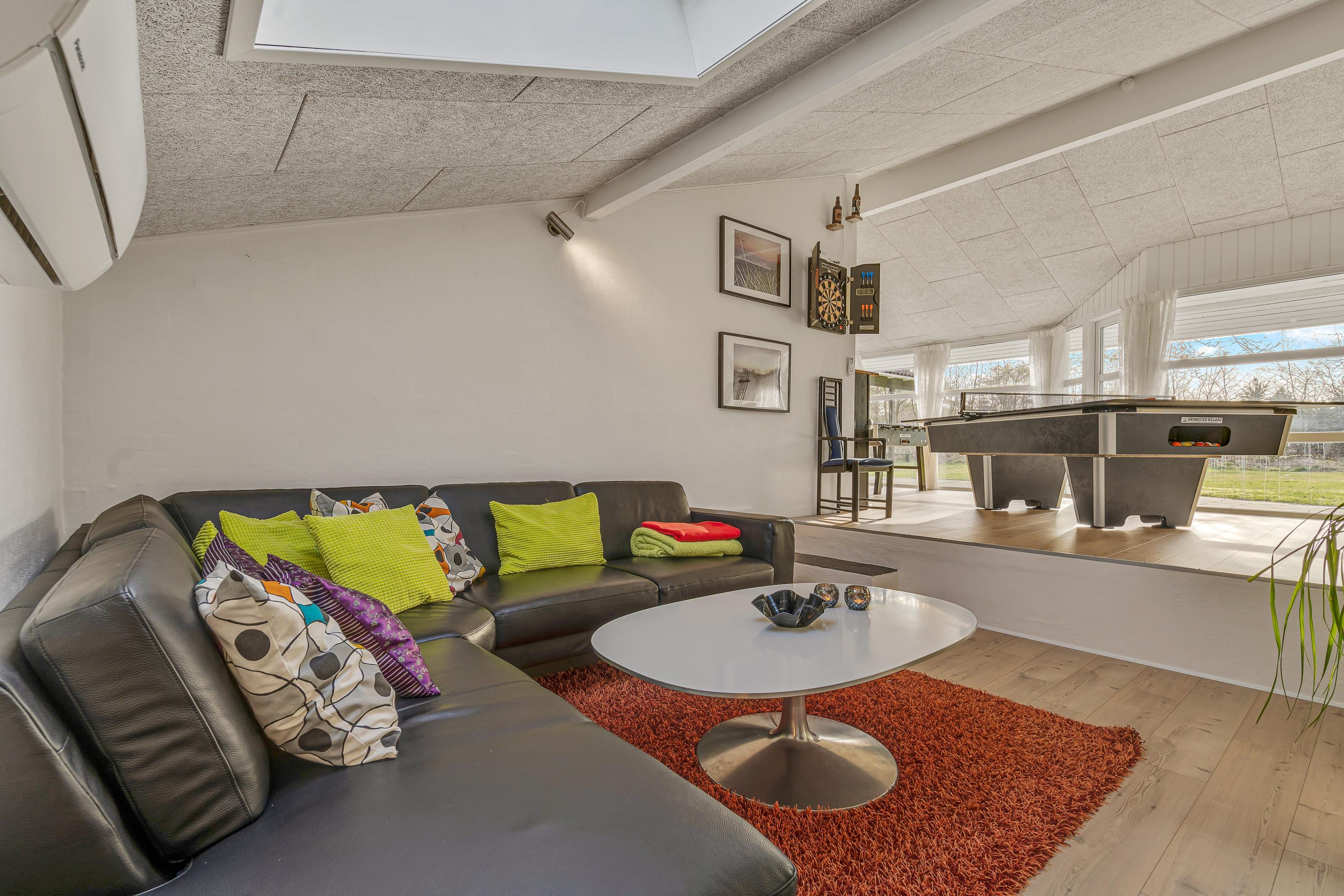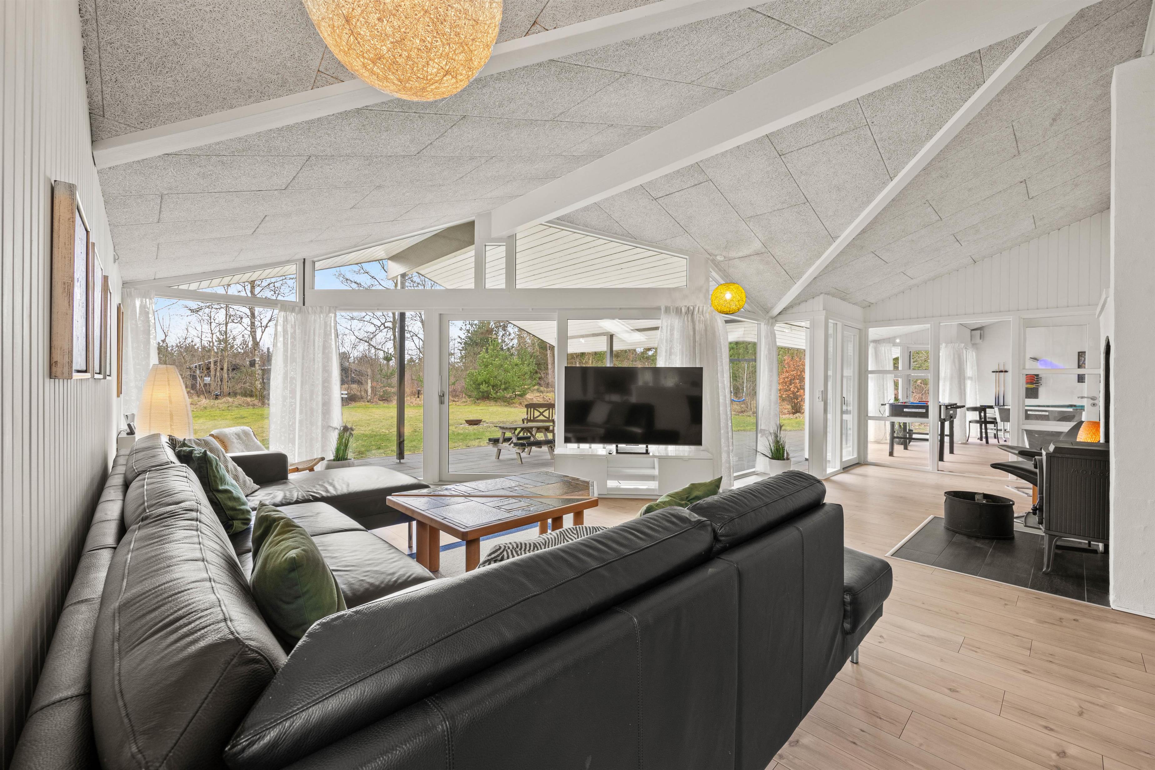 Den lyse indretning, de store vinduespartier og ovenlysvinduer giver en hel særlig stemning i sommerhuset. Lad det store veludstyrede køkken danne rammen om fælles madlavning, hyg jer sammen om spisebordet, eller i en af de fine afdelinger i stuen. Både børn og voksne vil nyde en dyst i bordfodbold, mens andre vil nyde at slappe af i en af sofaerne, med ild i brændeovnen og en god bog.