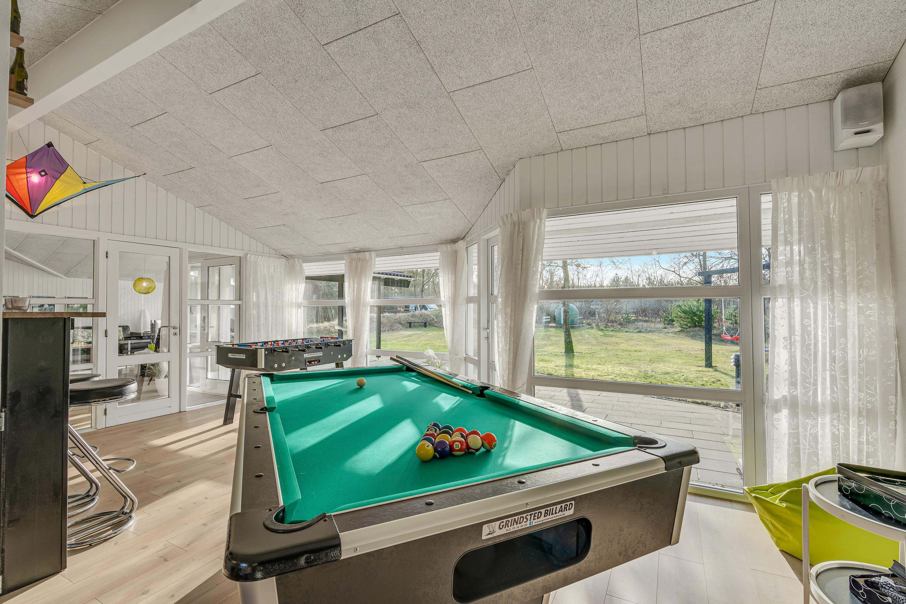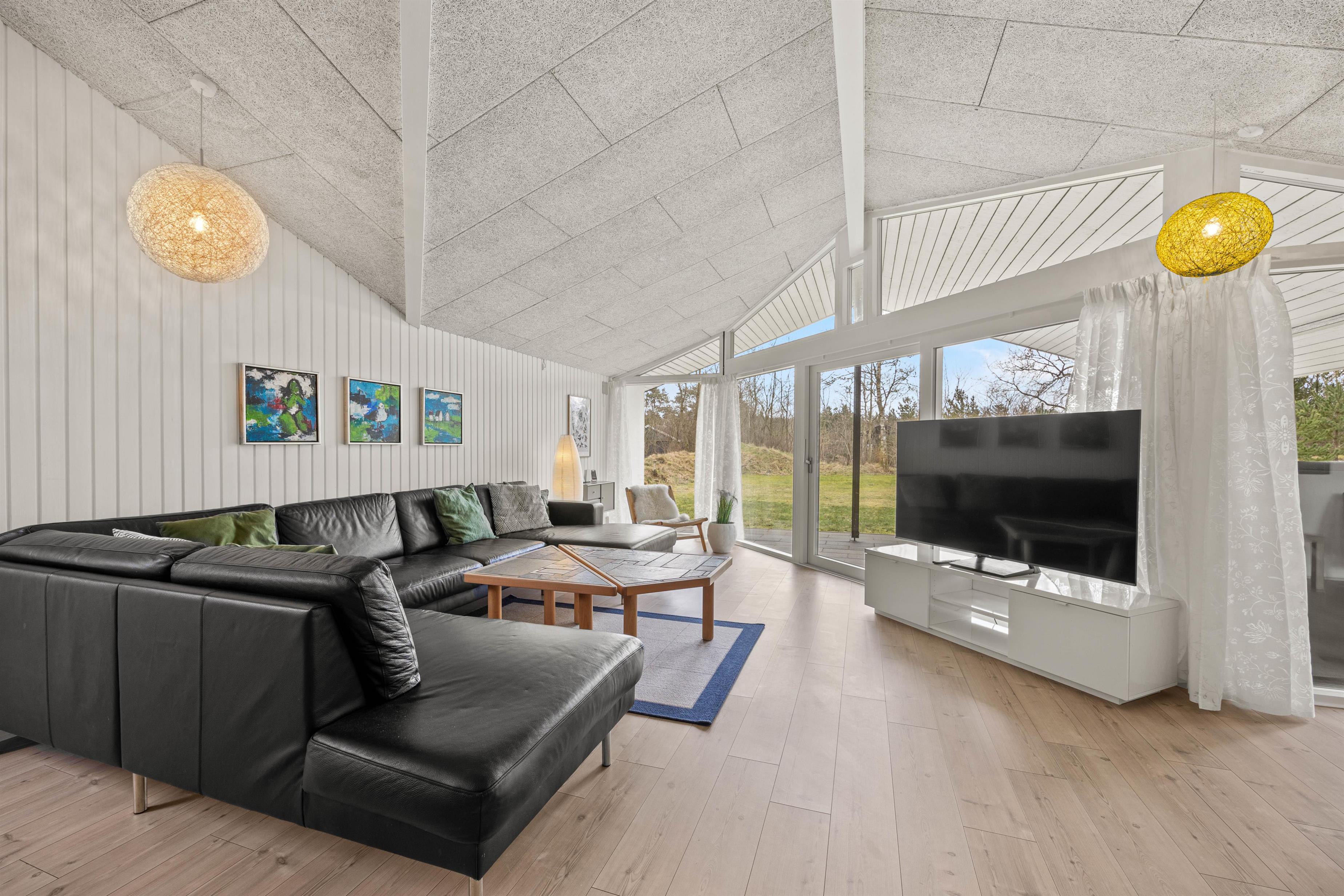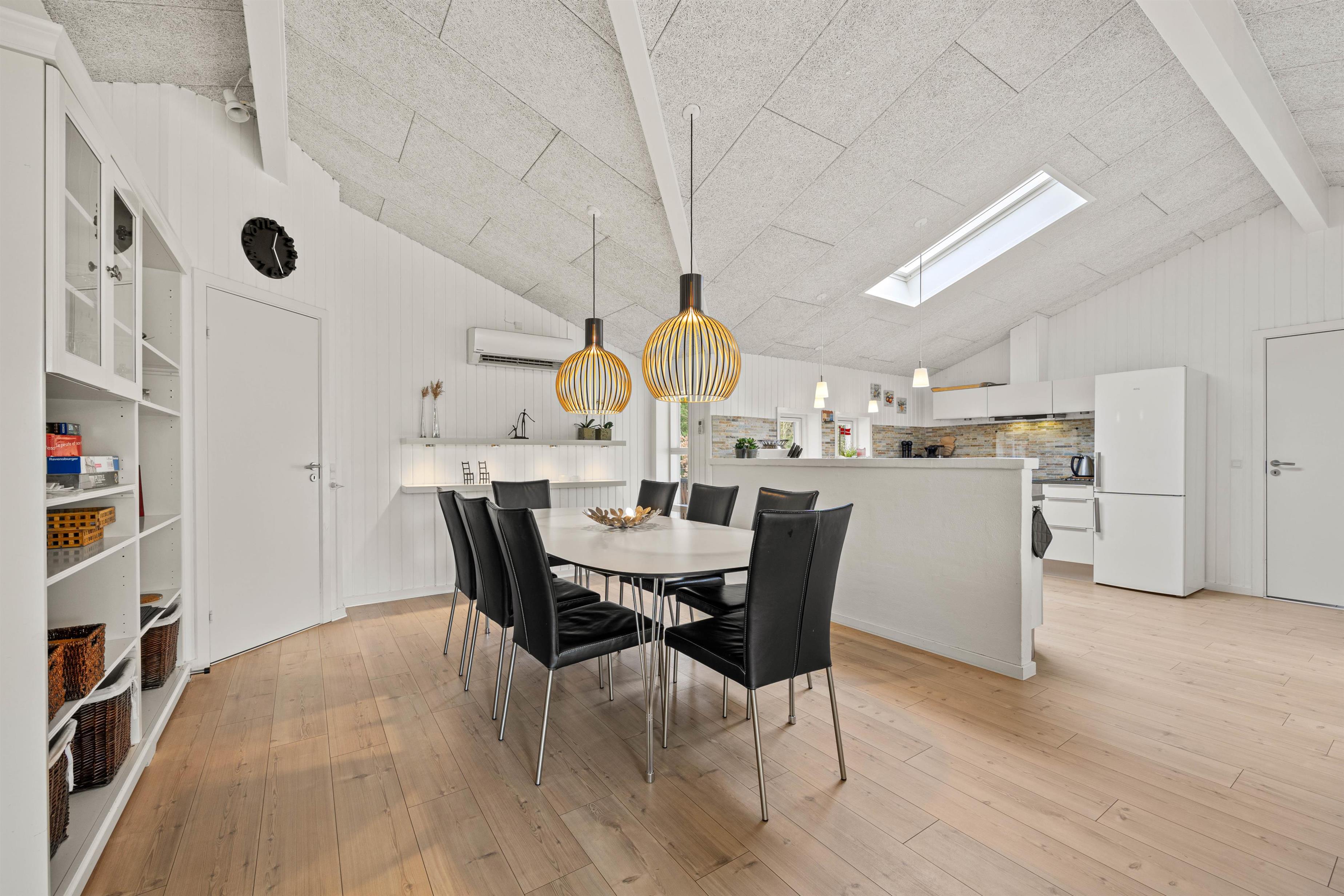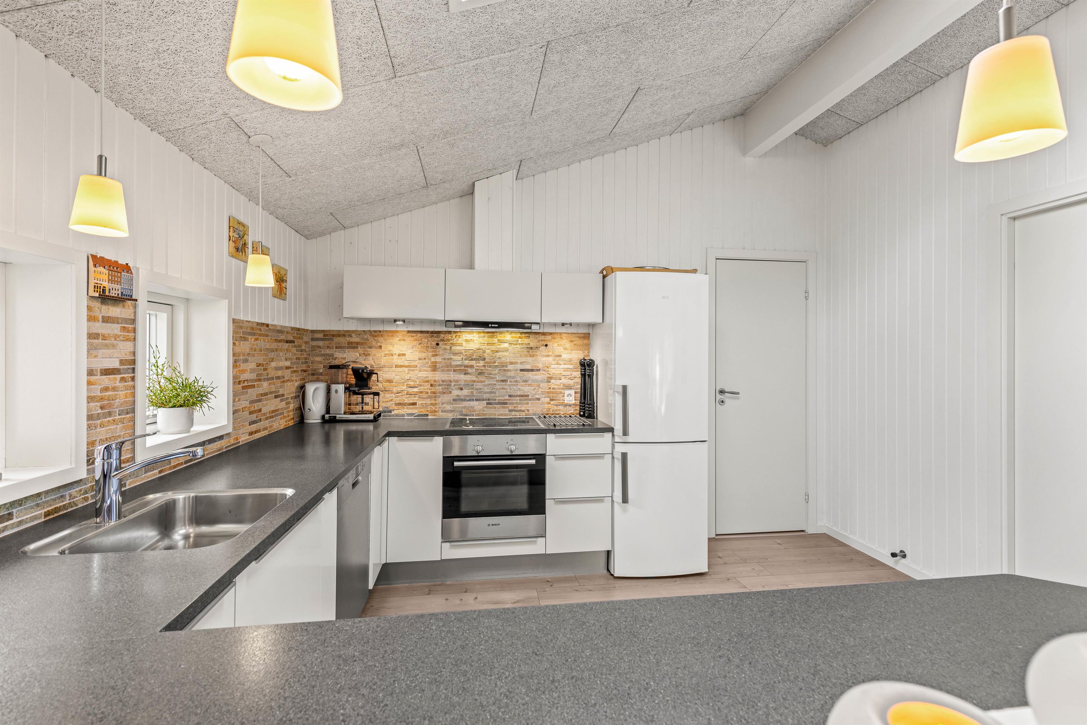 Den lyse indretning, de store vinduespartier og ovenlysvinduer giver en hel særlig stemning i sommerhuset. Lad det store veludstyrede køkken danne rammen om fælles madlavning, hyg jer sammen om spisebordet, eller i en af de fine afdelinger i stuen. Både børn og voksne vil nyde en dyst i bordfodbold, mens andre vil nyde at slappe af i en af sofaerne, med ild i brændeovnen og en god bog.