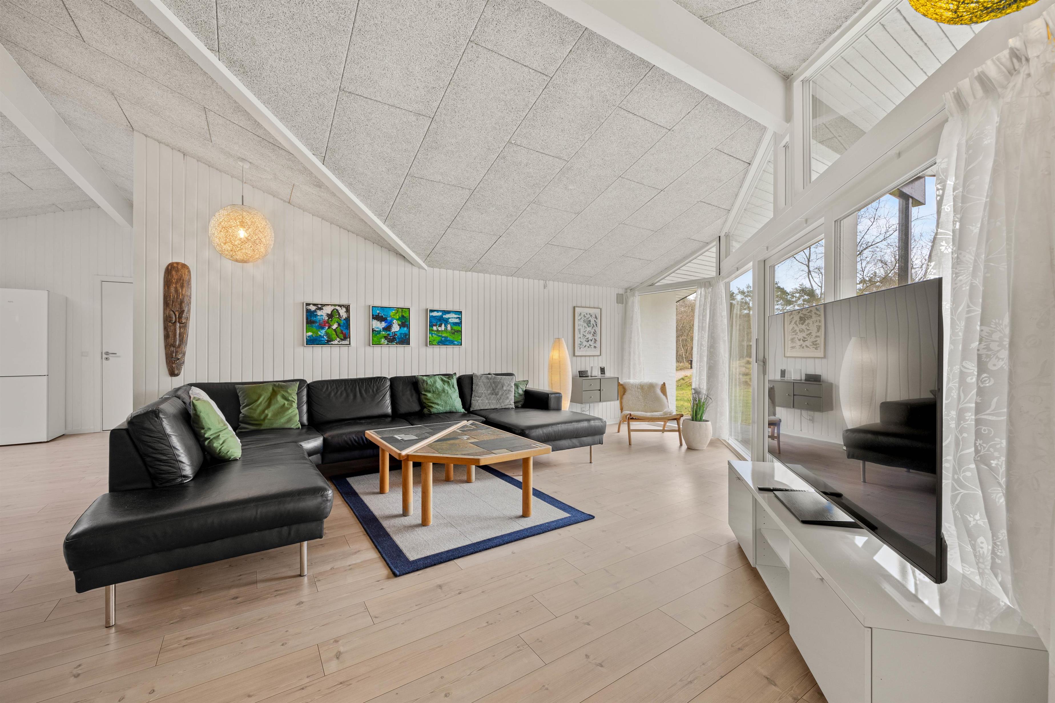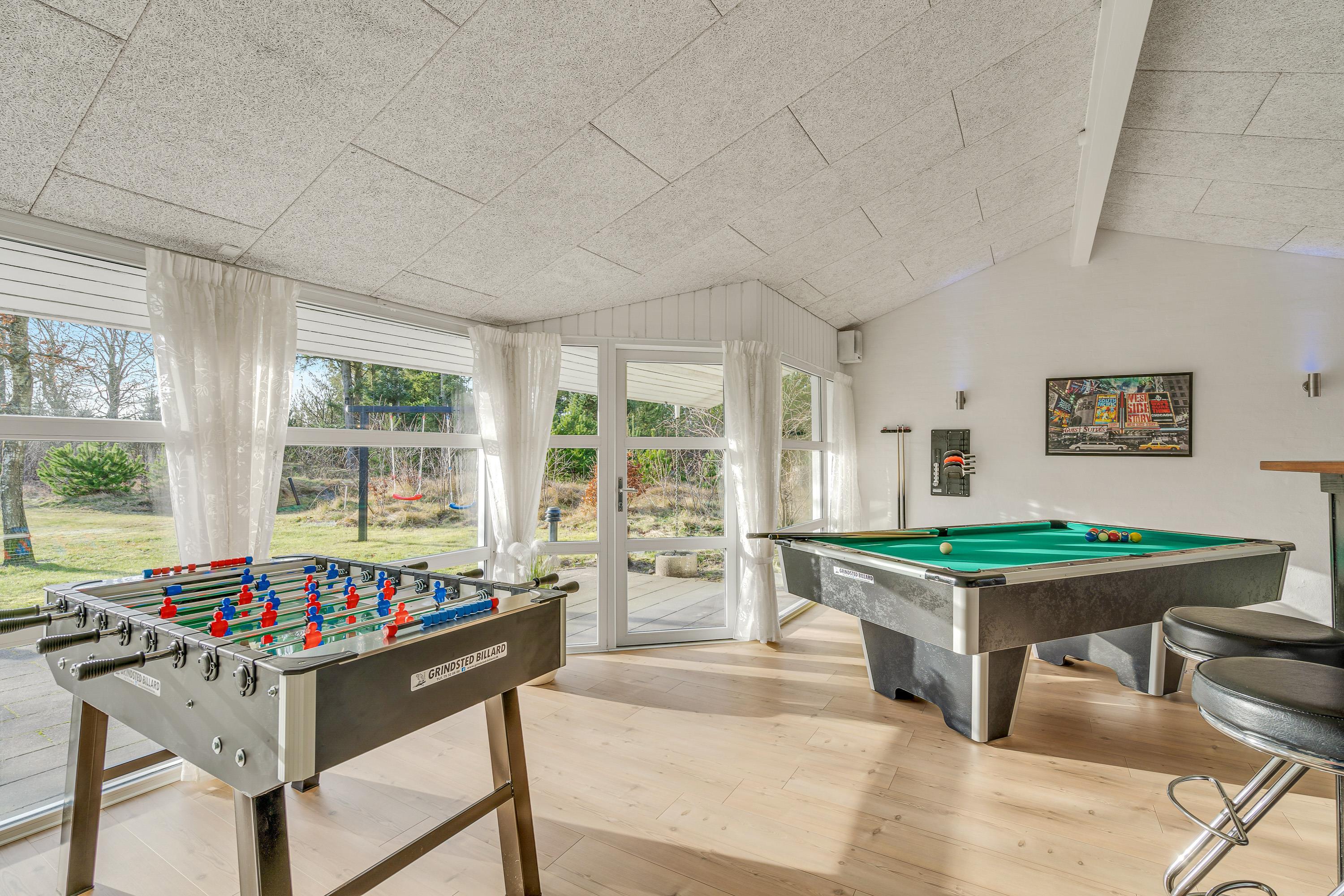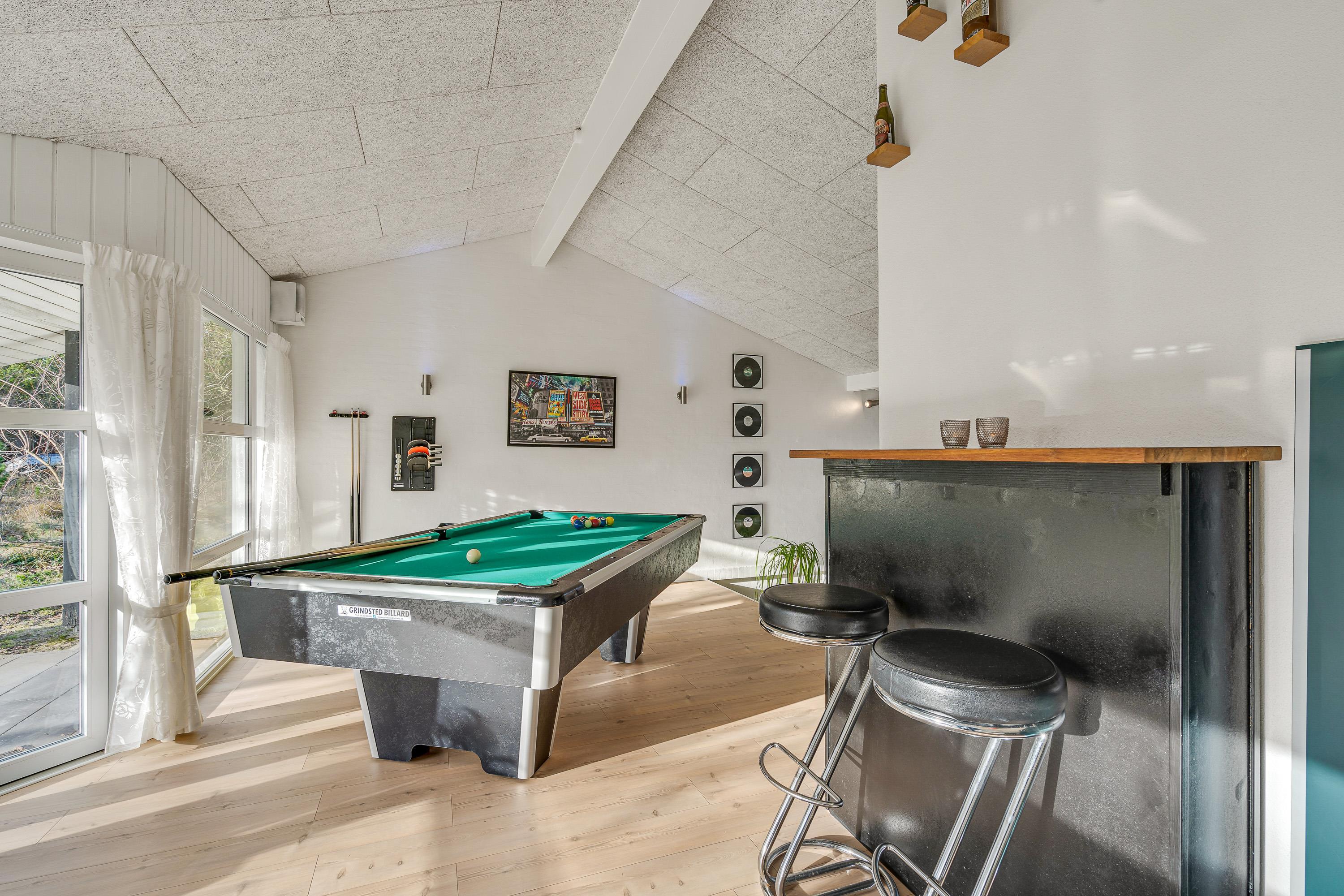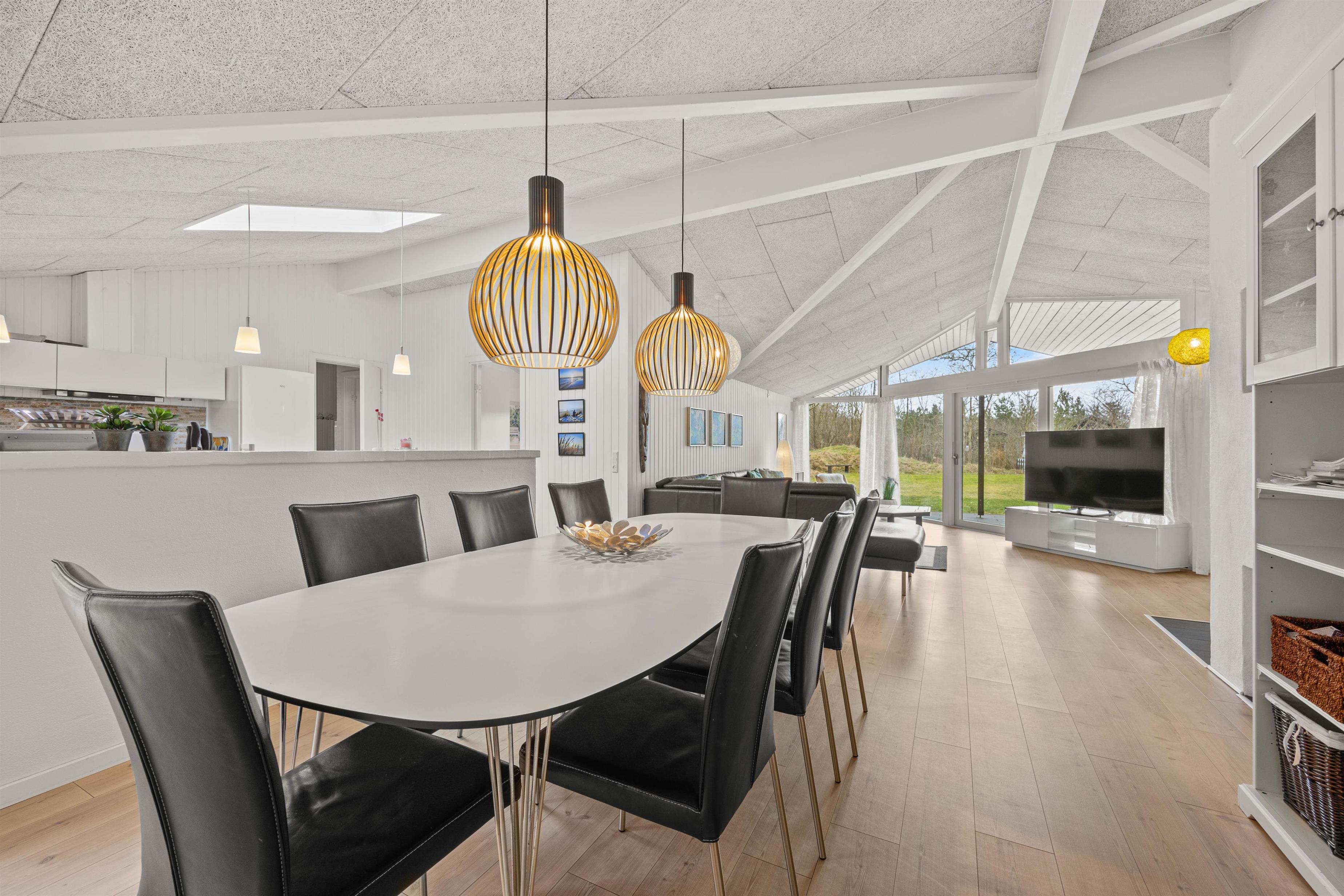 Den lyse indretning, de store vinduespartier og ovenlysvinduer giver en hel særlig stemning i sommerhuset. Lad det store veludstyrede køkken danne rammen om fælles madlavning, hyg jer sammen om spisebordet, eller i en af de fine afdelinger i stuen. Både børn og voksne vil nyde en dyst i bordfodbold, mens andre vil nyde at slappe af i en af sofaerne, med ild i brændeovnen og en god bog.