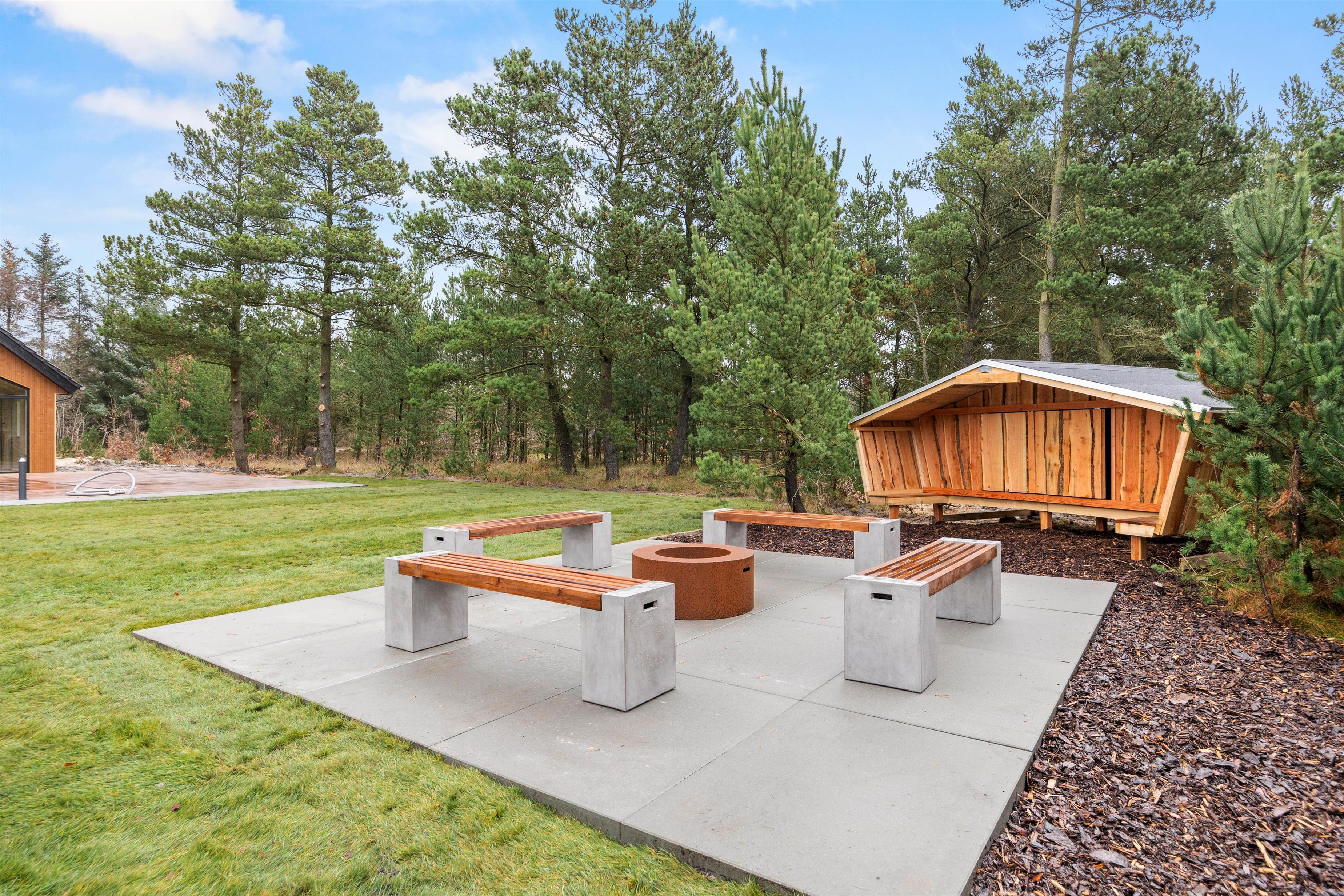 Udendørs kan I nyde den store naturgrund, hvor børnene kan lege frit og hoppe på trampolinen. Imens kan de voksne slappe af i den dejlige udespa, måske efterfulgt af en tur i den udendørs sauna. I sommerhalvåret – fra april til november – kan I også benytte den udendørs bruser, som giver jer en forfriskende pause under åben himmel.