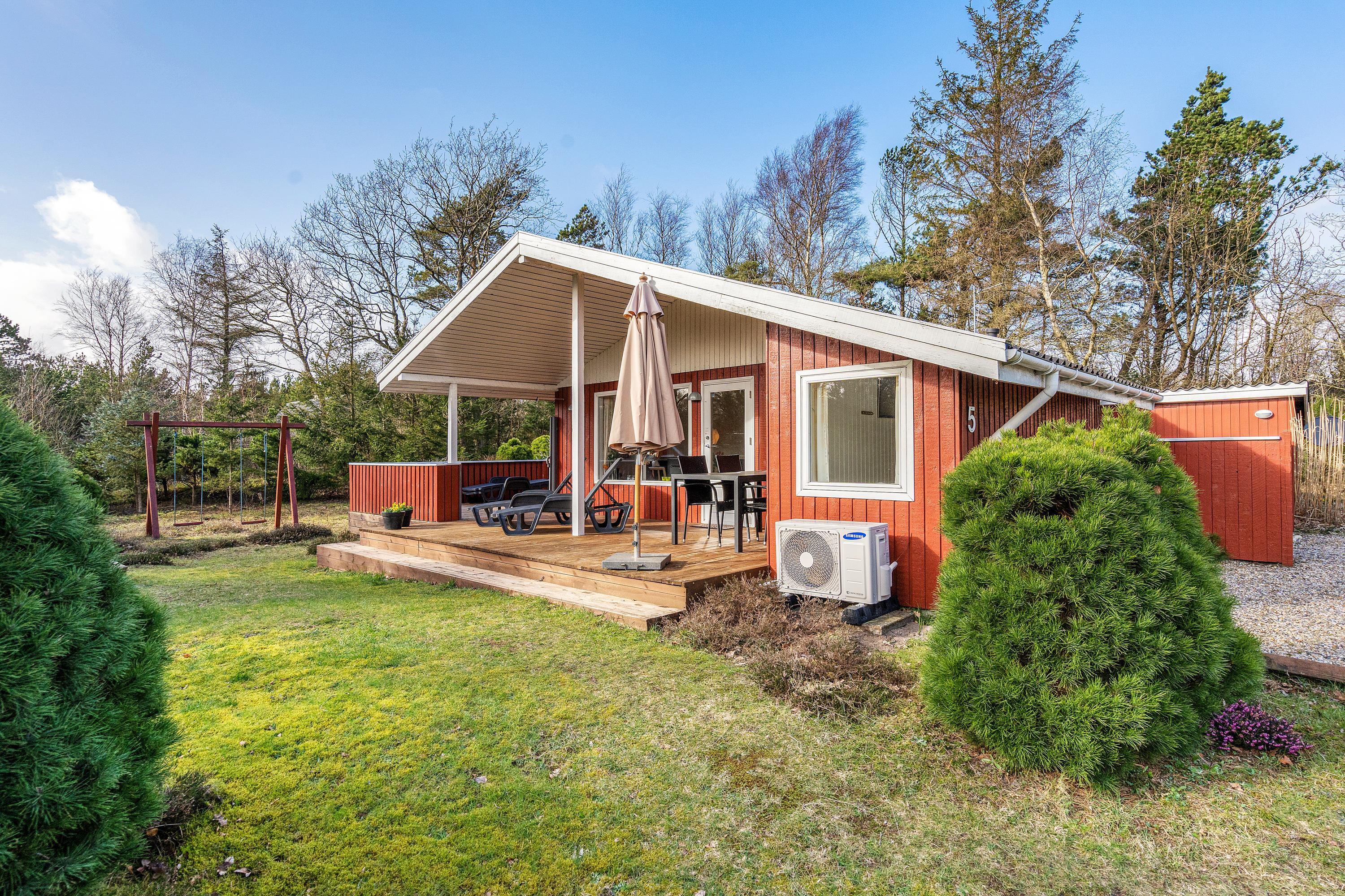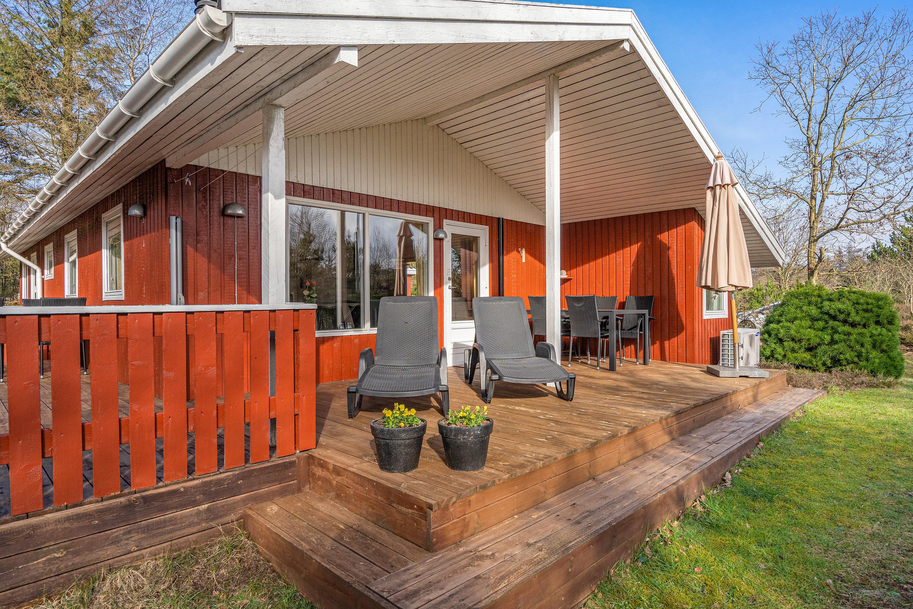 Der er flere terrasser rundt om sommerhuset, og med både en afskærmet, overdækket og åben del er der noget for enhver smag. På de varme sommerdage kan I slænge jer i liggestolene eller flytte frokosten med ud i solen.