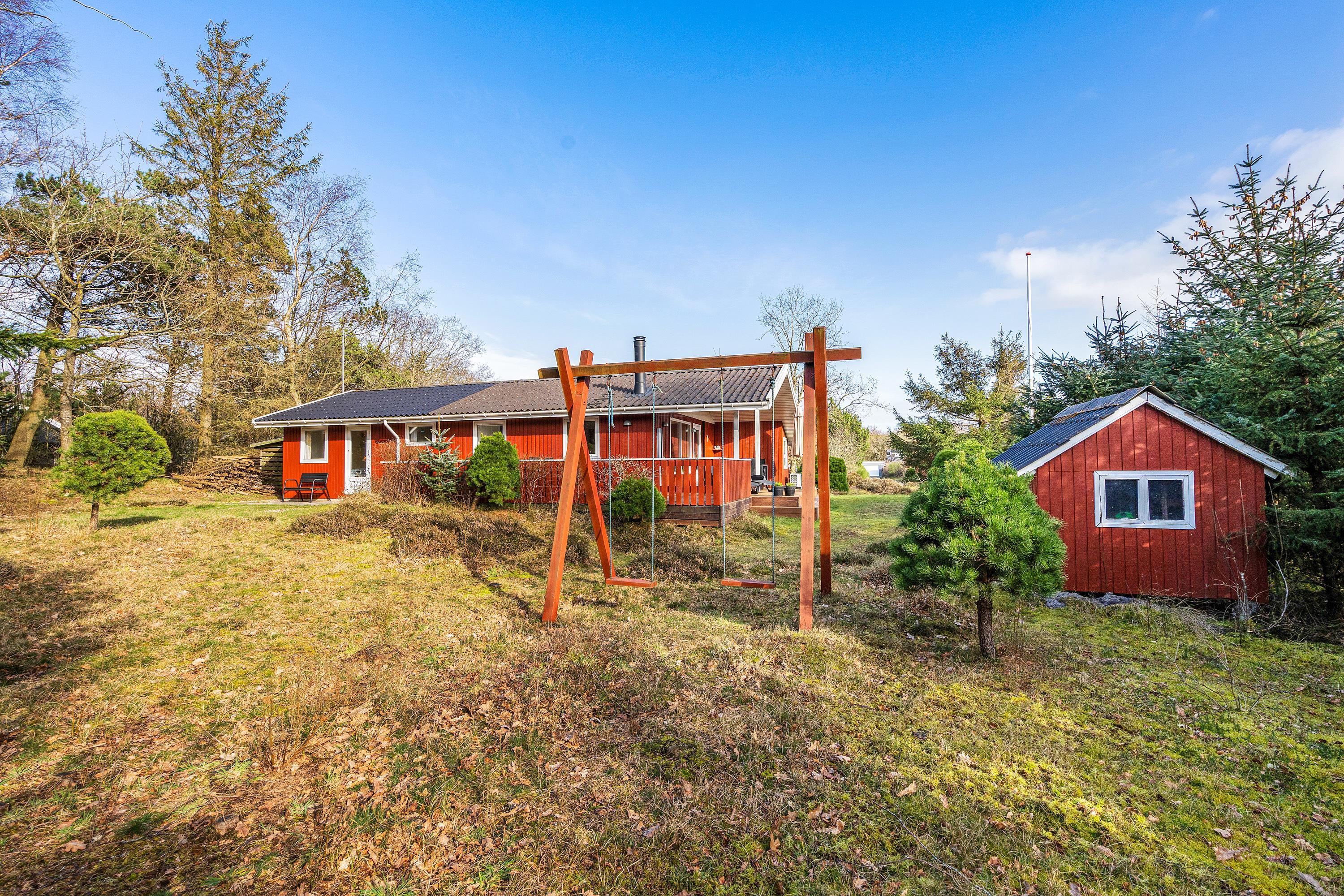 Både børnene og hunden vil elske at gå på opdagelse og udforske den spændende naturgrund. Der er også gyngestativ, sandkasse og legehus på grunden.