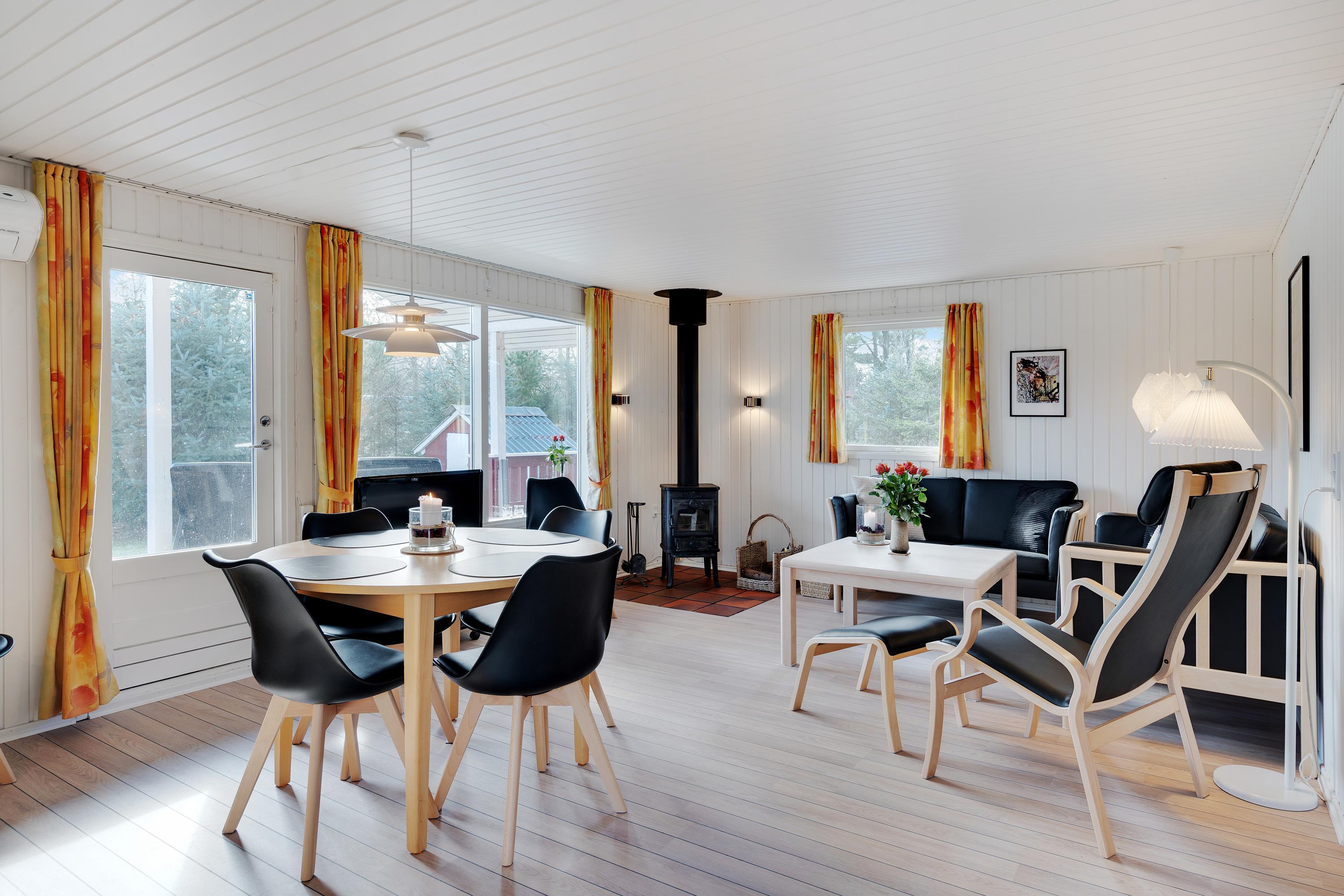Feriehusets hjerte er opholdsrummet med både stue og integreret køkkenalrum. Her kan I rigtig sætte samværet i fokus med gode middage, hyggelige spilaftener og afslapning på sofaen. Når mørket falder på, eller regnen trommer på ruden på en grå efterårsdag, sørger brændeovnen for både varme og hyggelig feriestemning.
