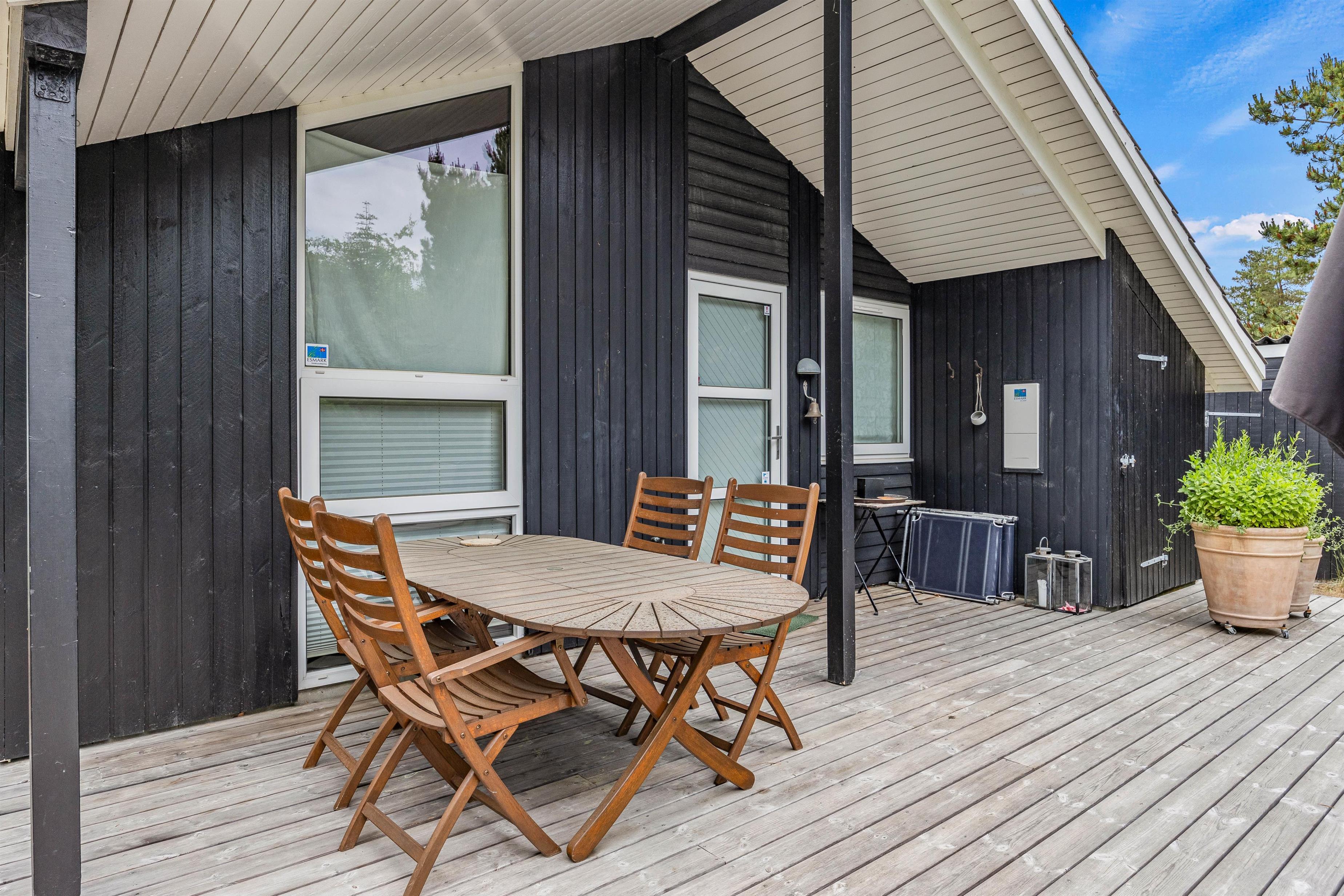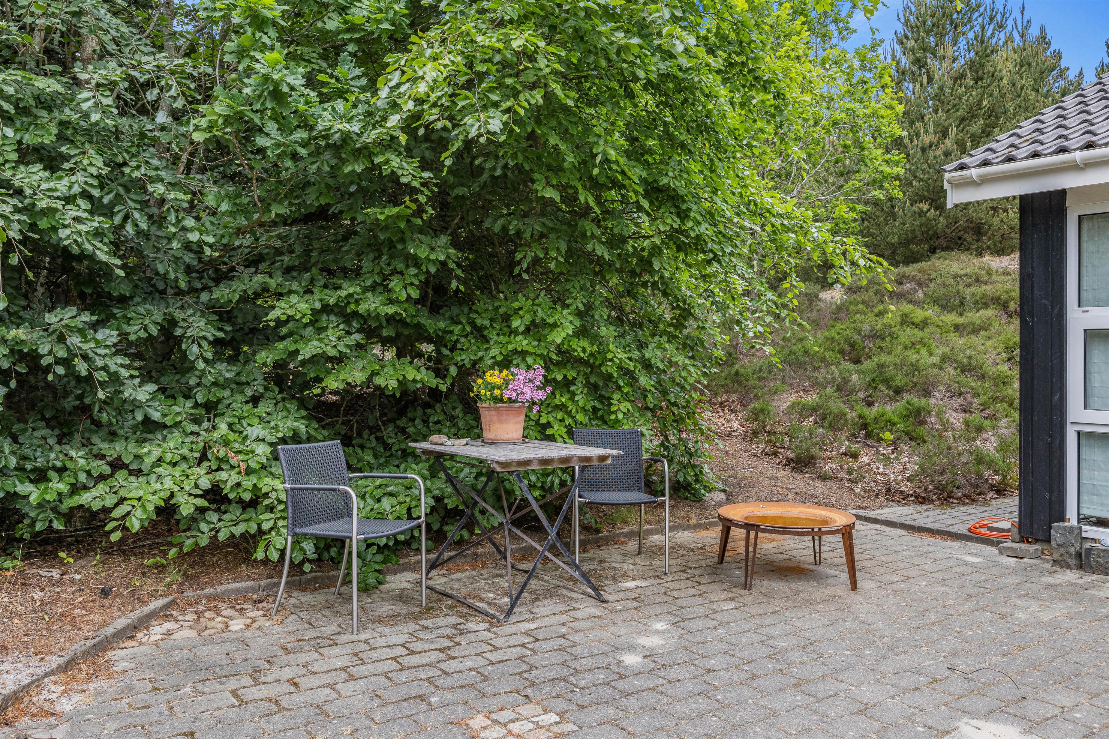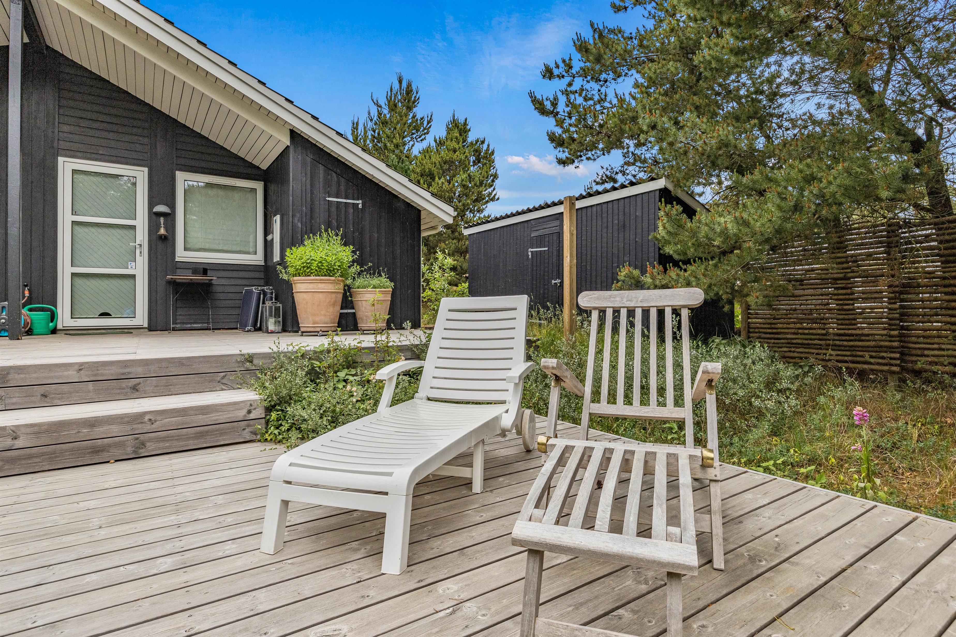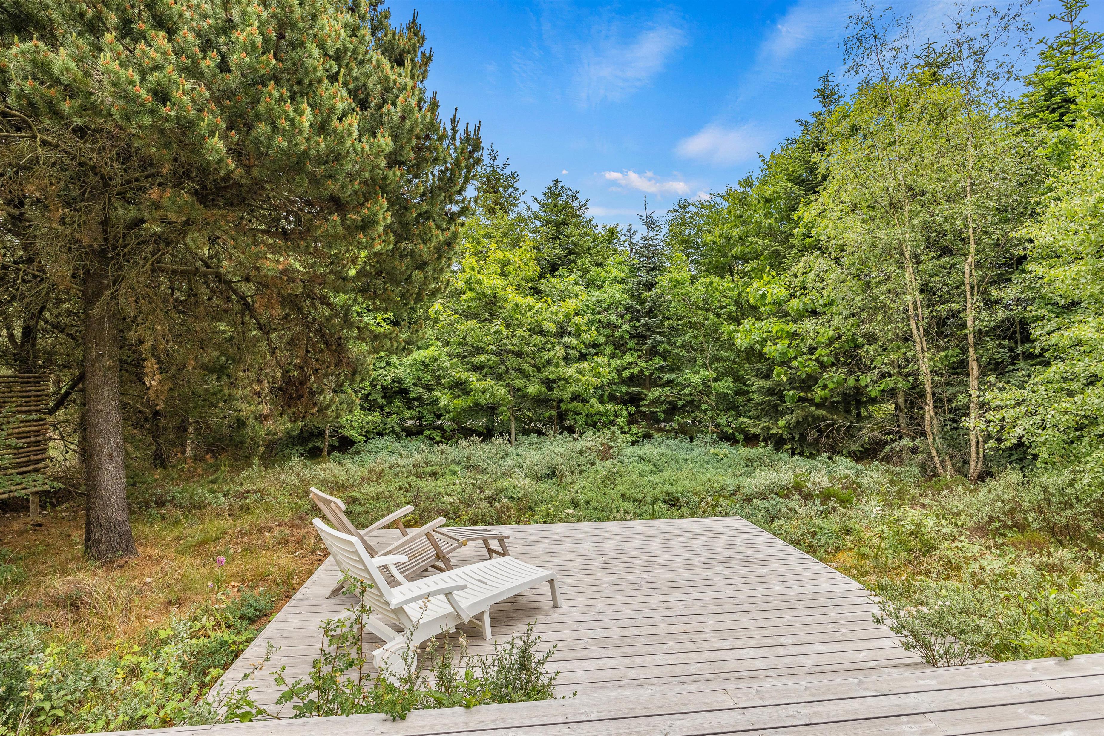 Den store naturgrund er godt afskærmet af træer og buske, og her kan I ugeneret nyde stille feriedage på feriehusets grund og terrasser. I kan træde ud på den store flisebelagte sydvendte terrasse direkte fra feriehusets stue. Her, samt på feriehusets flotte og delvis overdækkede træterrasse, står gode havemøbler og solvogne til rådighed, så terrasserne kan nydes både dag og aften, for når aftenens måltid skal tilberedes, kan I blot benytte feriehusets grill.