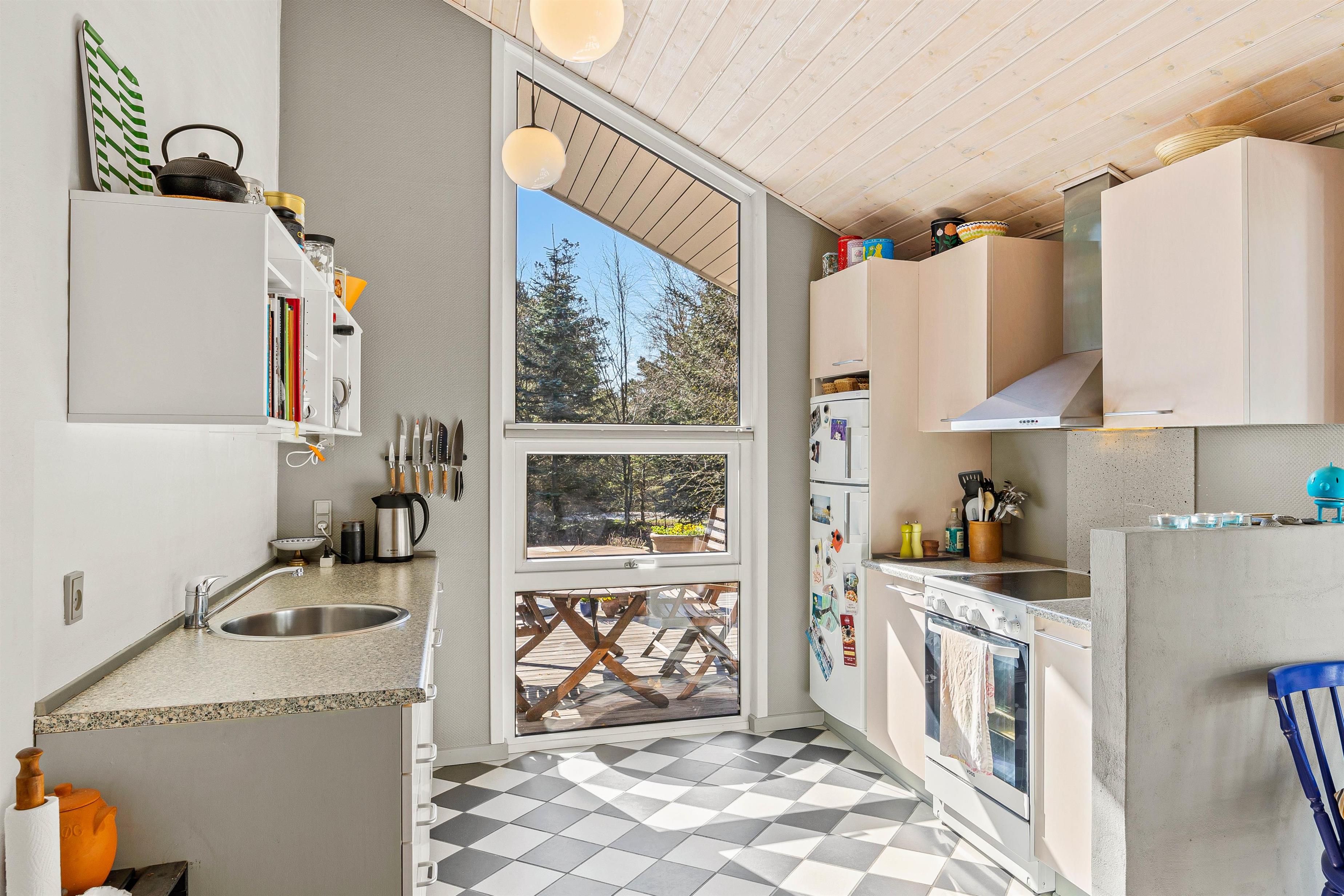 Her møder I et lyst, rummeligt og velmøbleret feriehus: Her er der loft til kip, og med dejlige lysindfald fra de mange vinduer, er der ikke andet at gøre end at kigge ud i naturen og slappe af. Køkkenet, som ligger i forlængelsen af spisestuen, er veludstyret og opvaske- samt vaskemaskinen i entreen kan være jer behjælpelige med de praktiske opgaver, så der er endnu mere tid til at holde ferie.