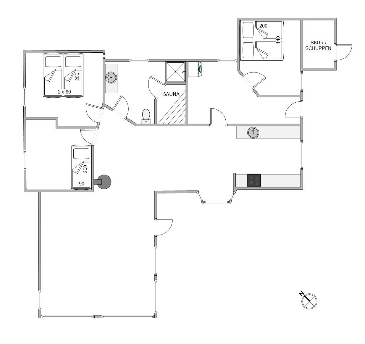 Det 98 m² store feriehus har 3 rummelige soveværelser. 2 af værelserne er indrettet med dobbeltsenge, det tredje soveværelse har 1 enkeltseng.
