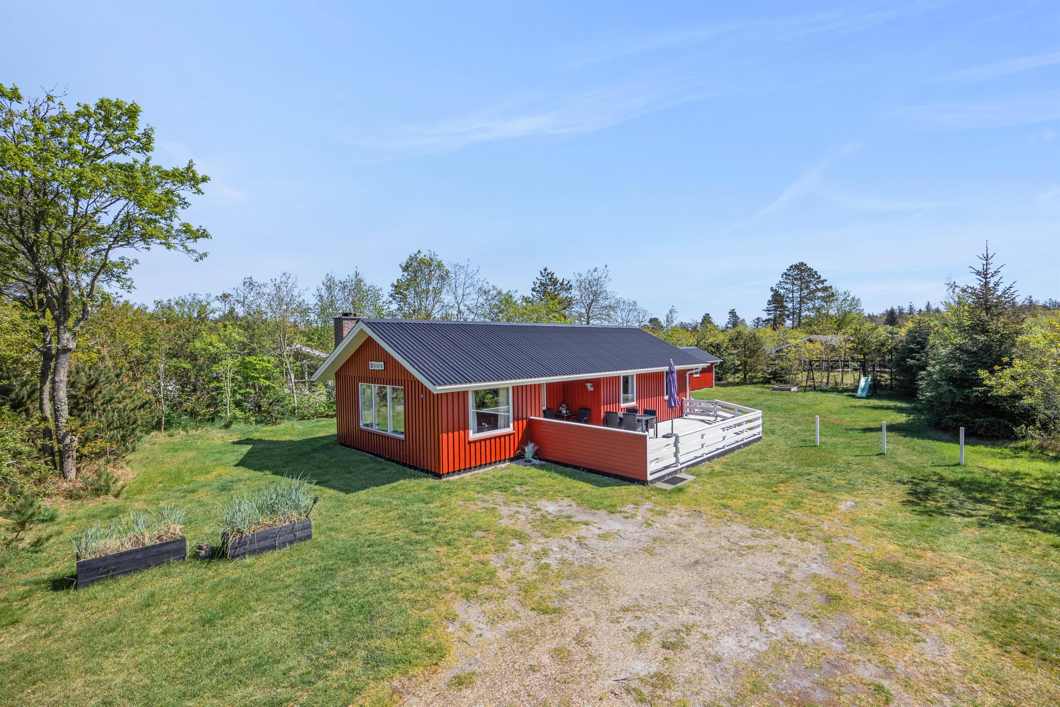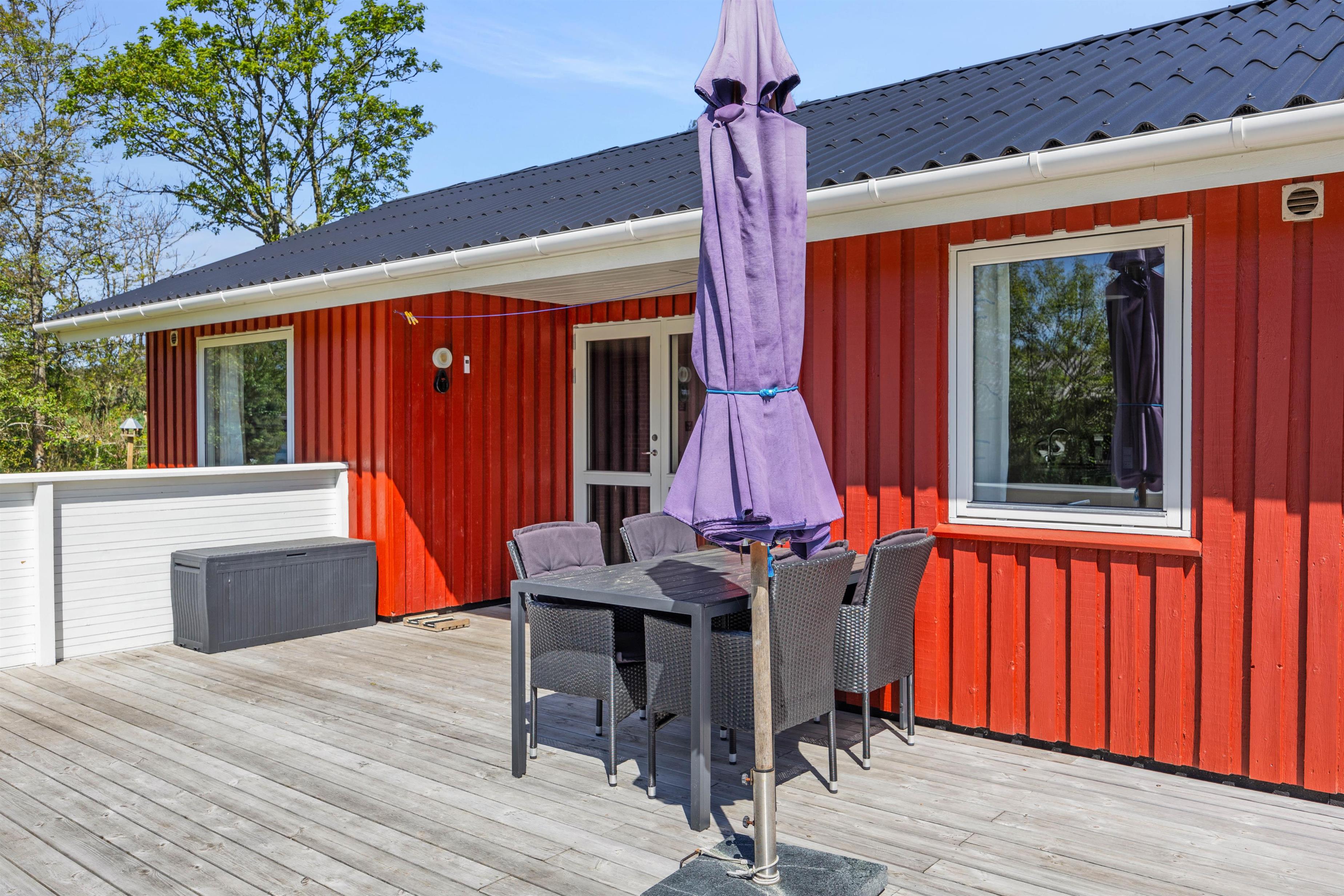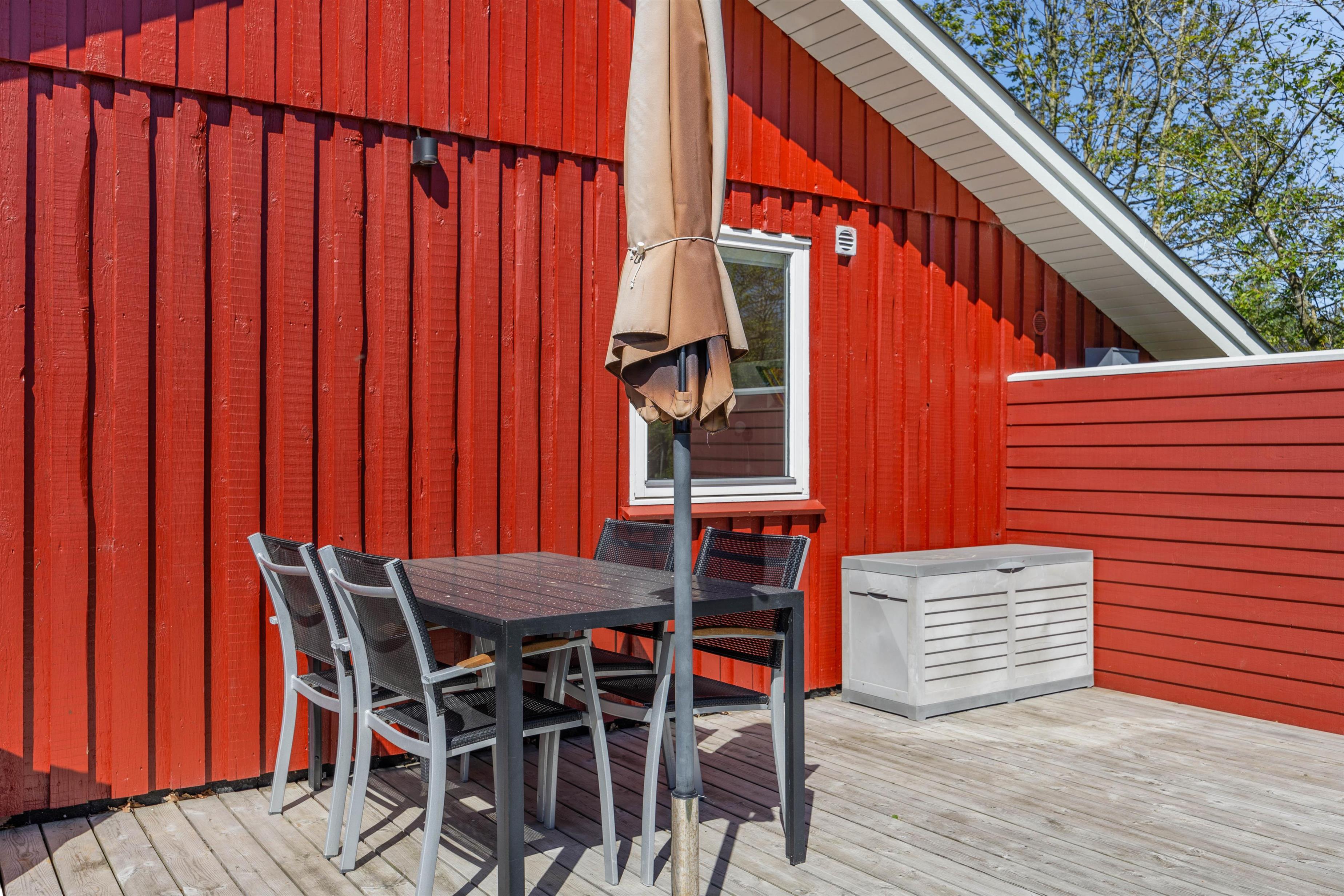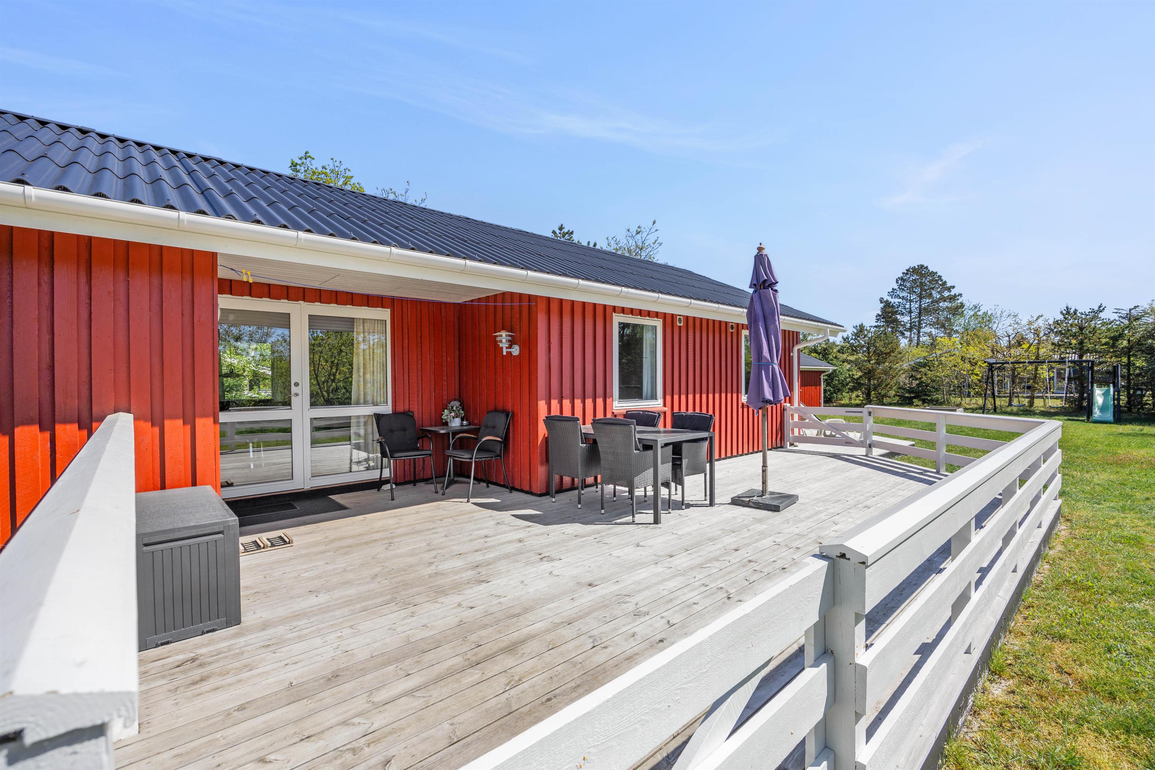 Et højdepunkt ved feriehuset er den terrassen, der selvfølgelig skal nydes på de lune sommerdage. Havemøblerne står klar! En del af træterrassen er lukket, hvilket er helt perfekt for både hundeejeren såvel som småbørnsfamilien. Til familiens mindste er her også sandkasse, gynger og ikke mindst den grønne græsplæne, der indbyder til timevis af leg og bold.