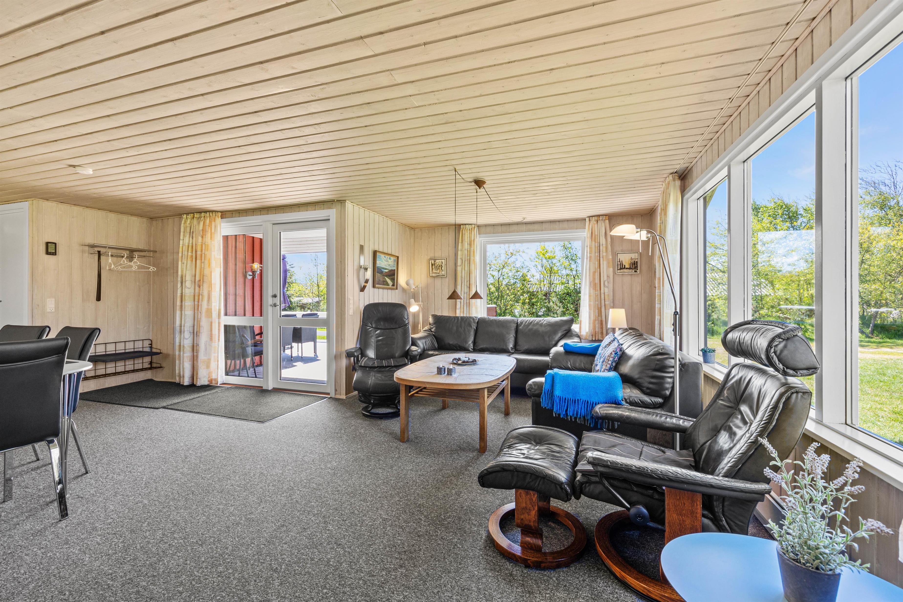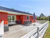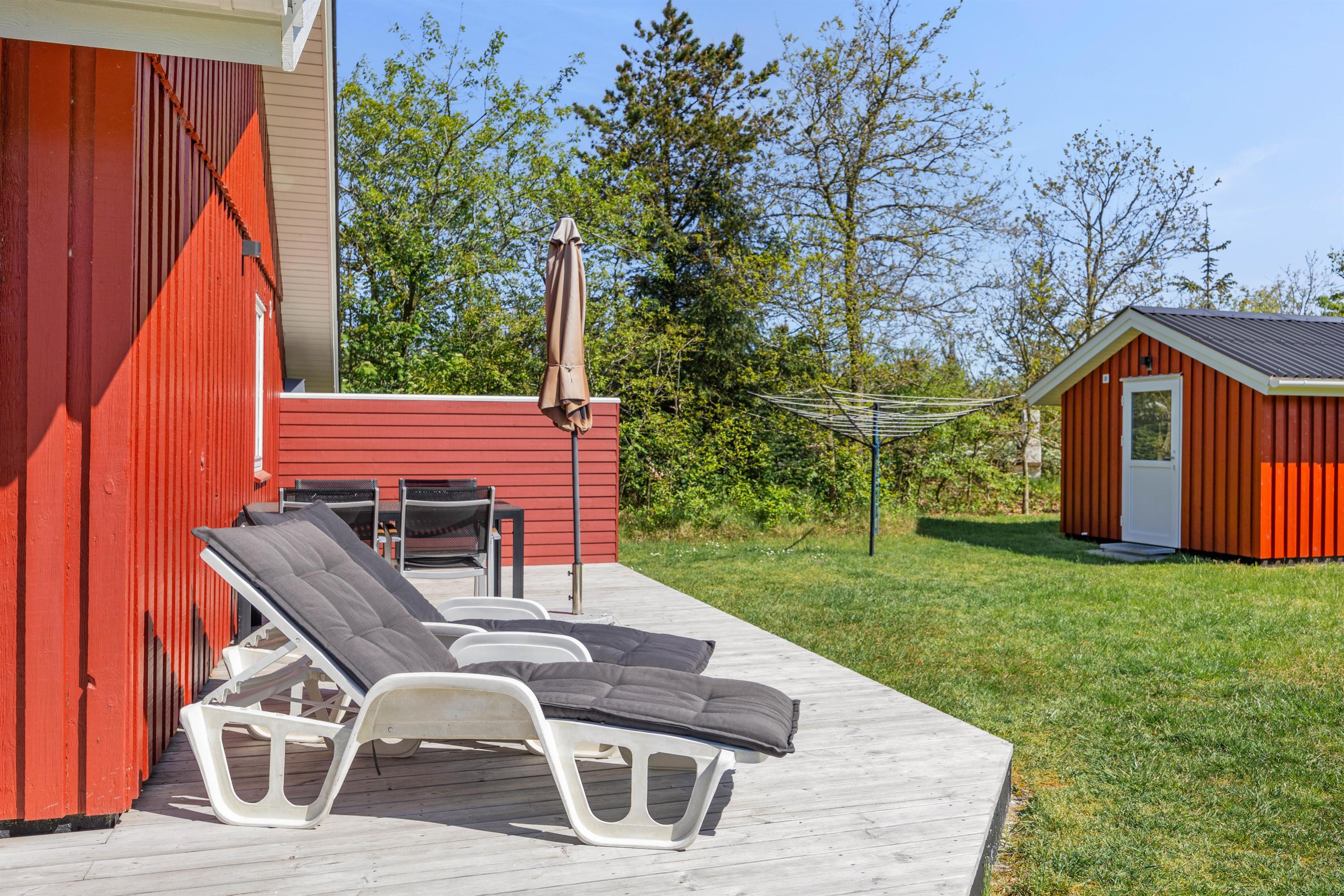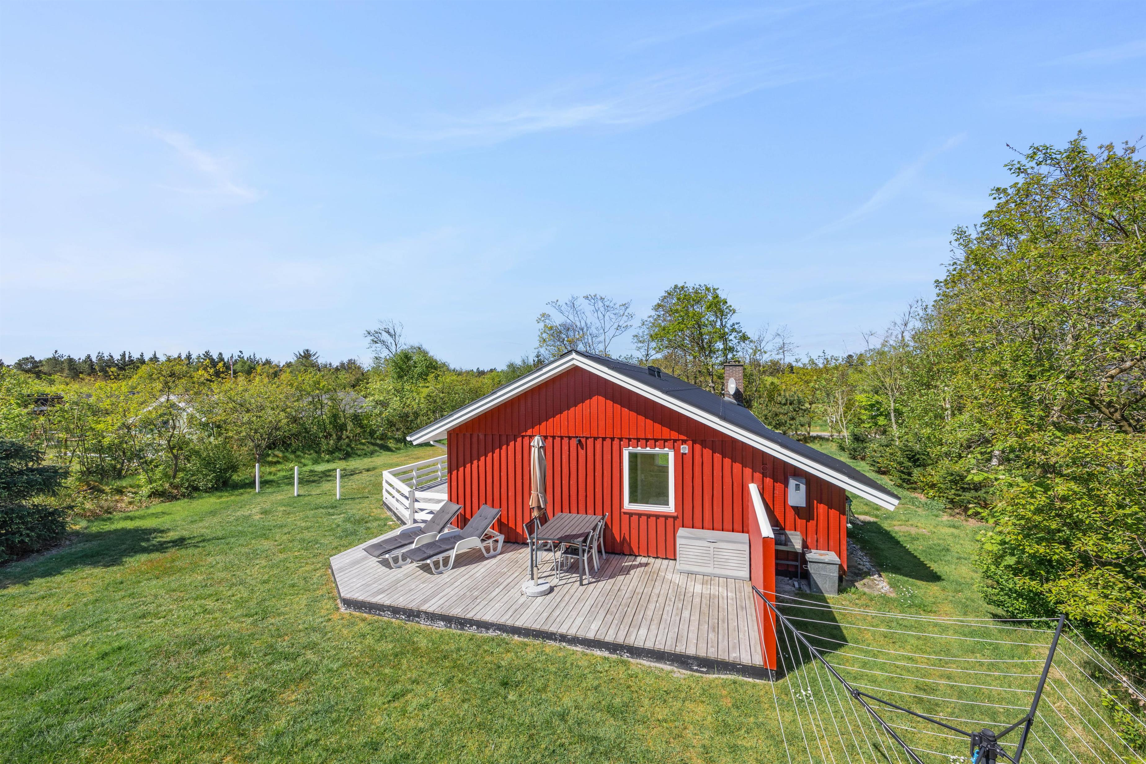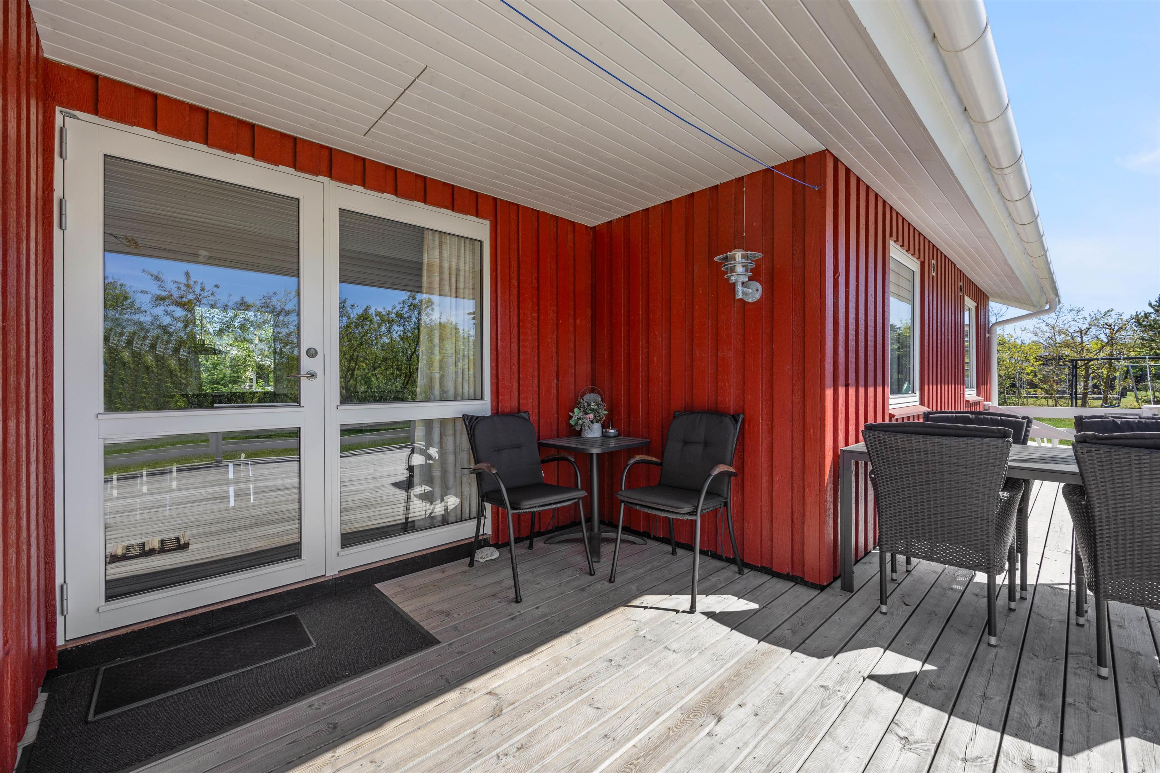 Et højdepunkt ved feriehuset er den terrassen, der selvfølgelig skal nydes på de lune sommerdage. Havemøblerne står klar! En del af træterrassen er lukket, hvilket er helt perfekt for både hundeejeren såvel som småbørnsfamilien. Til familiens mindste er her også sandkasse, gynger og ikke mindst den grønne græsplæne, der indbyder til timevis af leg og bold.