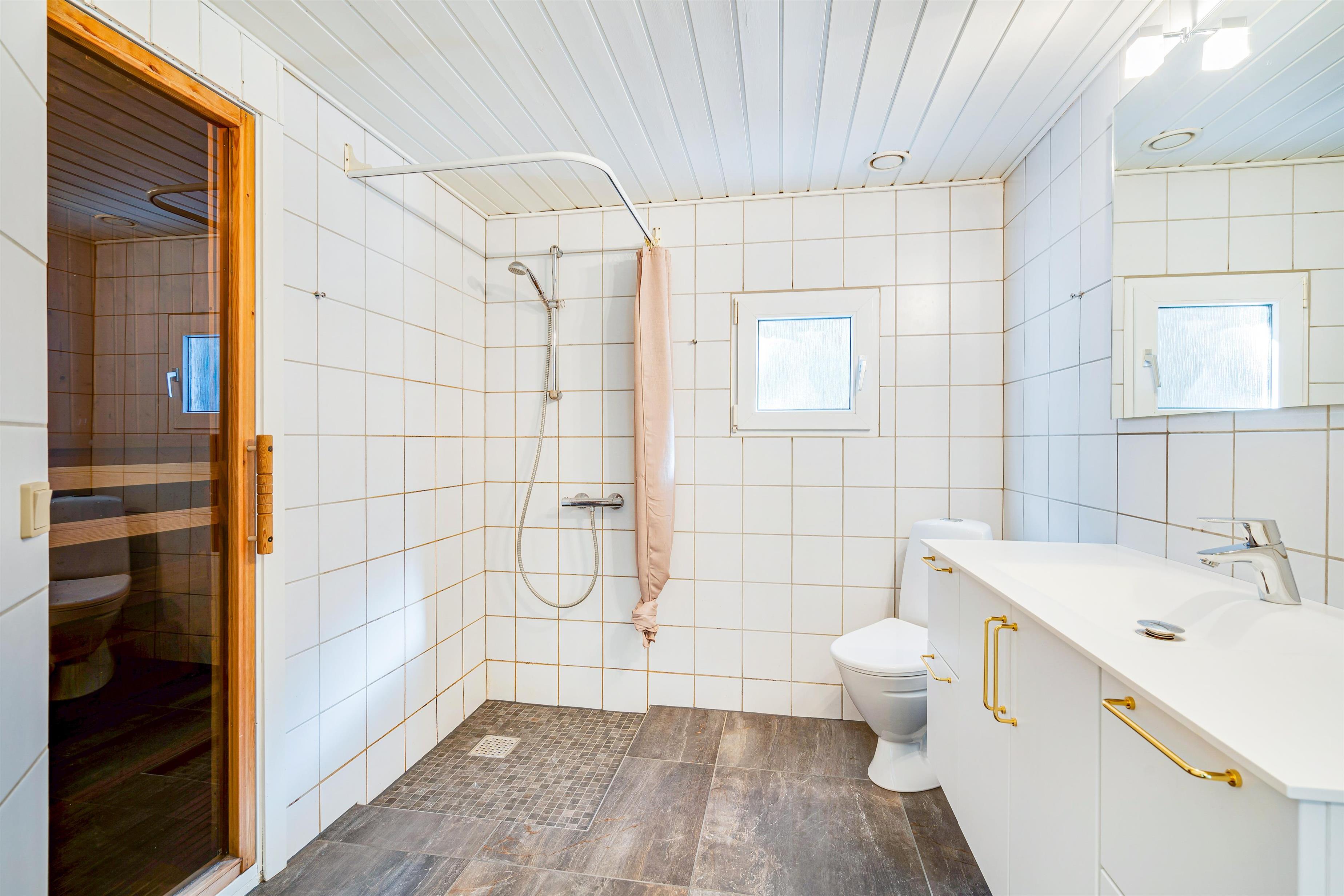 Huset har 2 badeværelser, hvoraf det ene indeholder en dejlig sauna. Her kan I varme jer efter en skøn tur ude ved stranden eller i Blåbjer Plantage, der ikke ligger langt fra dette feriehus.