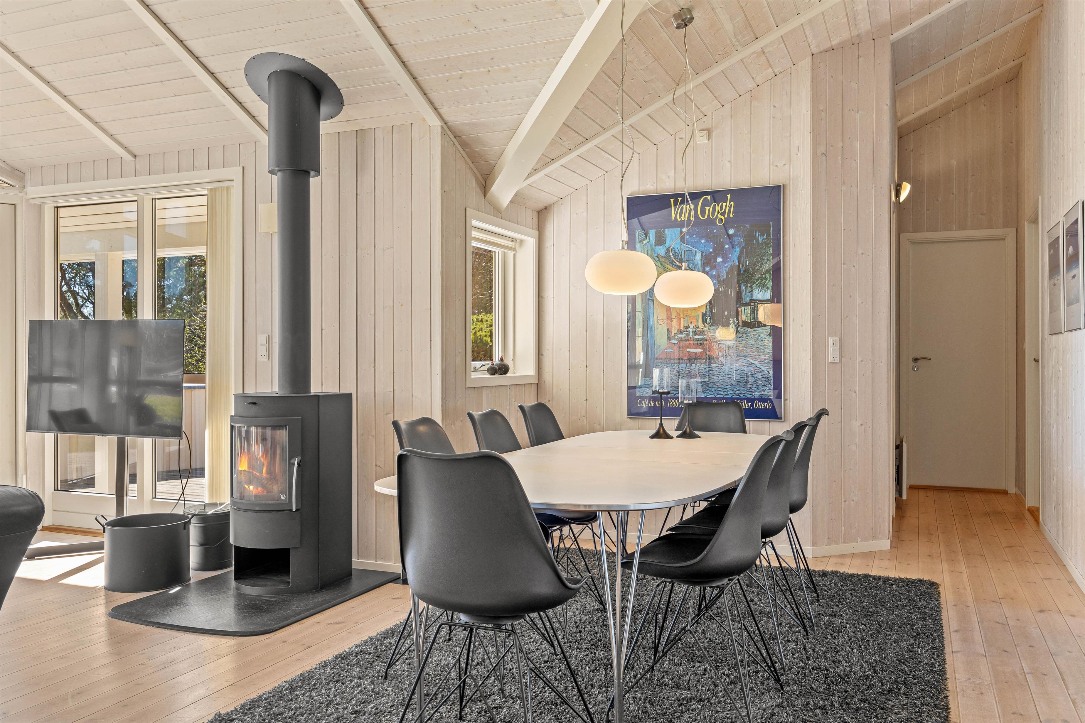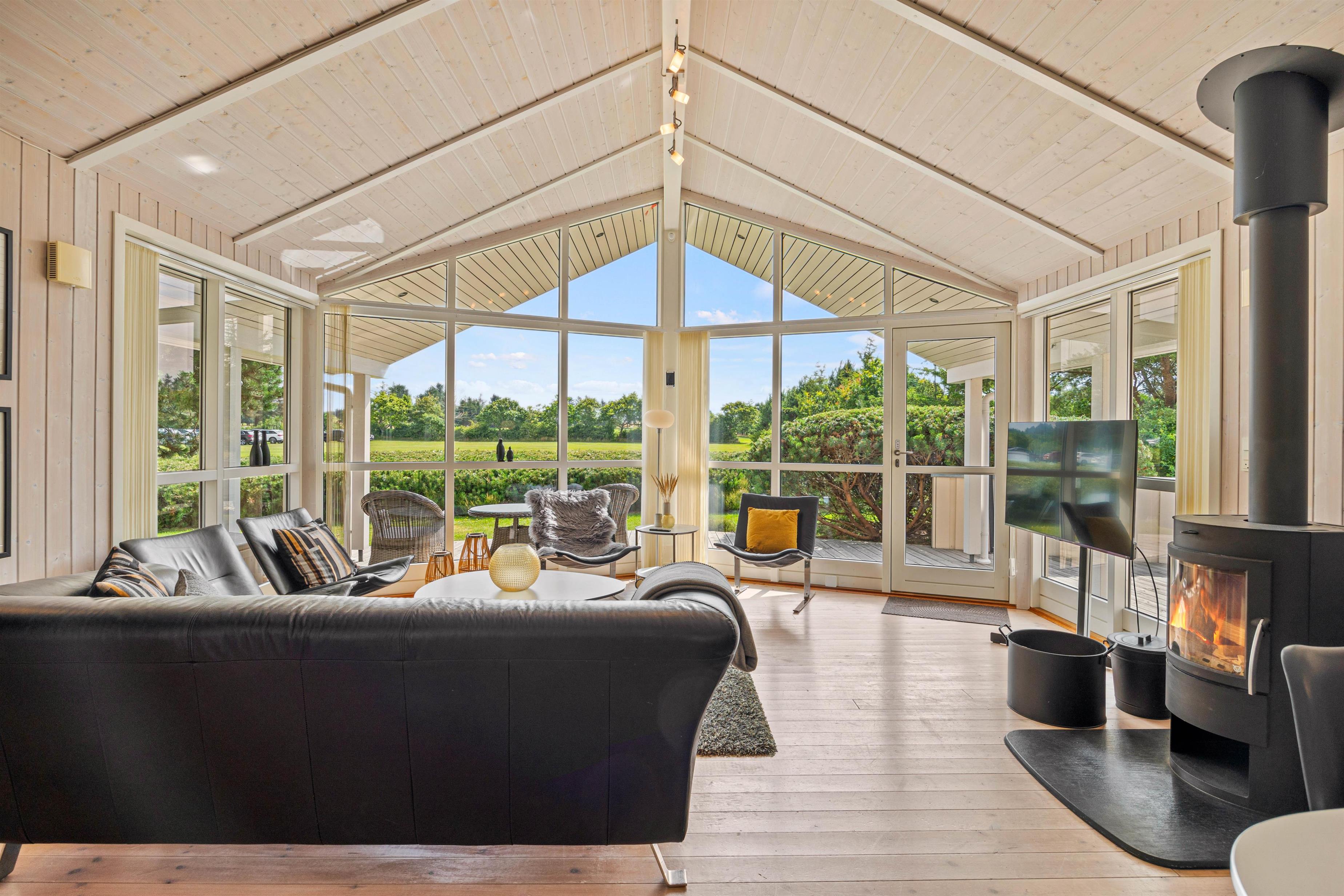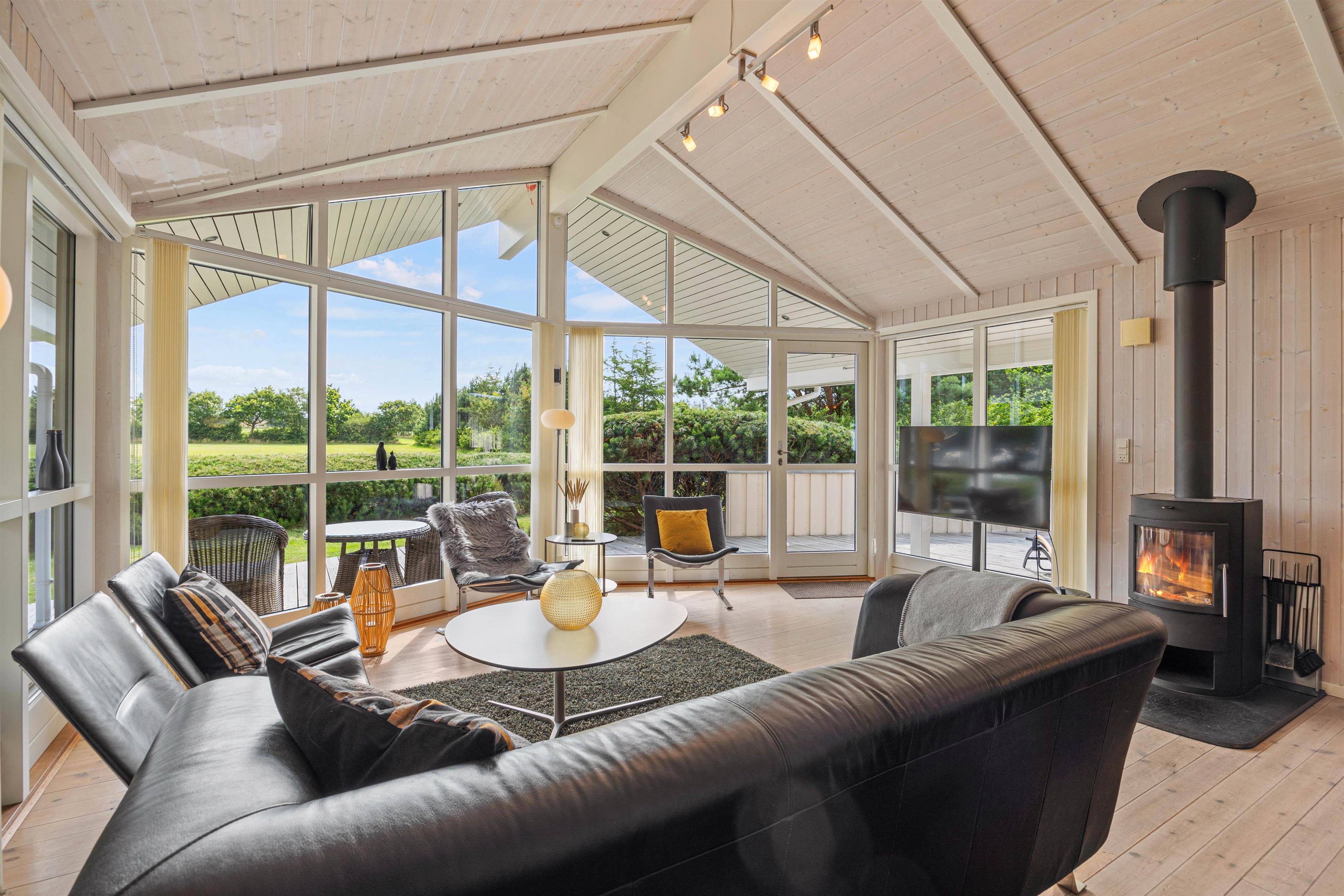 Sommerhusets smagsfulde og hjemlige indretning, de lyse farver på vægge og højde til loftet gør at sommerhuset føles ekstra rummeligt. Opholdsrummet er sommerhusets hjerte og danner rammen for hygge og samvær. Brændeovnen skaber en hyggelig atmosfære på kølige aftener, mens den energibesparende varmepumpe sikrer, at indeklimaet er behageligt året rundt. De store vinduespartie giver et skønt lysindfald til rummet.