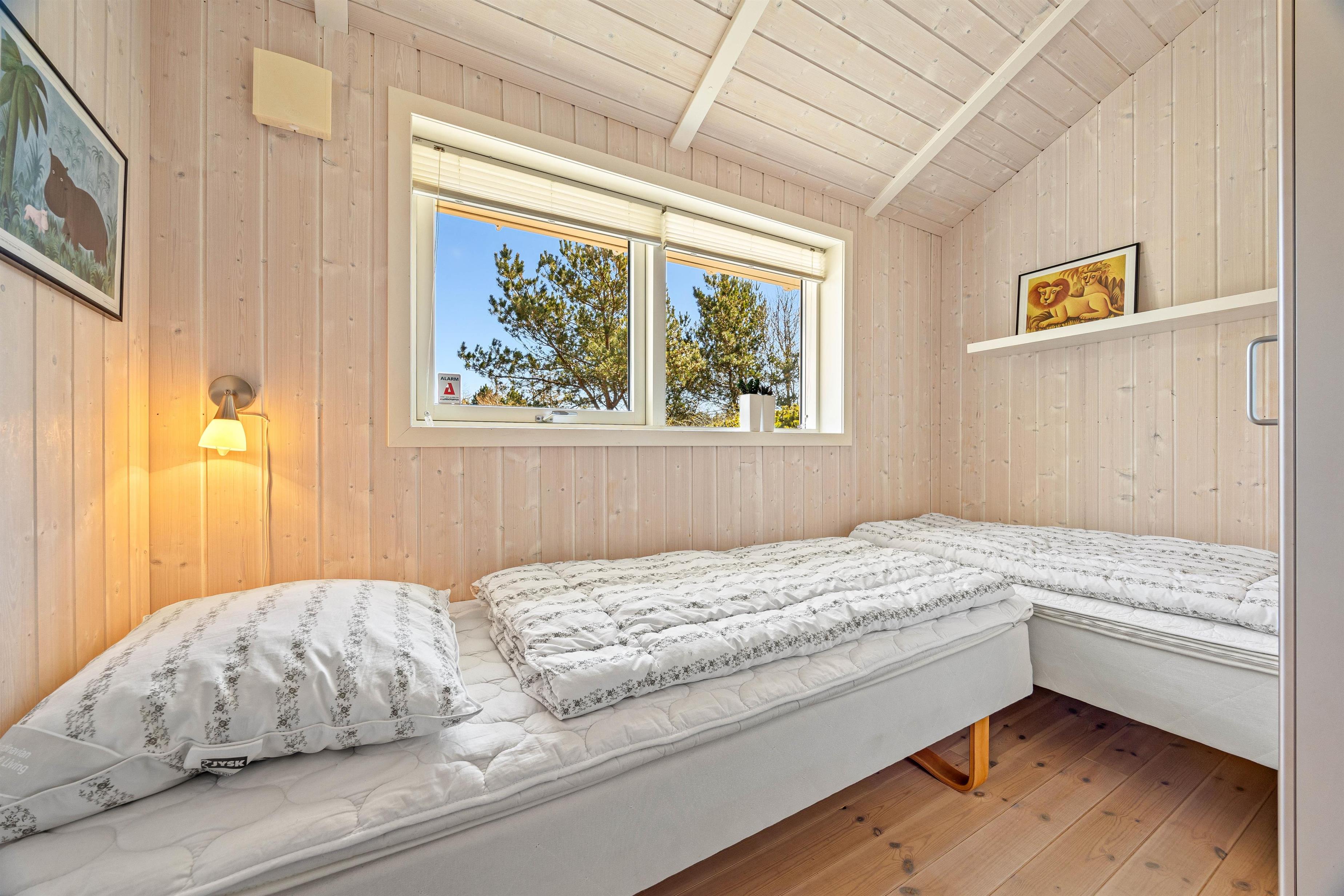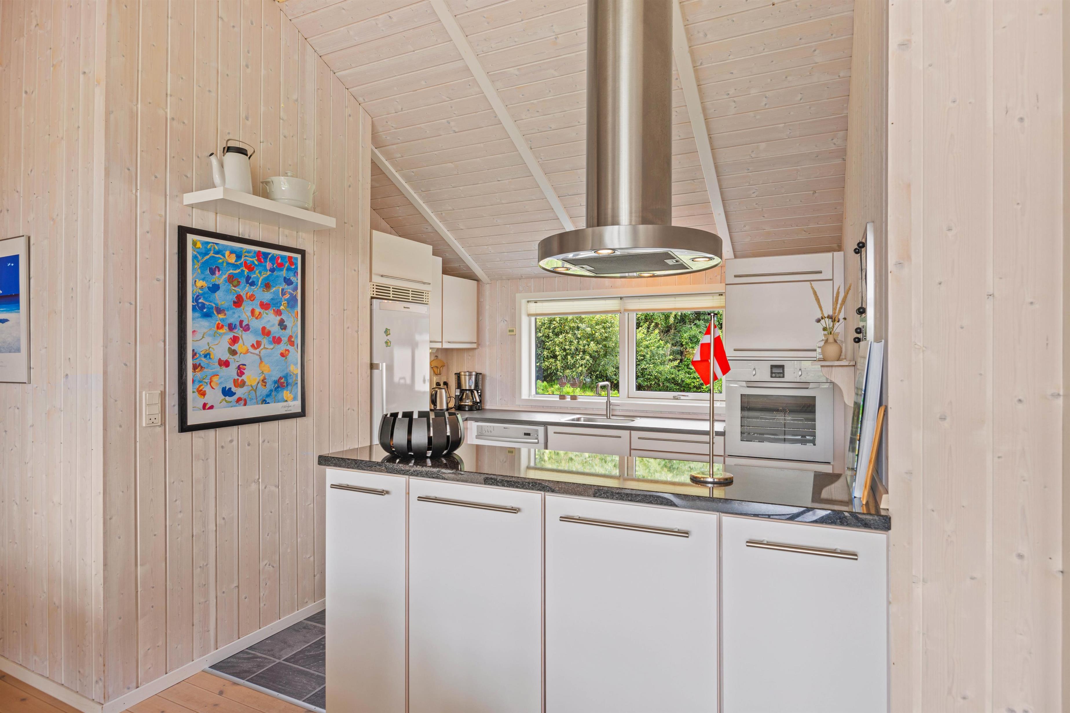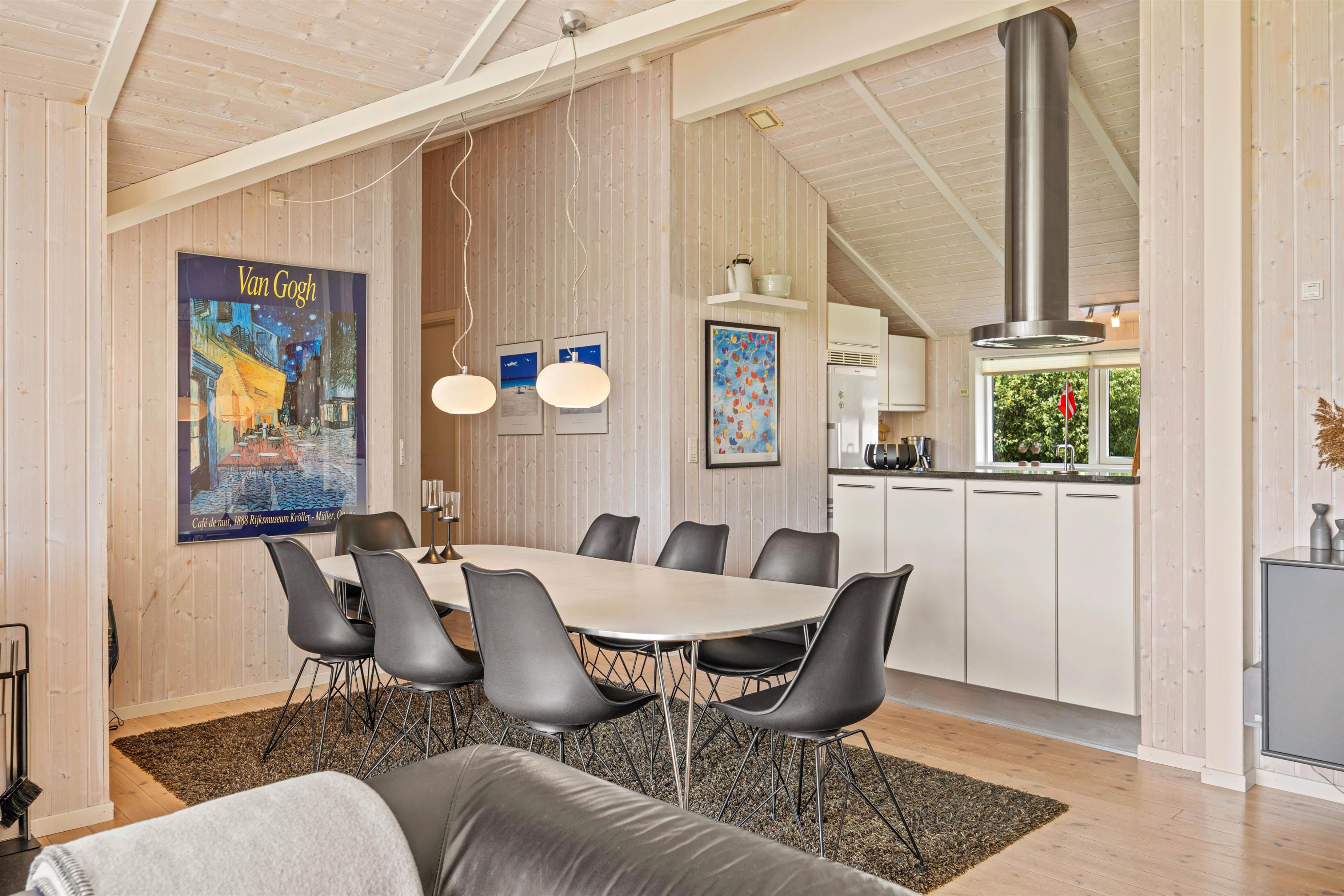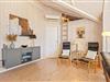 Sommerhusets smagsfulde og hjemlige indretning, de lyse farver på vægge og højde til loftet gør at sommerhuset føles ekstra rummeligt. Opholdsrummet er sommerhusets hjerte og danner rammen for hygge og samvær. Brændeovnen skaber en hyggelig atmosfære på kølige aftener, mens den energibesparende varmepumpe sikrer, at indeklimaet er behageligt året rundt. De store vinduespartie giver et skønt lysindfald til rummet.