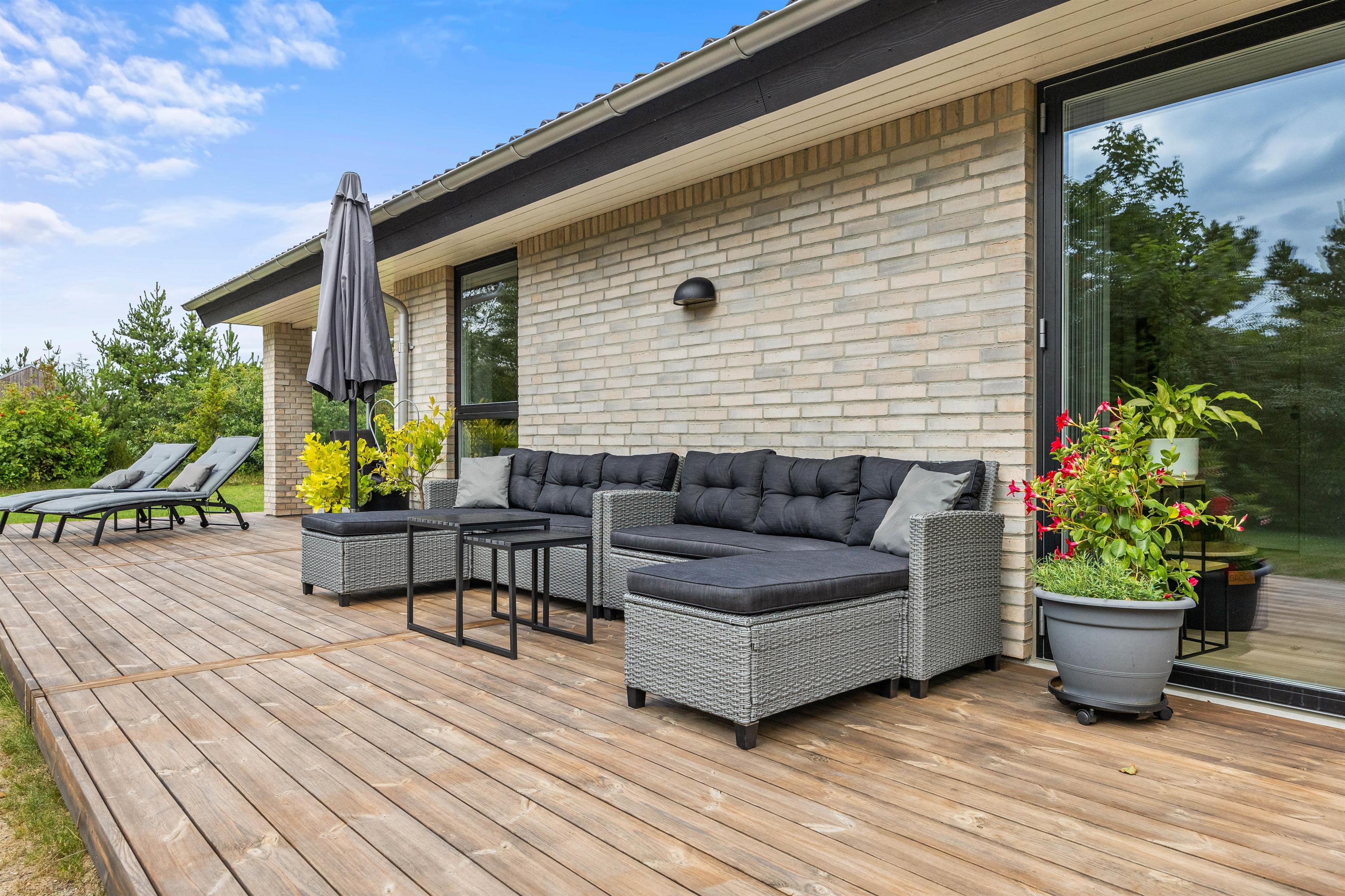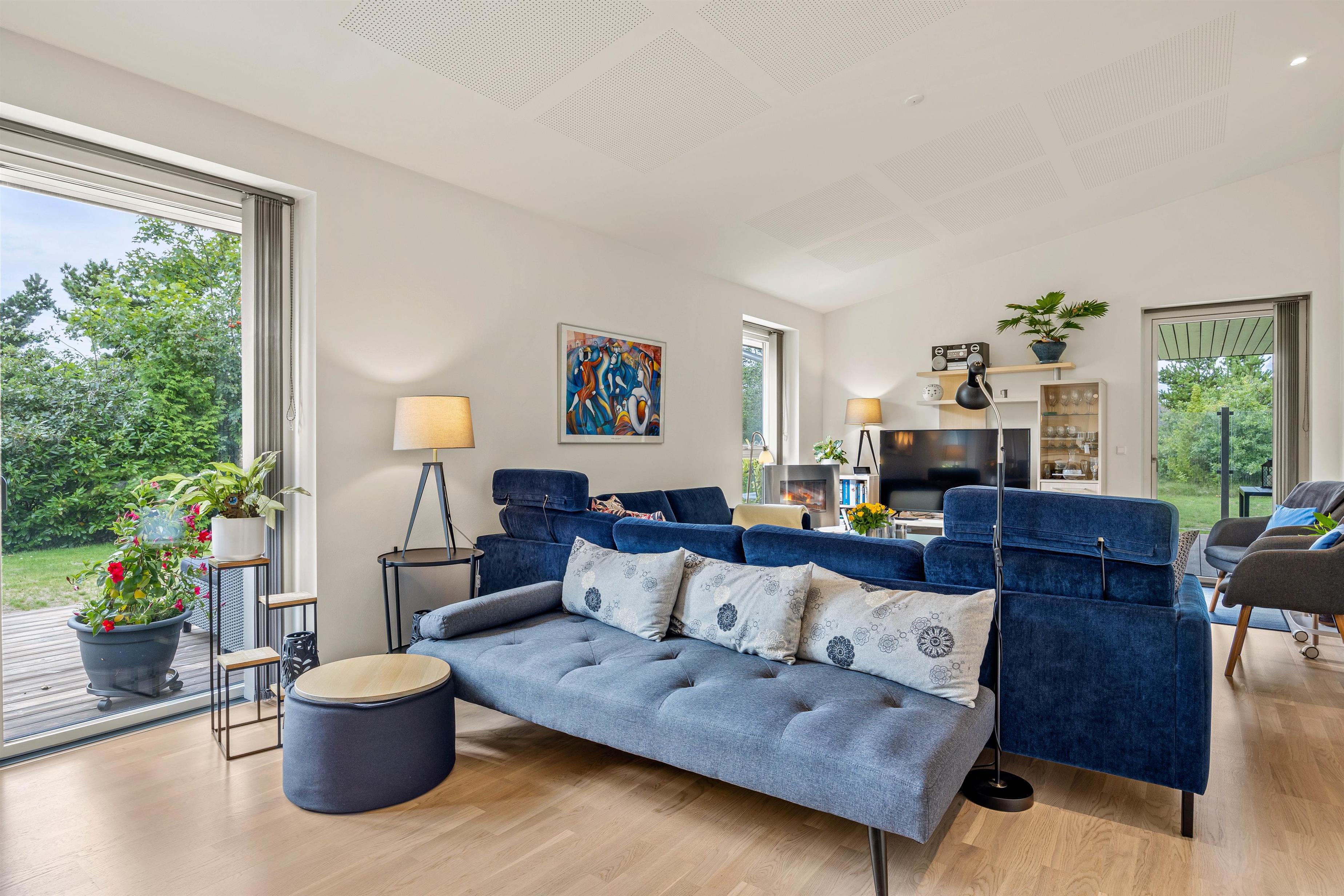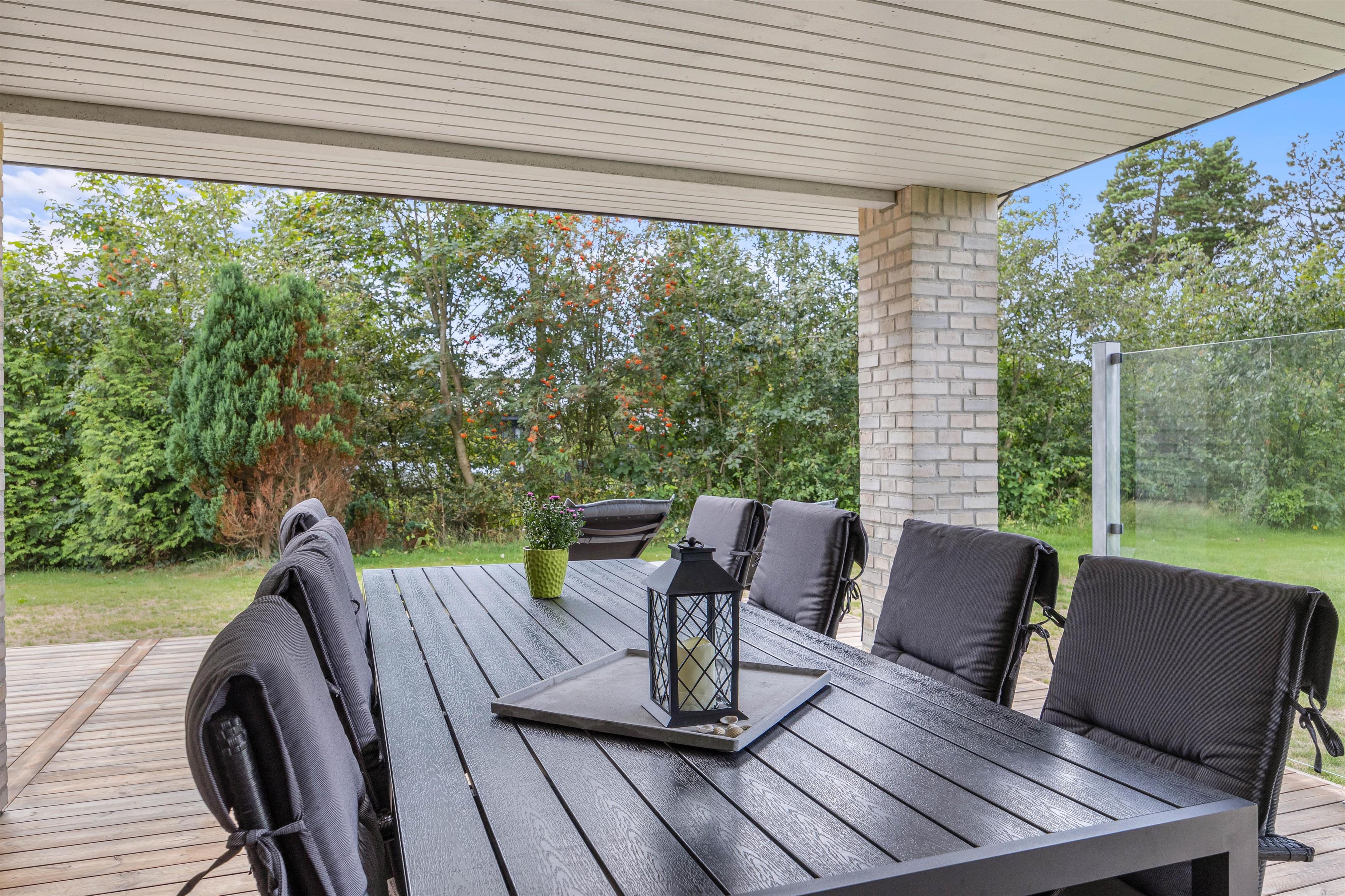 Den store plænegrund har både solvogne og havemøbler, som I kan stille til rette på den 70 kvadratmeter åbne terrasse. Hvis I foretrækker skyggen, er der også 20 kvadratmeter overdækket terrasse. Om aftenen kan I sidde her med gasgrillen, uanset om det skulle smådryppe.