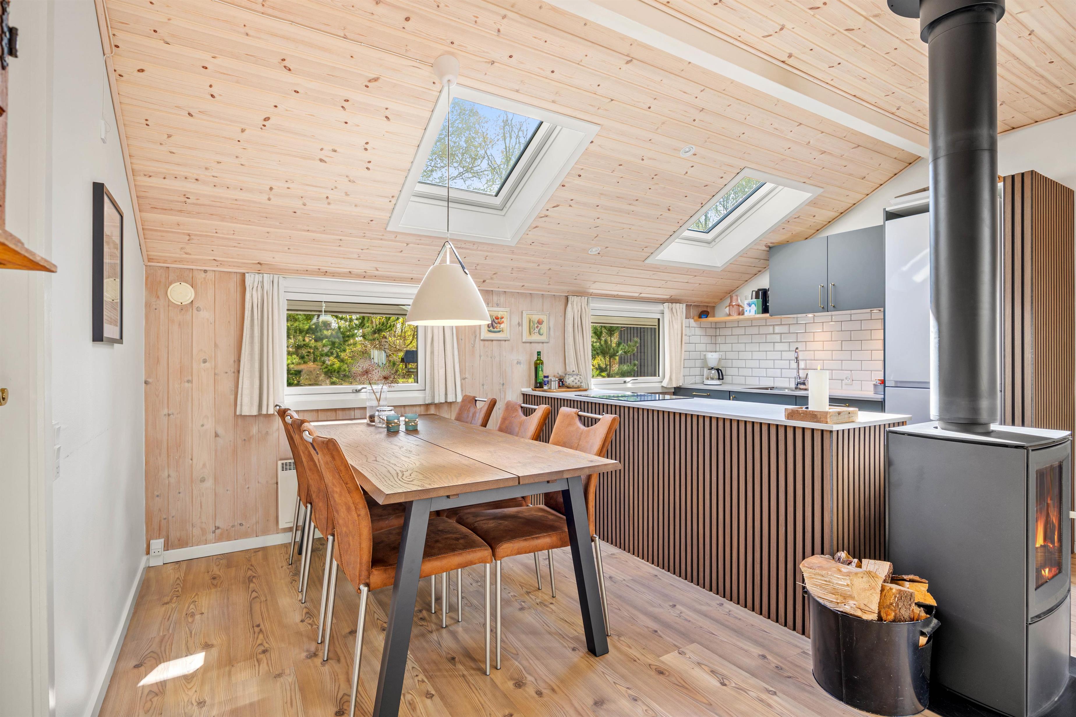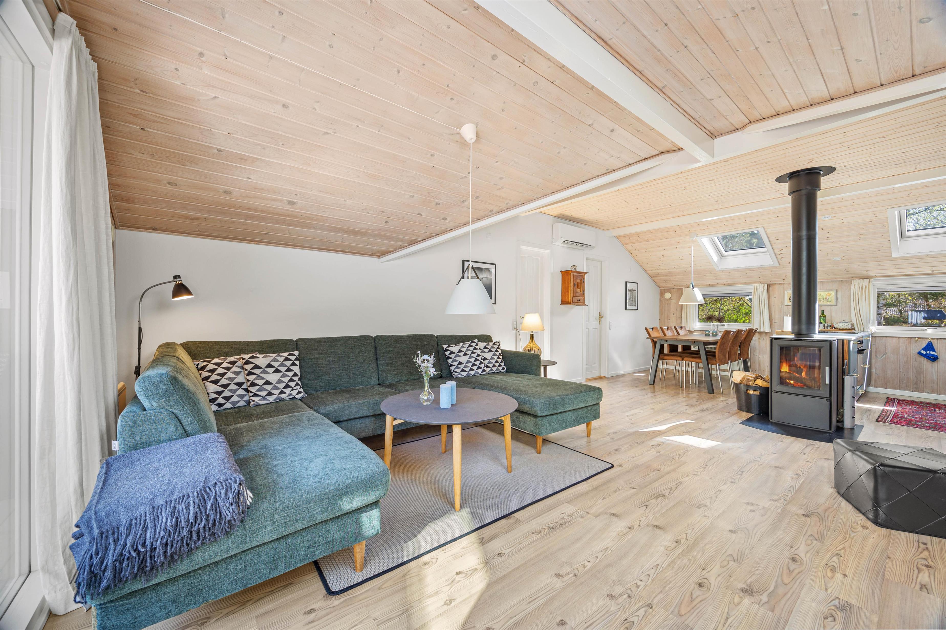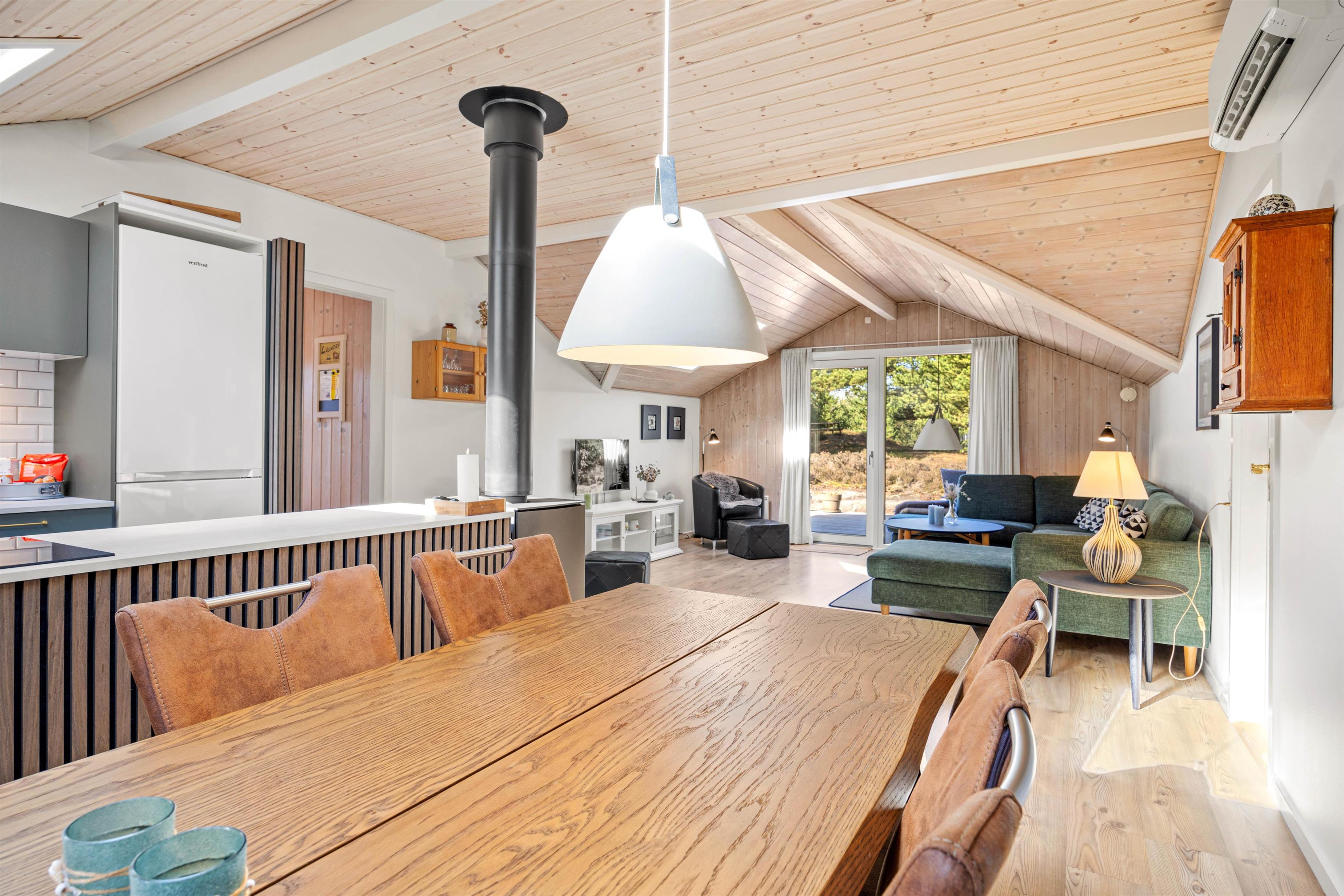 Midtpunktet i dette hus er køkken-alrummmet med stuen. Hele huset er gennemført smukt indrettet, så man virkeligt kan føle sig godt tilpas. Køkkenet er godt udstyret, så man her nemt kan trylle lækker mad til sig selv og familien, som så kan nydes ved det smarte ovale spisebord, der naturligvis også egner sig til lange spilleaftener. På kølige aftener kan I tænde op i brændeovnen og nyde den hyggelige stemning, imens I gennem de store panoramavinduer kan observere grundens dyreliv.