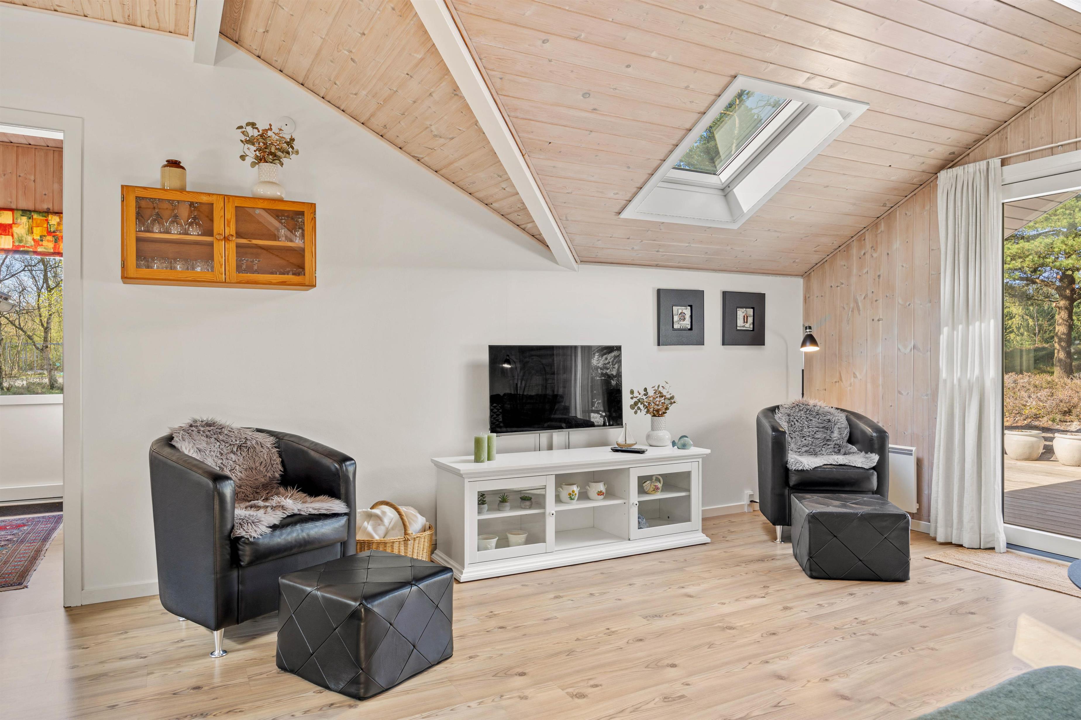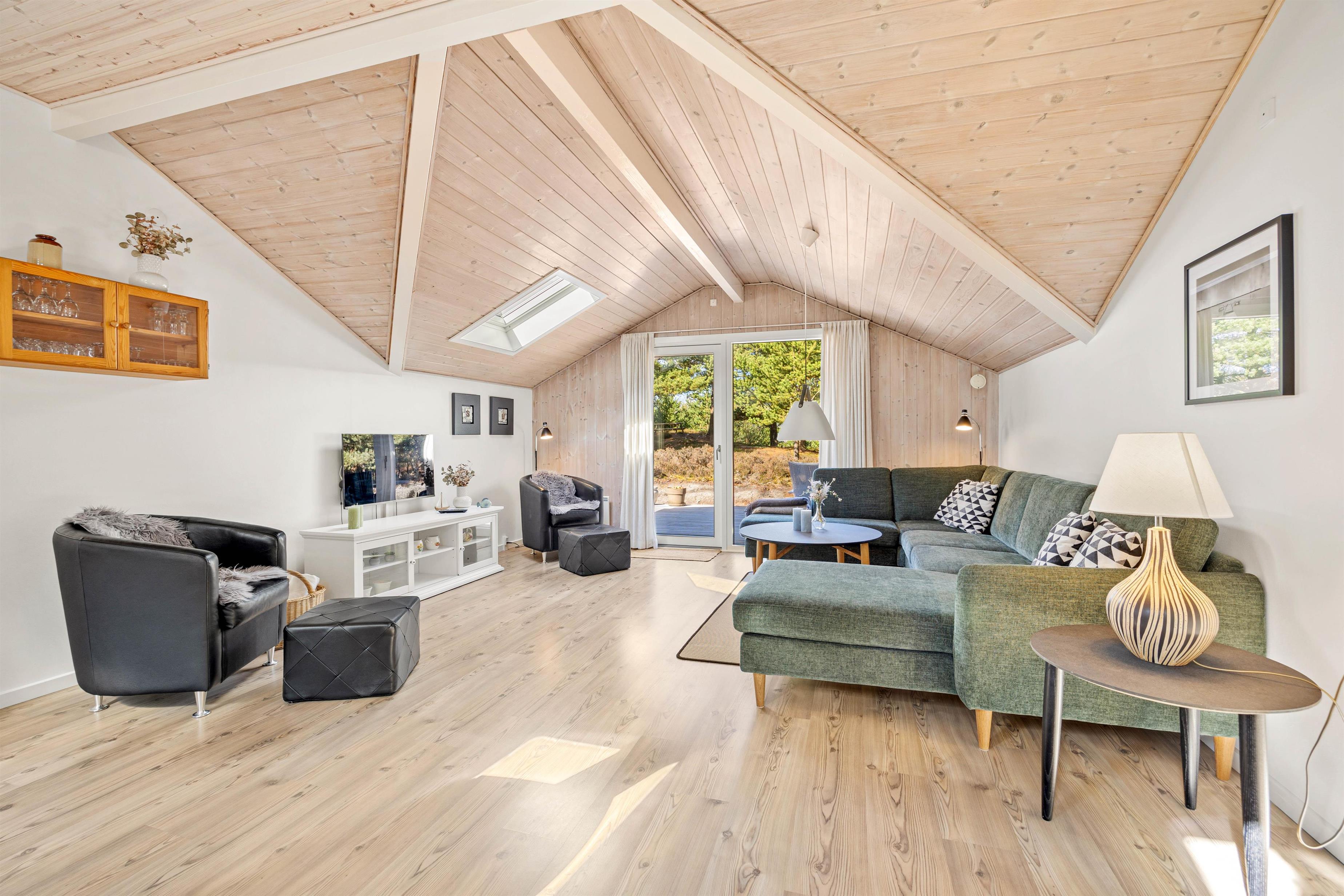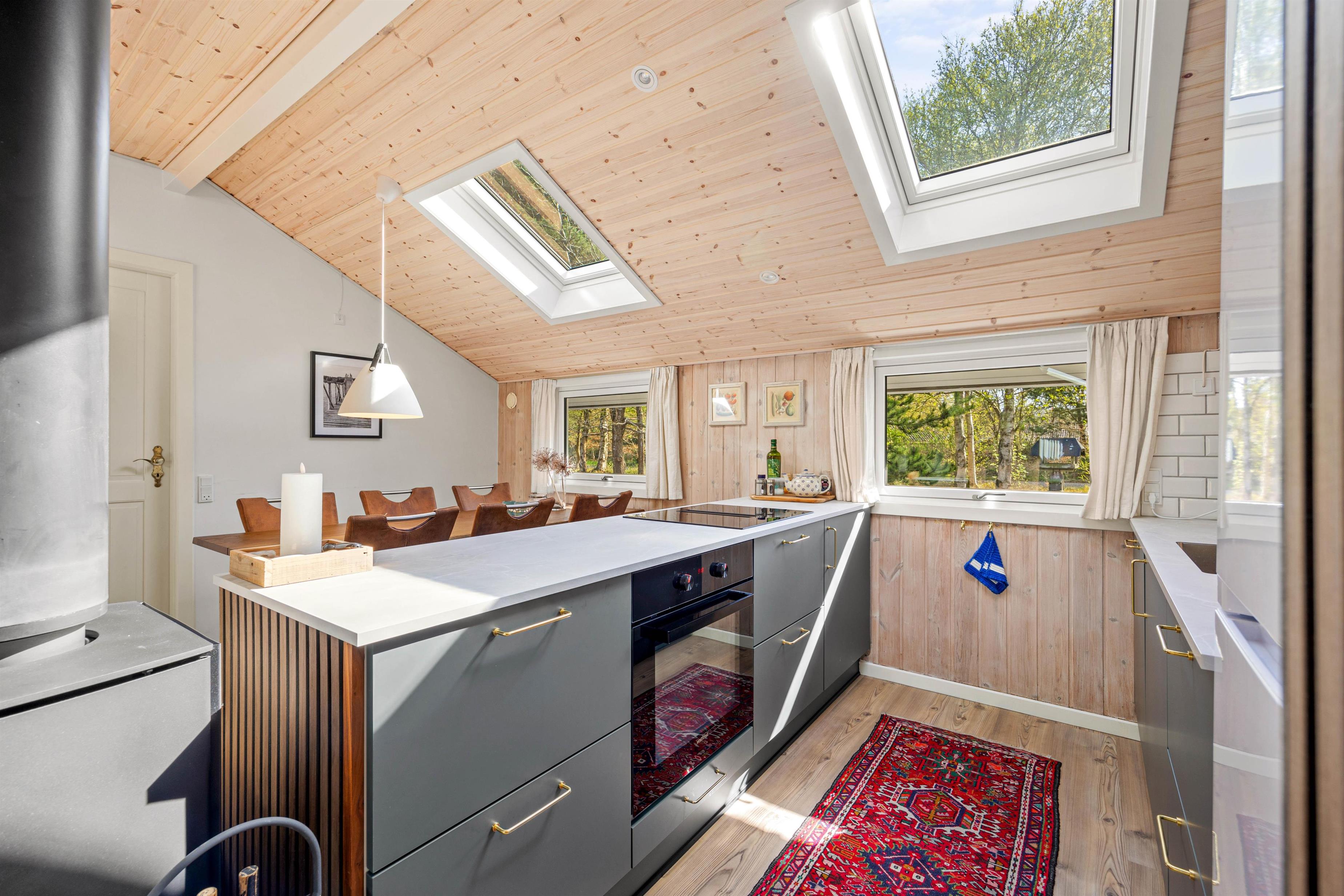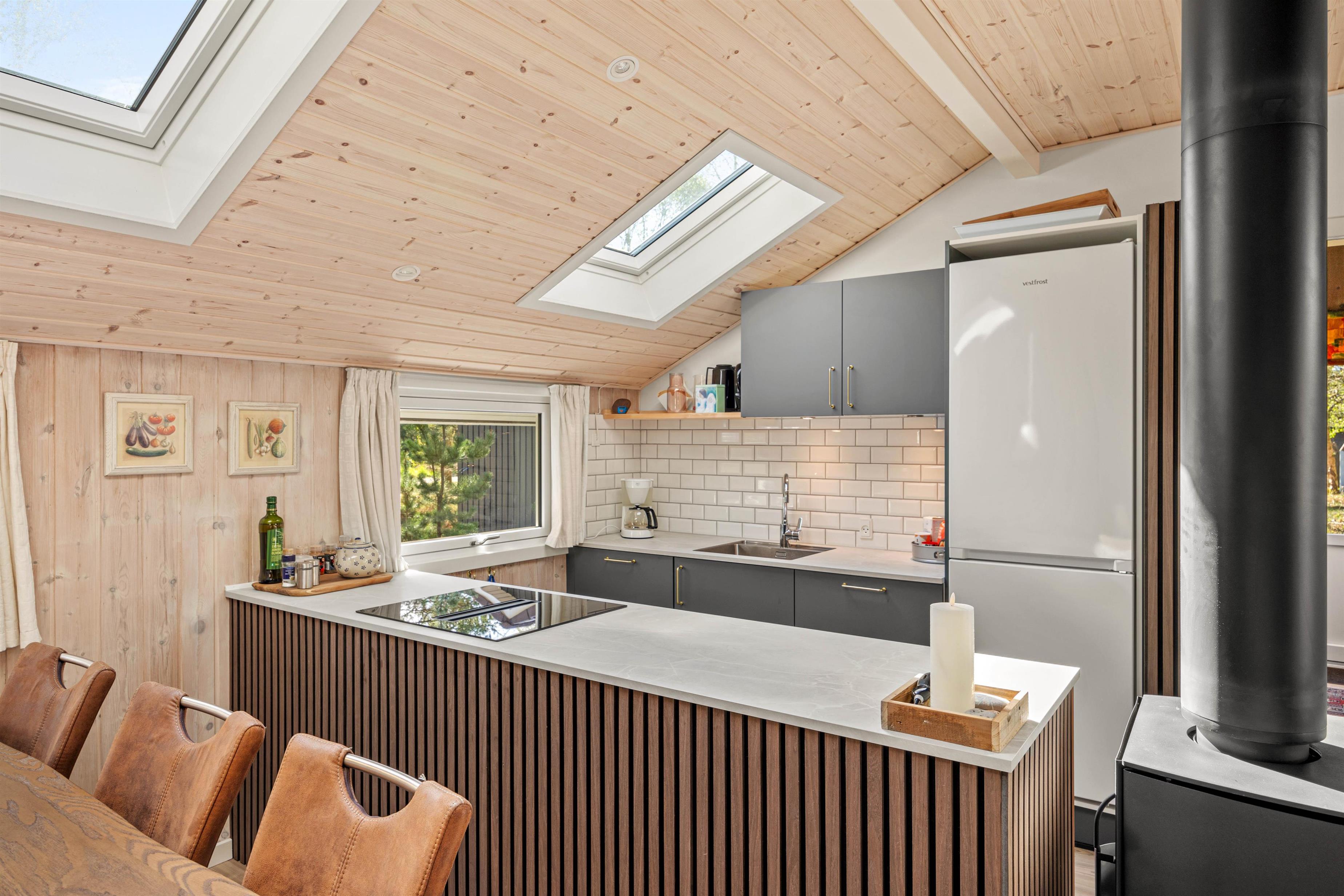 Midtpunktet i dette hus er køkken-alrummmet med stuen. Hele huset er gennemført smukt indrettet, så man virkeligt kan føle sig godt tilpas. Køkkenet er godt udstyret, så man her nemt kan trylle lækker mad til sig selv og familien, som så kan nydes ved det smarte ovale spisebord, der naturligvis også egner sig til lange spilleaftener. På kølige aftener kan I tænde op i brændeovnen og nyde den hyggelige stemning, imens I gennem de store panoramavinduer kan observere grundens dyreliv.
