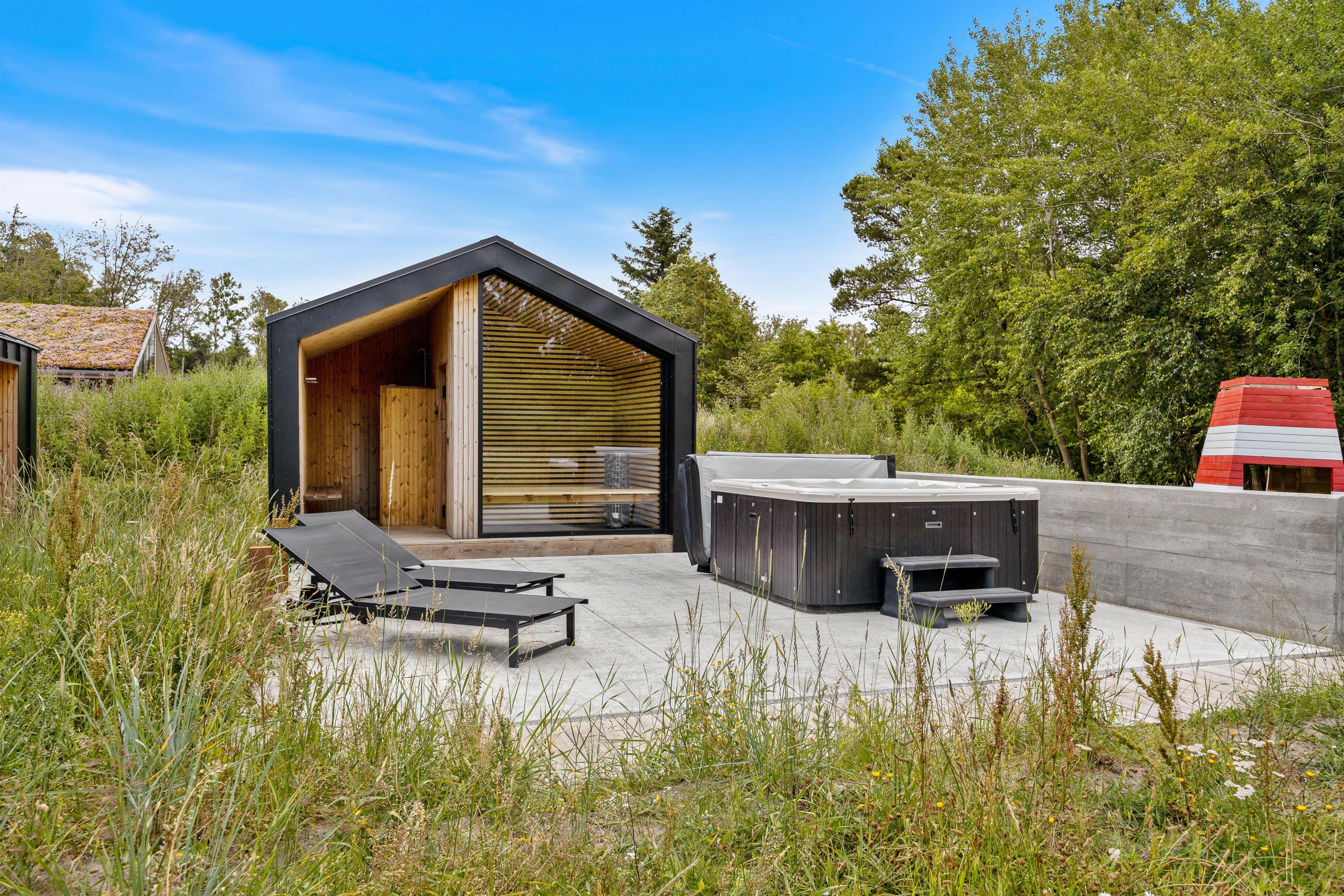 Når I holder ferie i sommerhuset på Strandgodsvej 17, vil der være masser af afslapning på programmet. Udenfor finder I en sauna (både infrarød og alm. saunaovn), hvor I kan sætte jer til rette i den dejlige varme og slappe fuldstændig af. Der er også flere lækre wellnessfaciliteter. Her står der nemlig også en udespa og en udebruser* klar til jer, så her er der rig mulighed for skønne, afslappende stunder. Udebruseren er desuden oplagt at blive skyllet under efter en tur ved stranden.