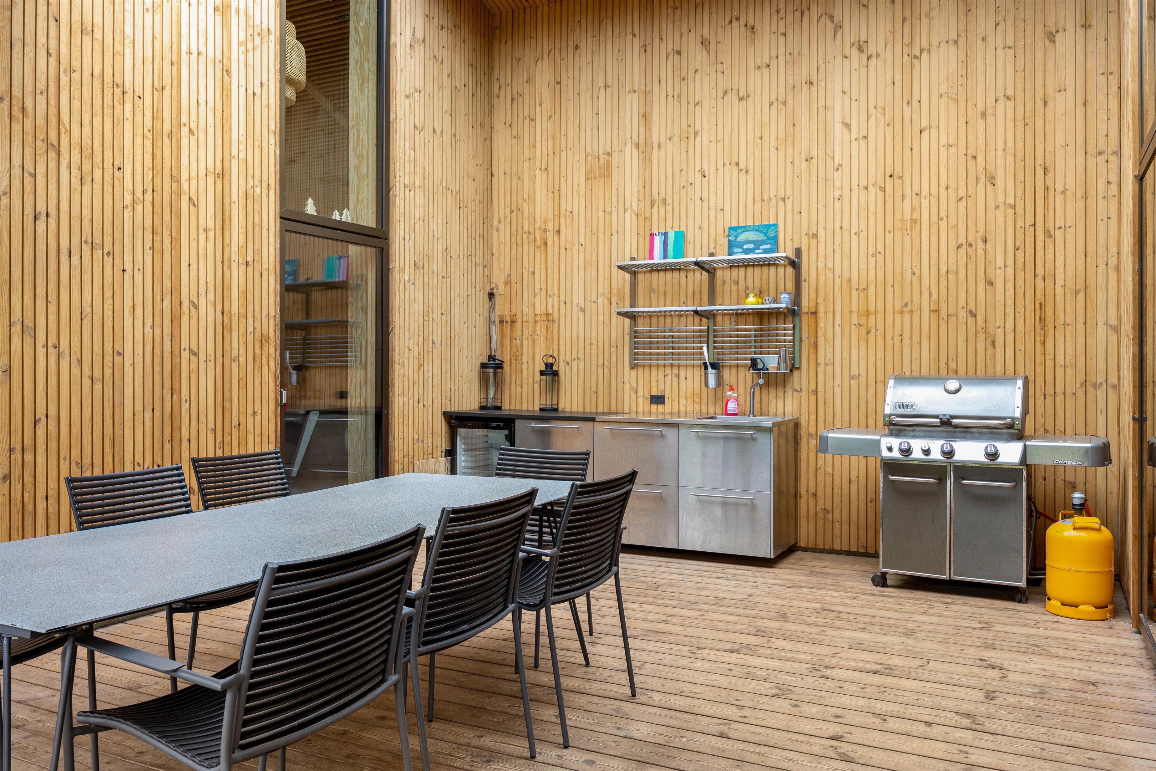 Sommerhuset har en skøn terrasse, der er delvist overdækket. På terrassen har I liggestole til rådighed, så I kan finde jer godt til rette på terrassen og få mest muligt ud af de solrige feriedage, som I kan afslutte med at lave en god grillmiddag med lækre bøffer på sommerhusets gasgrill.