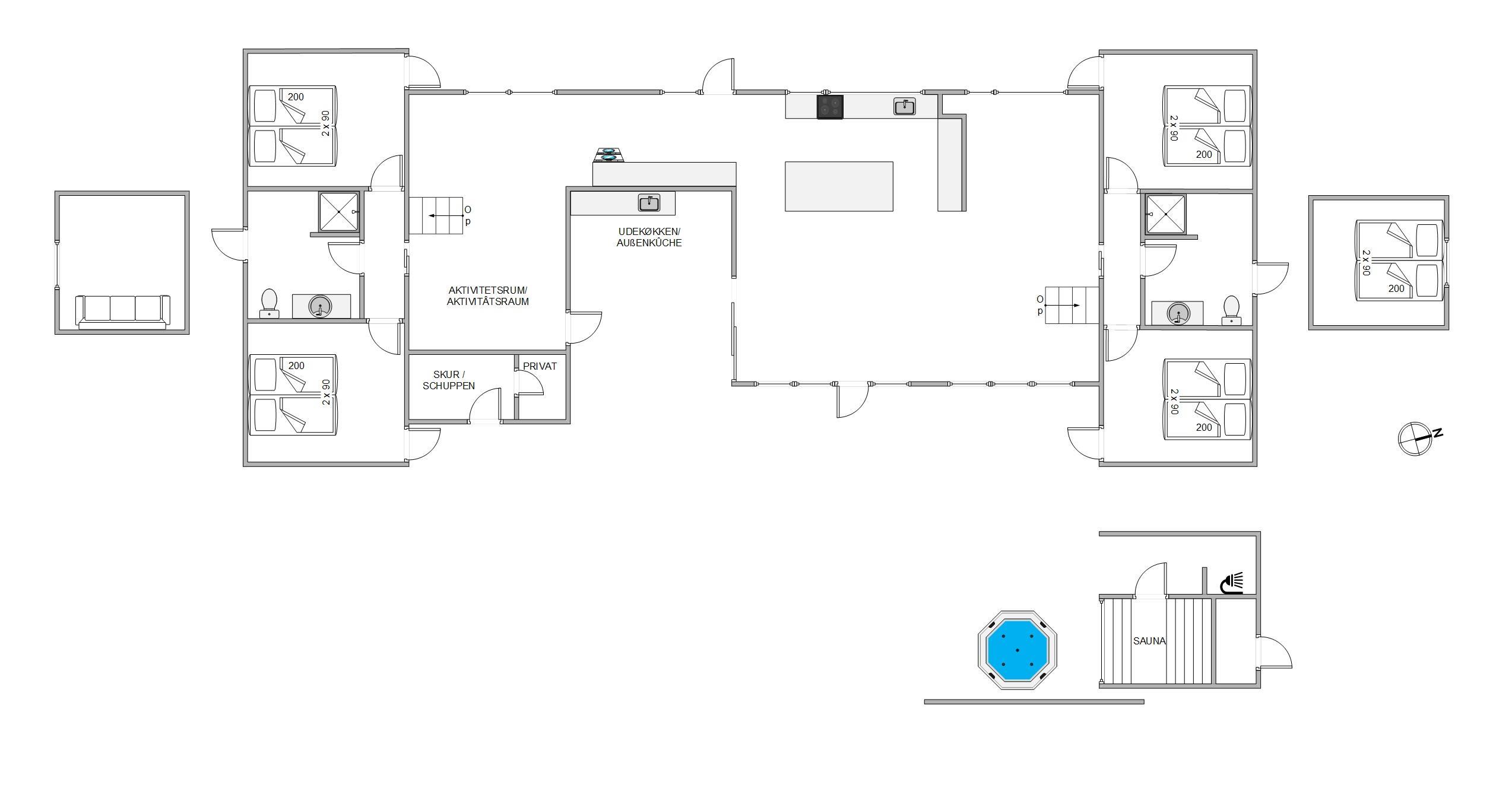 I det 190 kvadratmeter store sommerhus er der god plads til feriens gæster. Feriehuset rummer 4 gode soveværelser. Dertil er der et aktivitetsrum med både bordtennis og bordfodbold.