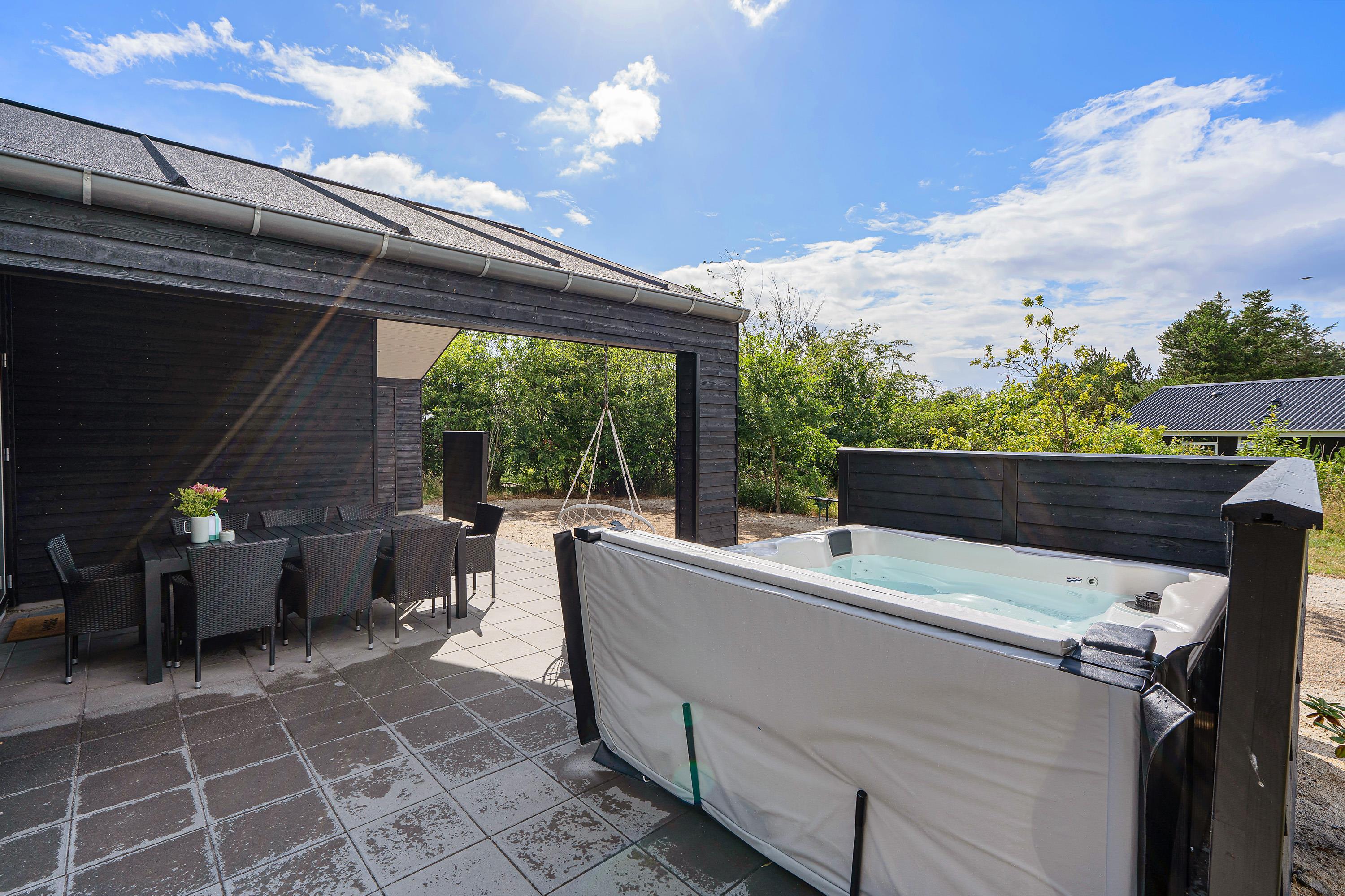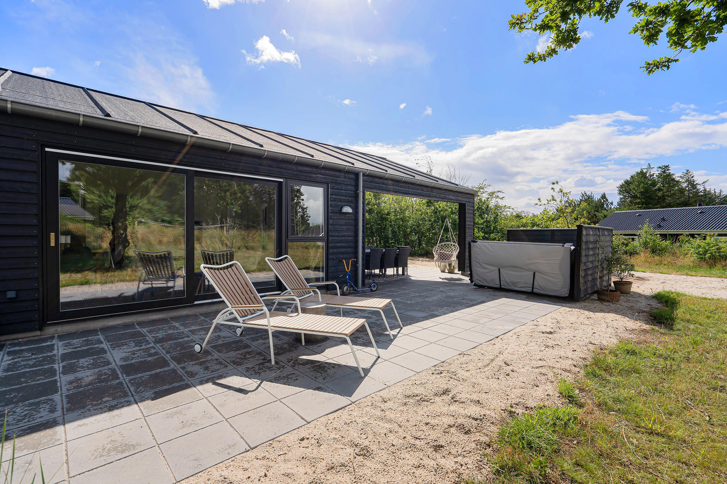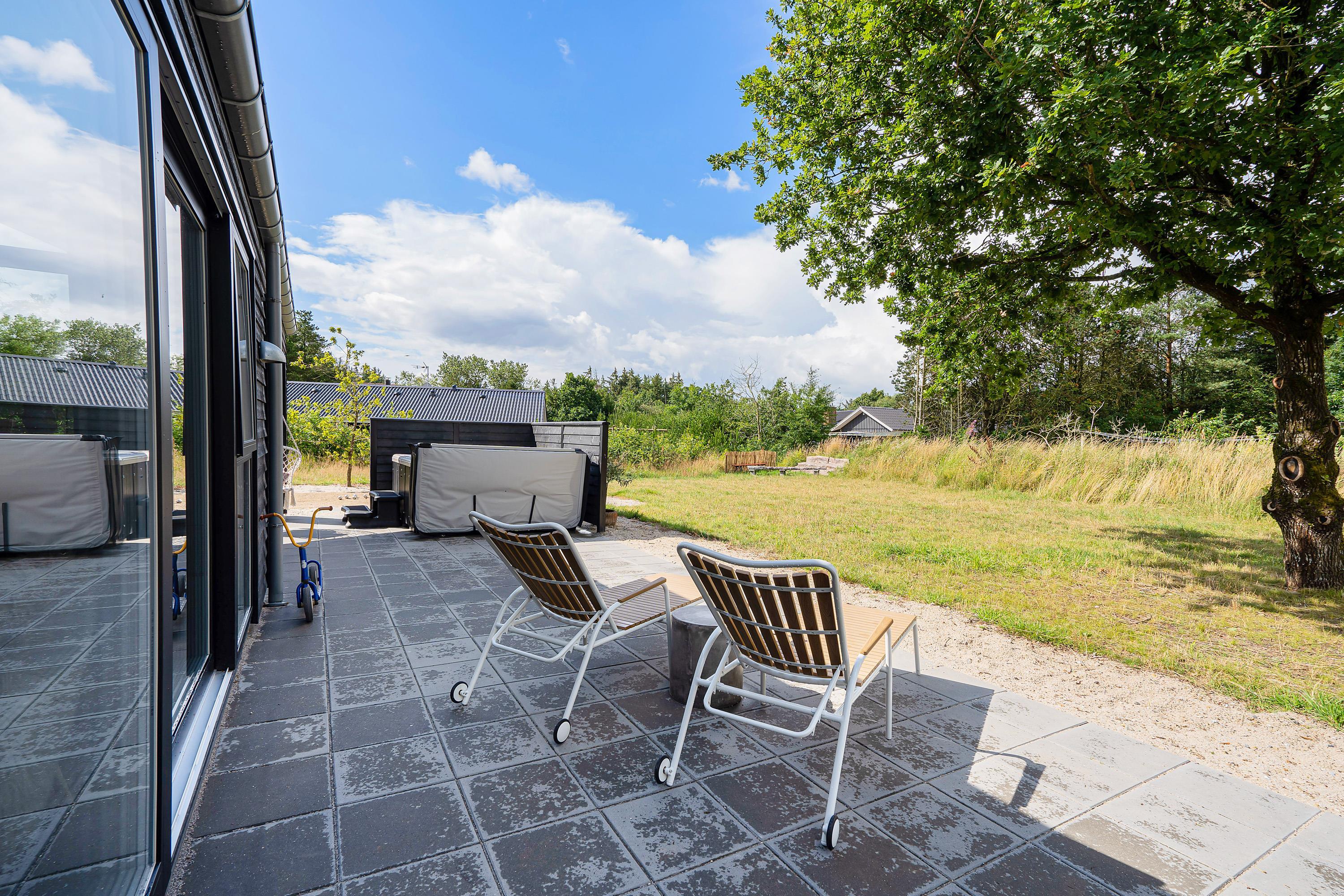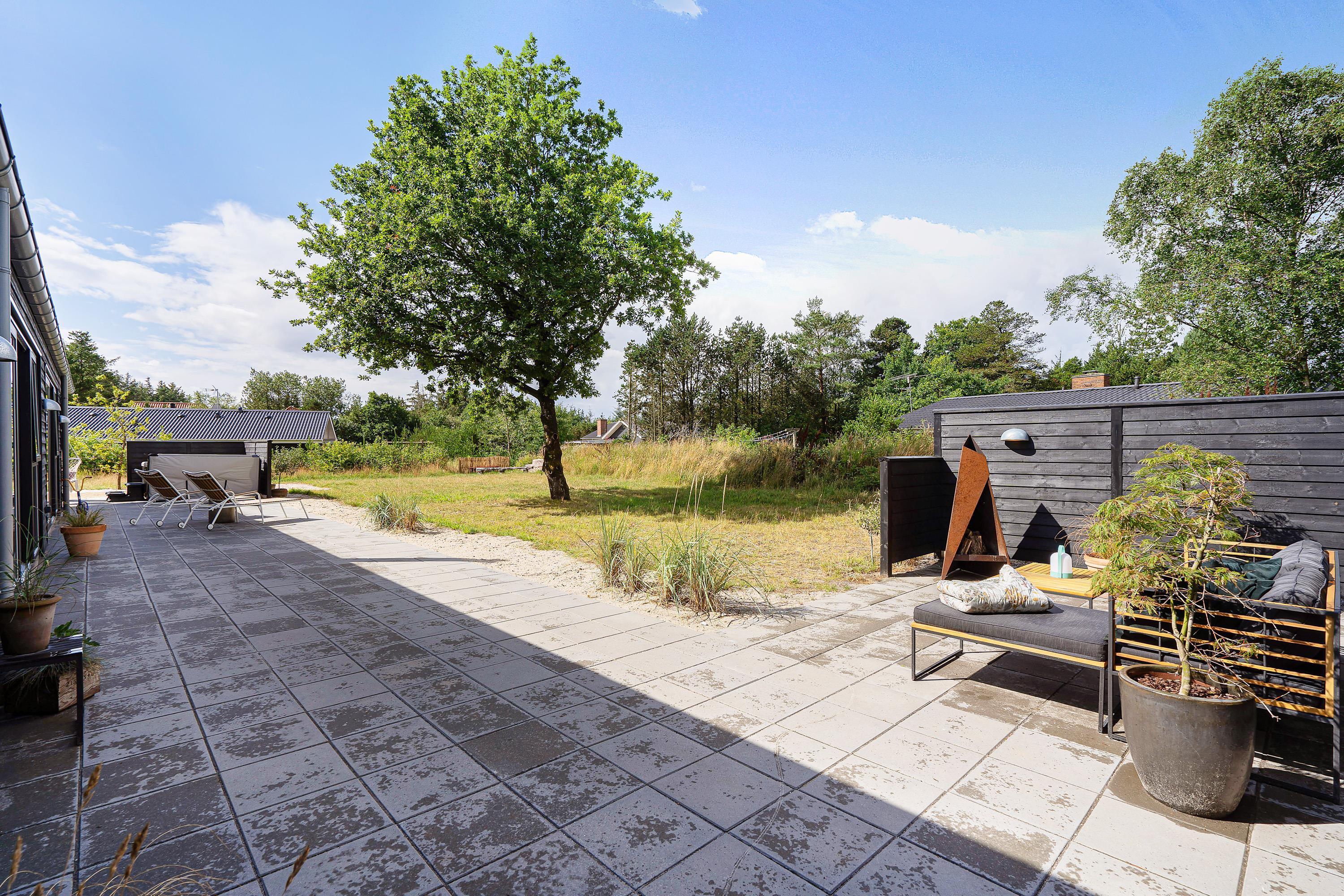 Den store terrasse går næsten hele vejen rundt om sommerhuset og har både en åben og en overdækket del. Der er sørget for komfortable havemøbler, liggestole og en grill, så I kan nyde den friske luft i fulde drag. På terrassen er desuden en udespa, en udendørs bruser*, og de rigtig friske kan snuppe morgenbadet under åben himmel og der er også mulighed for at spille petanque i haven.