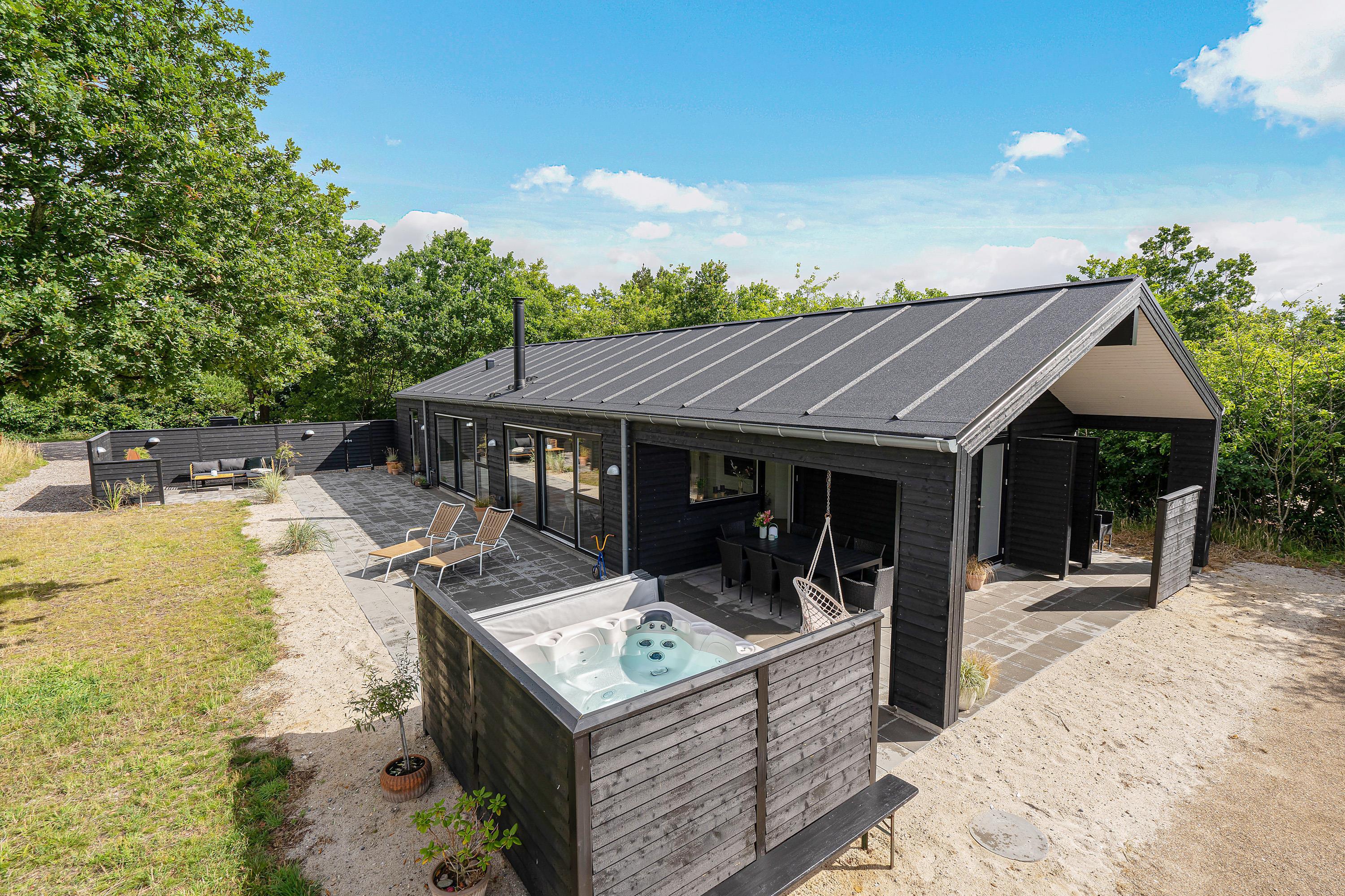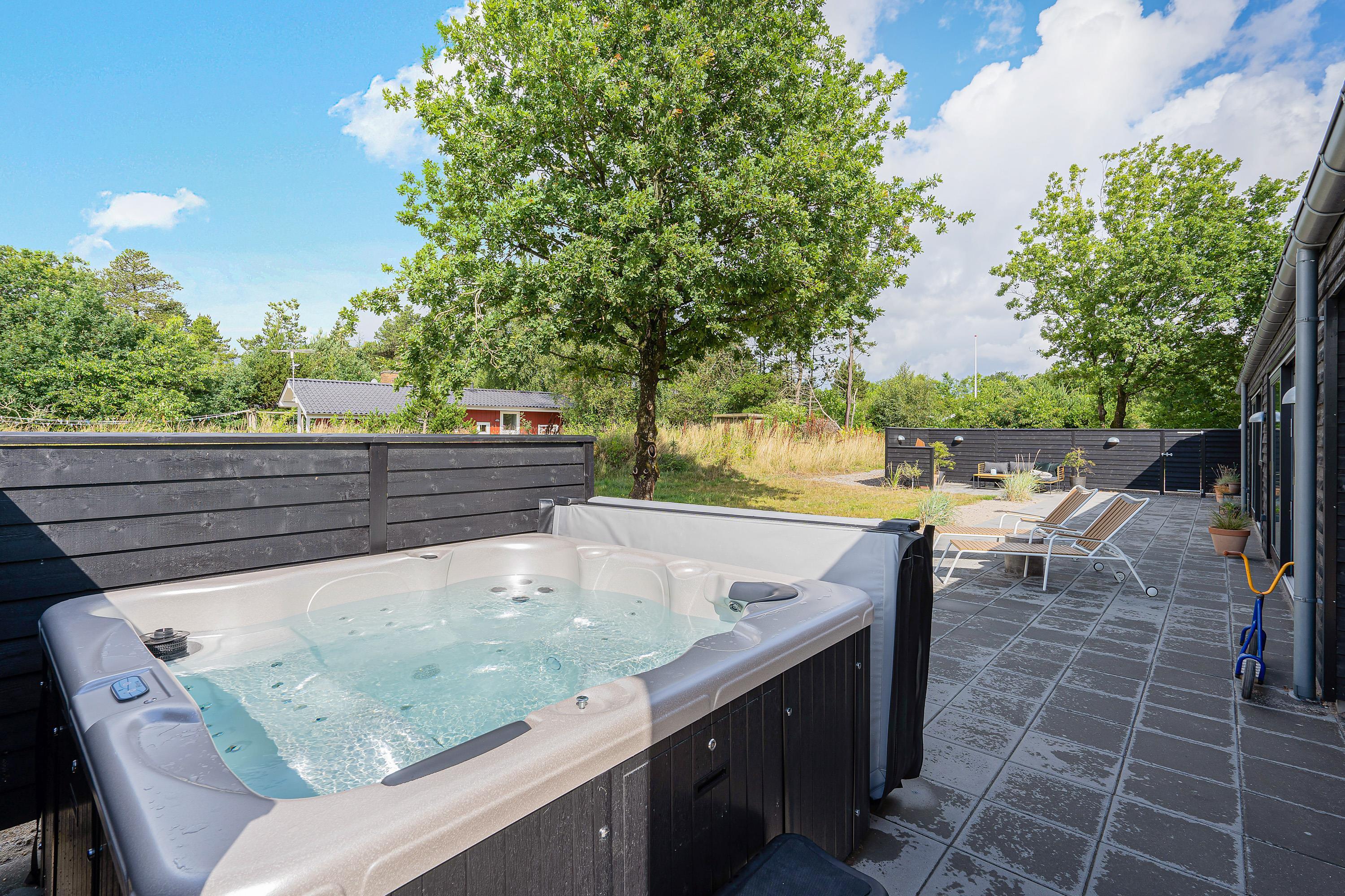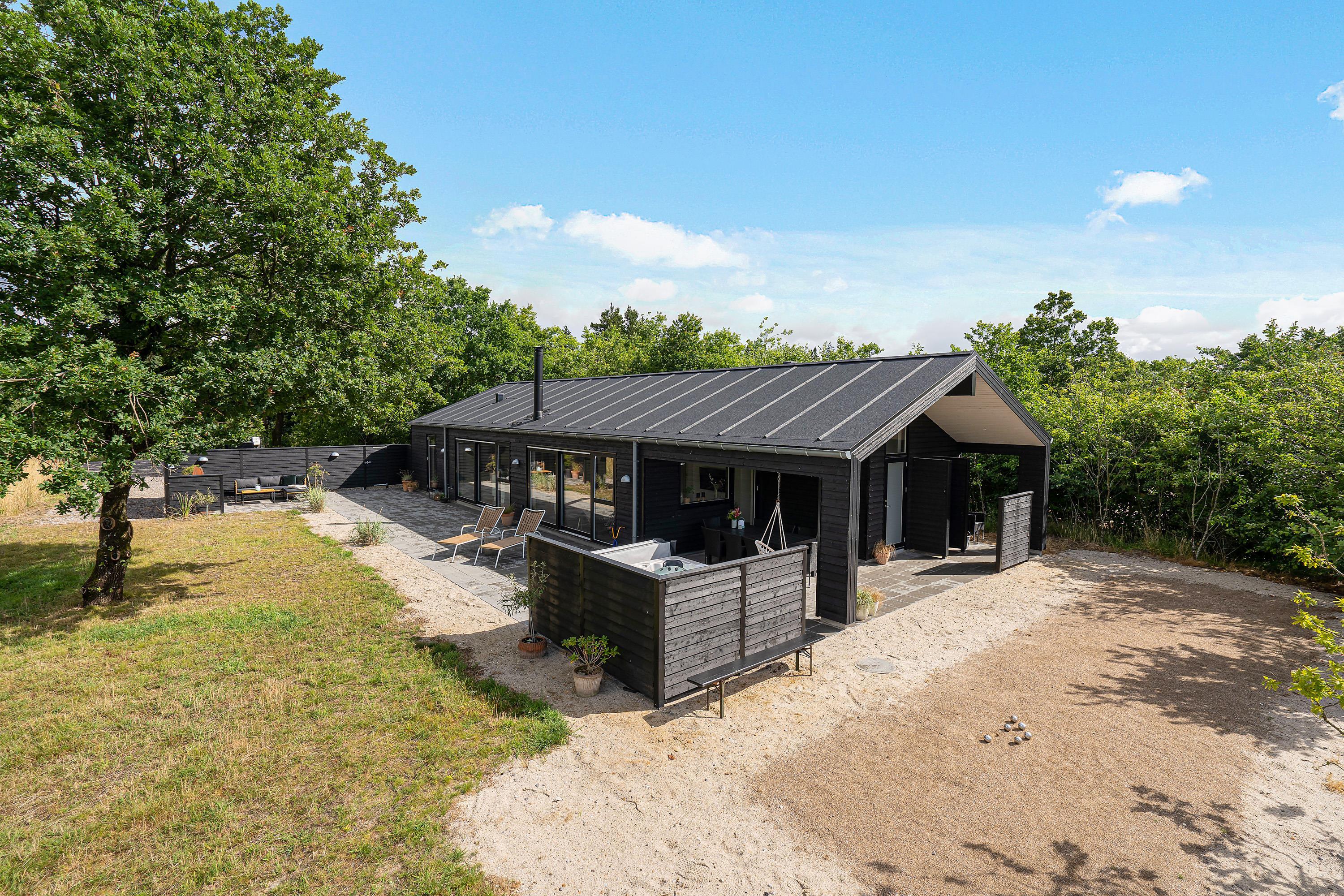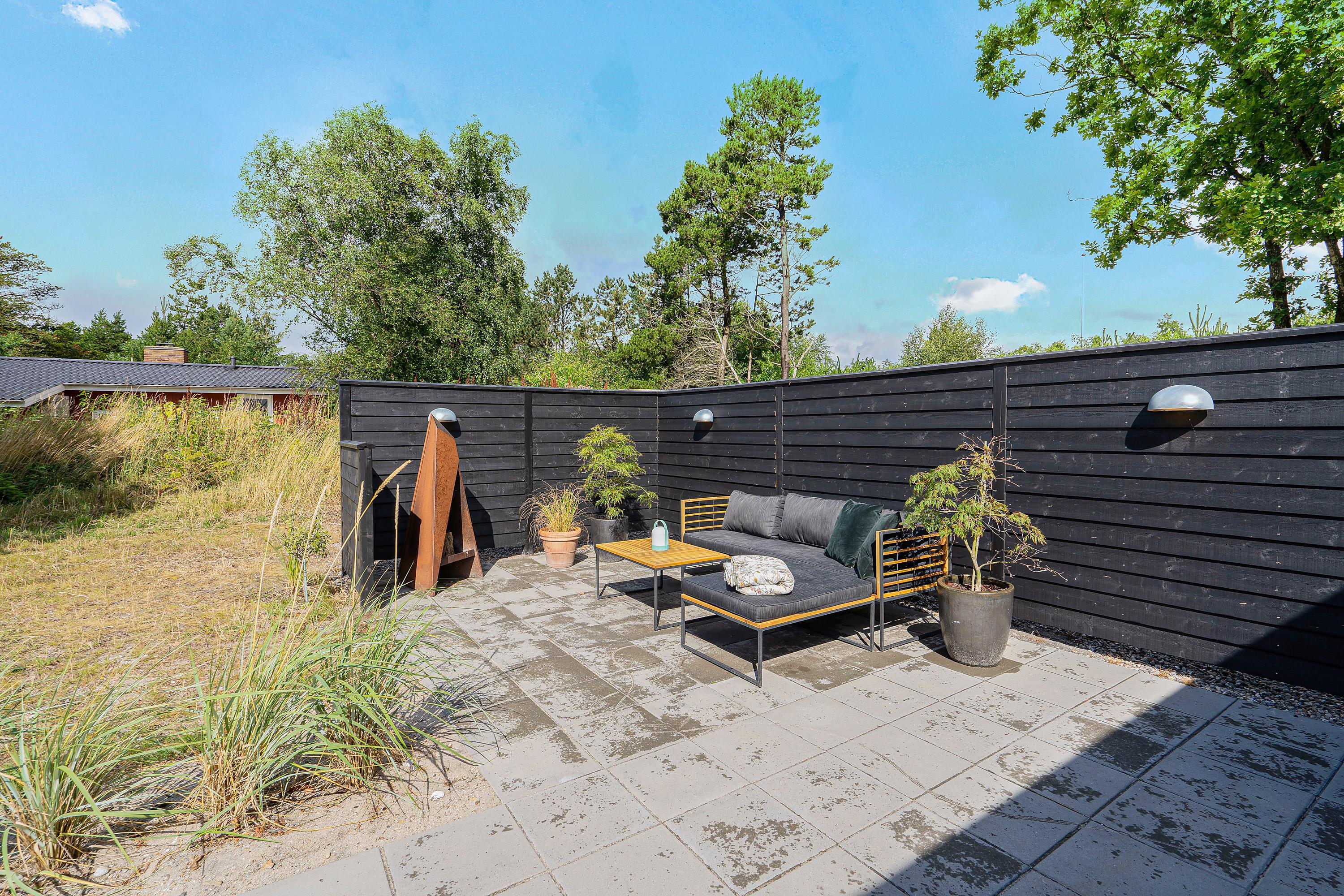 Den store terrasse går næsten hele vejen rundt om sommerhuset og har både en åben og en overdækket del. Der er sørget for komfortable havemøbler, liggestole og en grill, så I kan nyde den friske luft i fulde drag. På terrassen er desuden en udespa, en udendørs bruser*, og de rigtig friske kan snuppe morgenbadet under åben himmel og der er også mulighed for at spille petanque i haven.