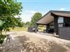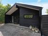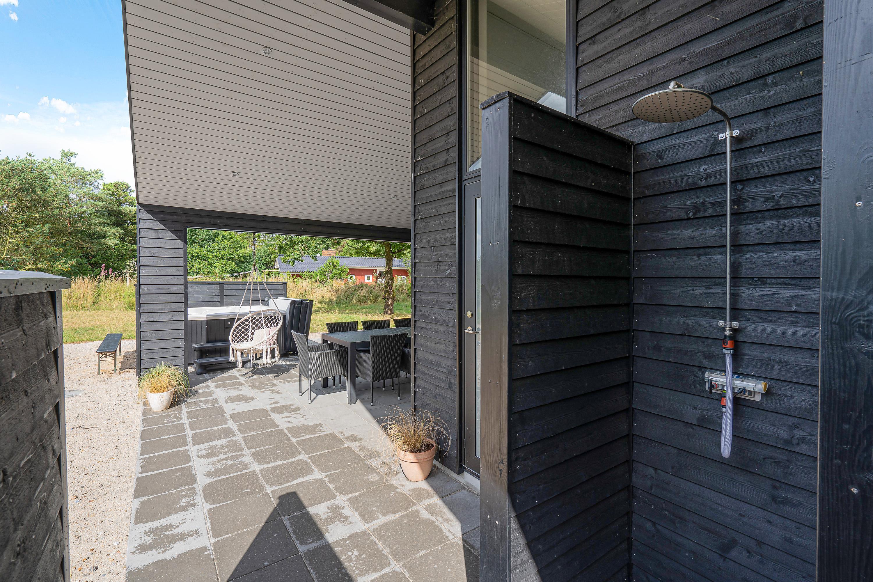 Stor terrasse med overdækket del, udendørs bruser og lademulighed til elbil