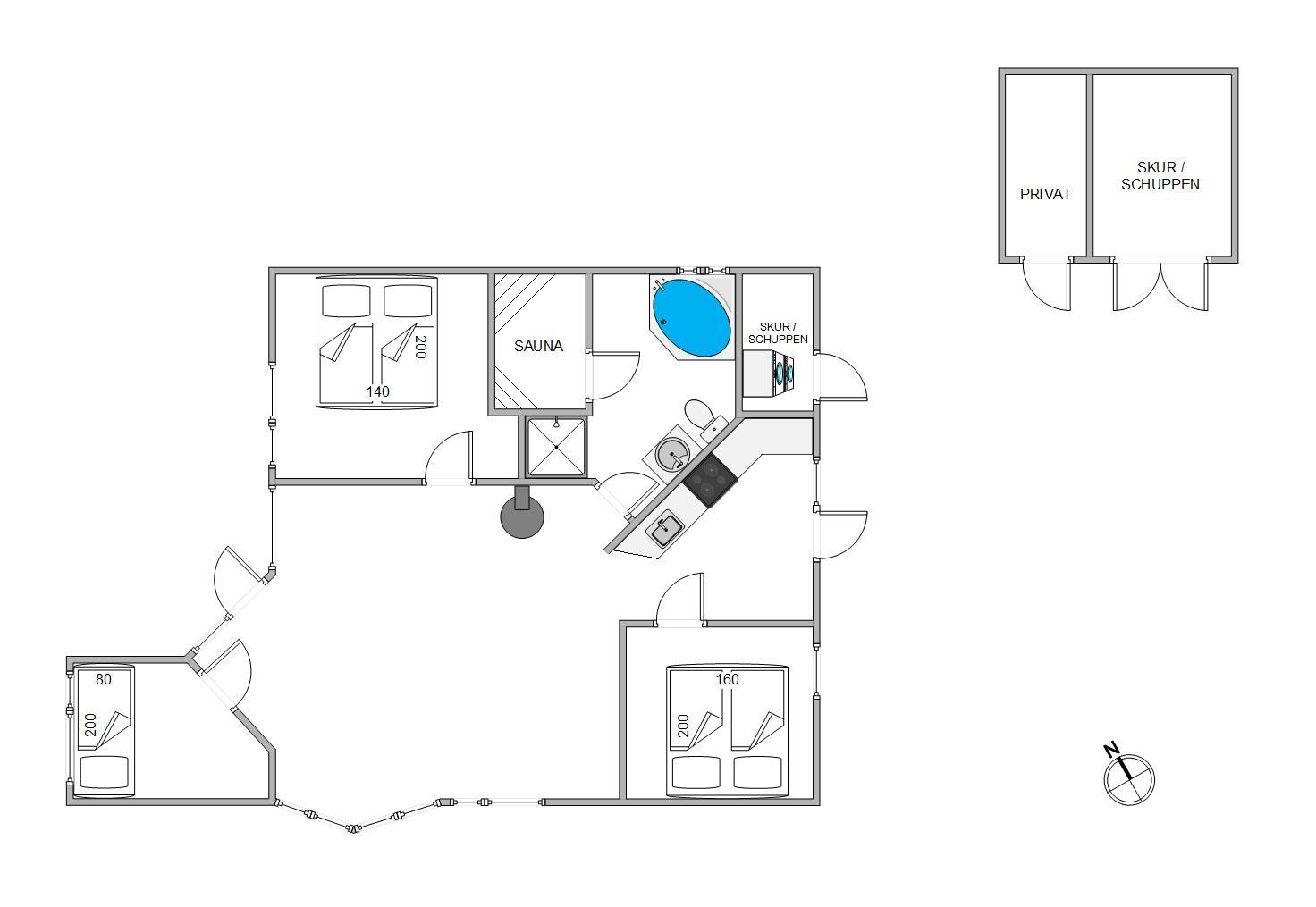 Sommerhusets højdepunkter finder I på badeværelset. Ikke nok med at I kan få glæde af gulvvarme på badeværelset, så vil I også kunne nyde masser af afslapning i det skønne spabad og den varme sauna.