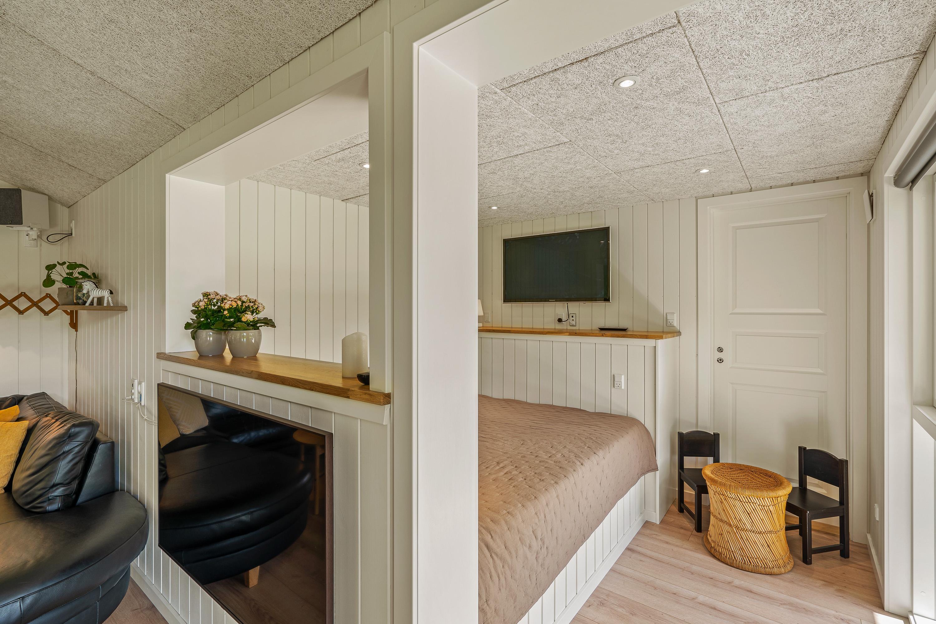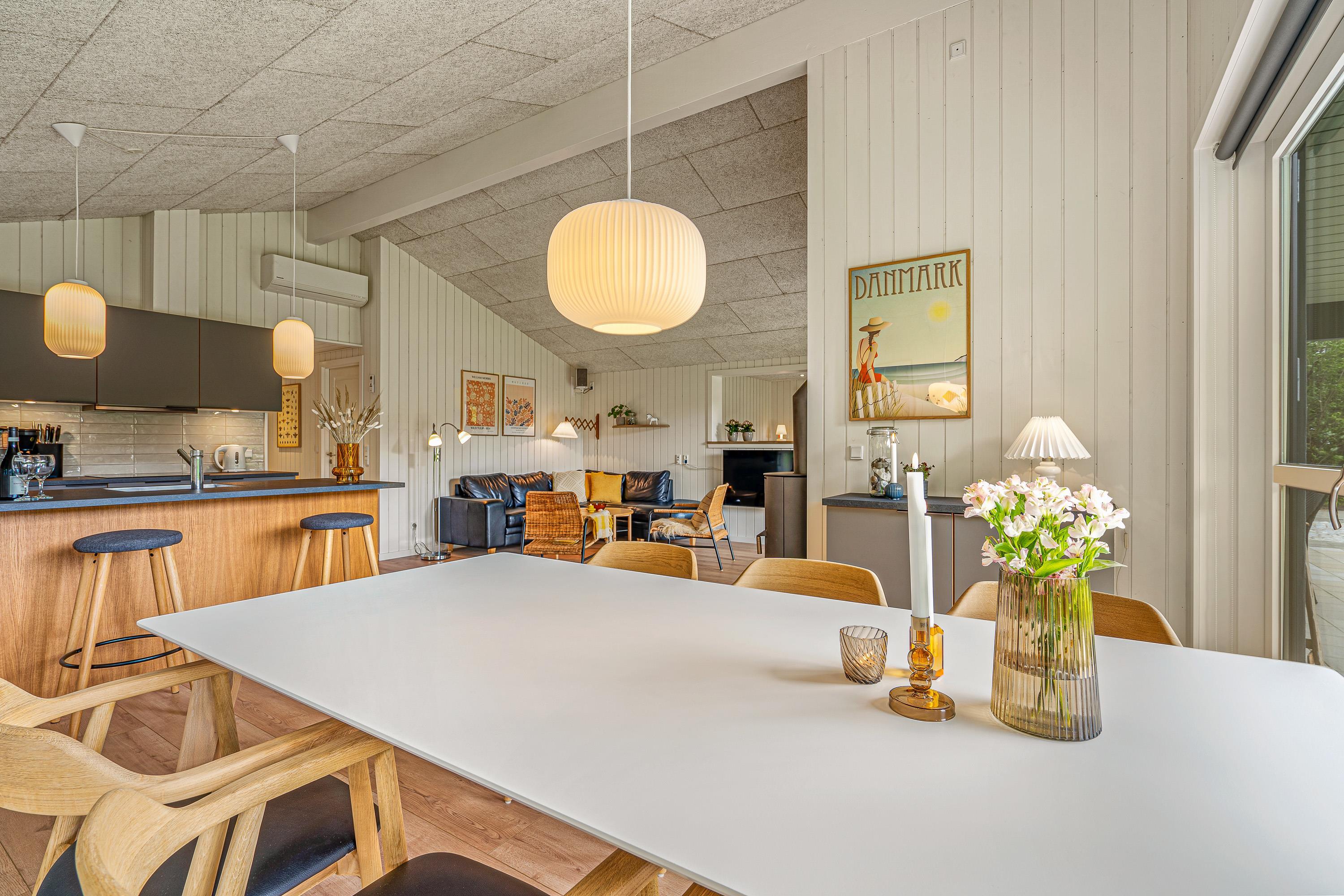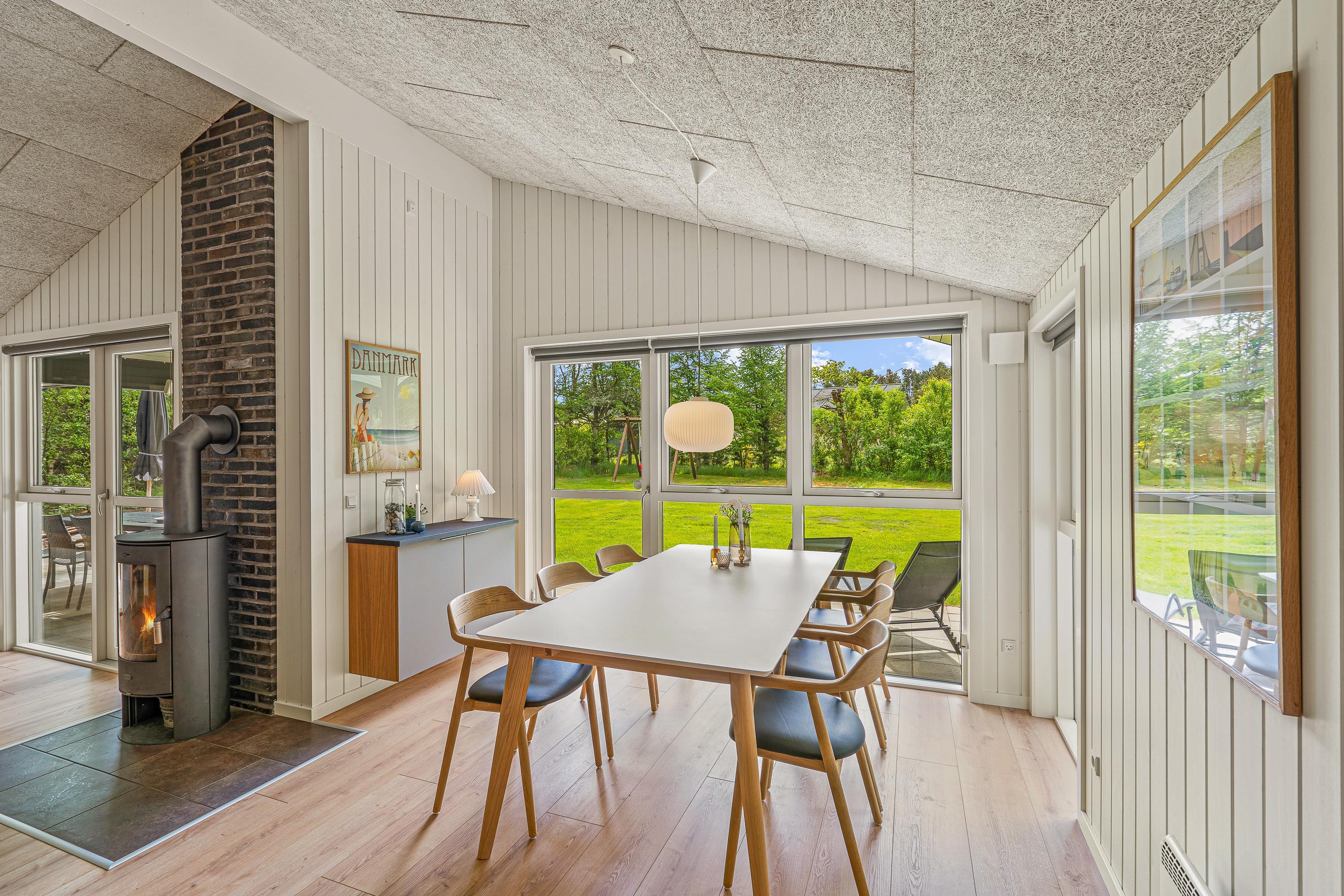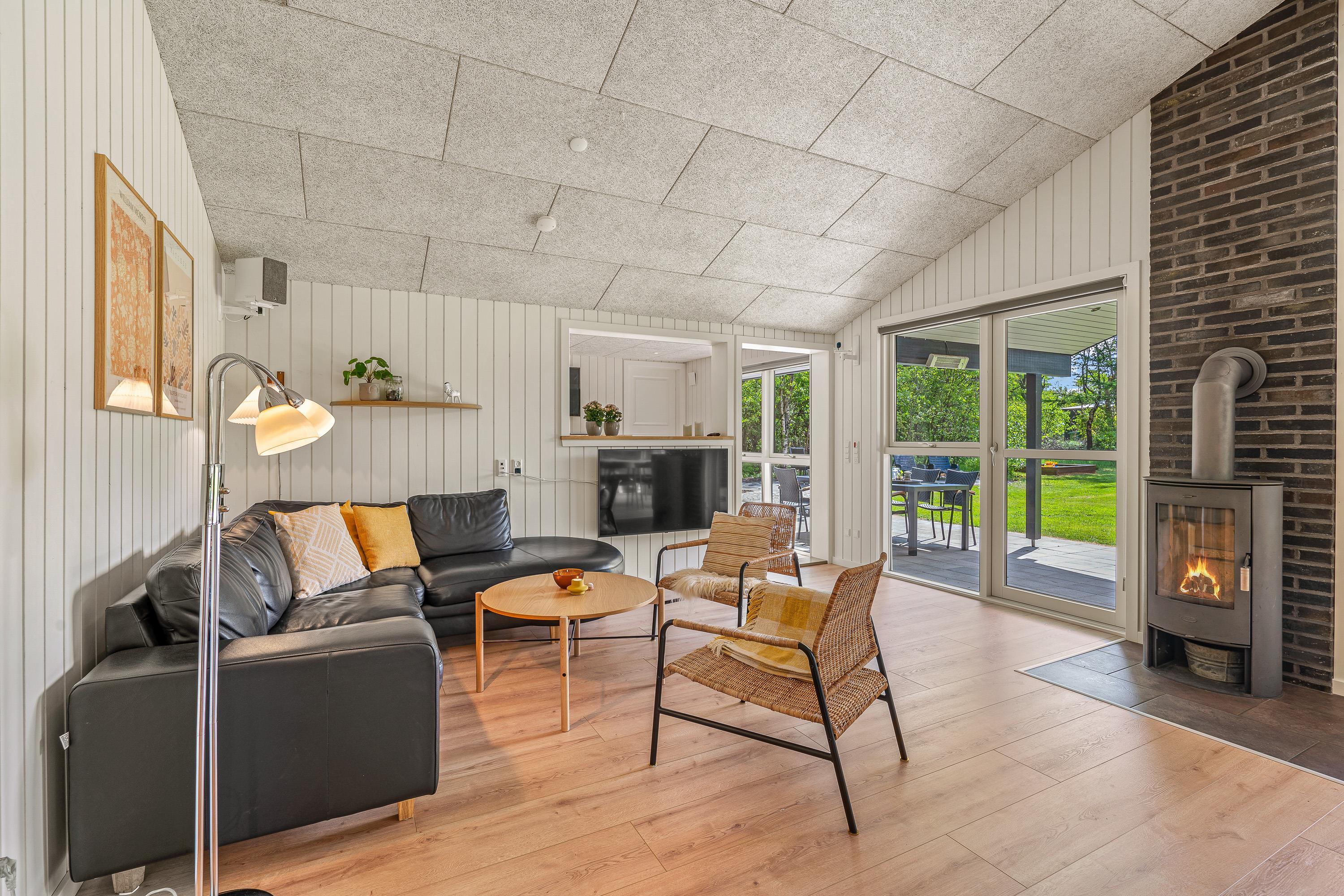 Sommerhuset er smagfuldt renoveret i 2022, og byder en moderne, hyggelig atmosfære. I den rummelige stue kan I nyde varmen af brændeovnen, der understreger den hyggelige sommerhusstemning. Ellers sørger en energivenlig varmepumpe for gode temperaturer i sommerhuset.