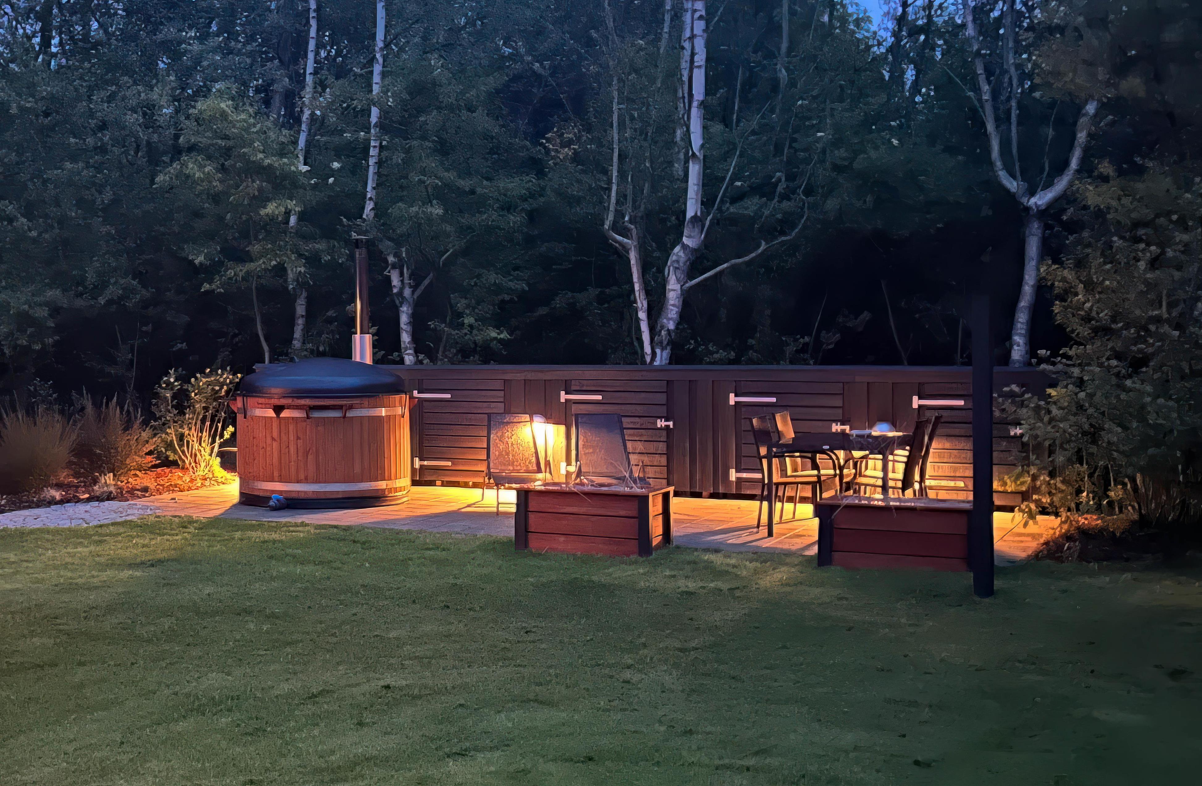 Tid til at dase på terrasserne med udekøkken, grill, udendørs bruser og vildmarksbad
