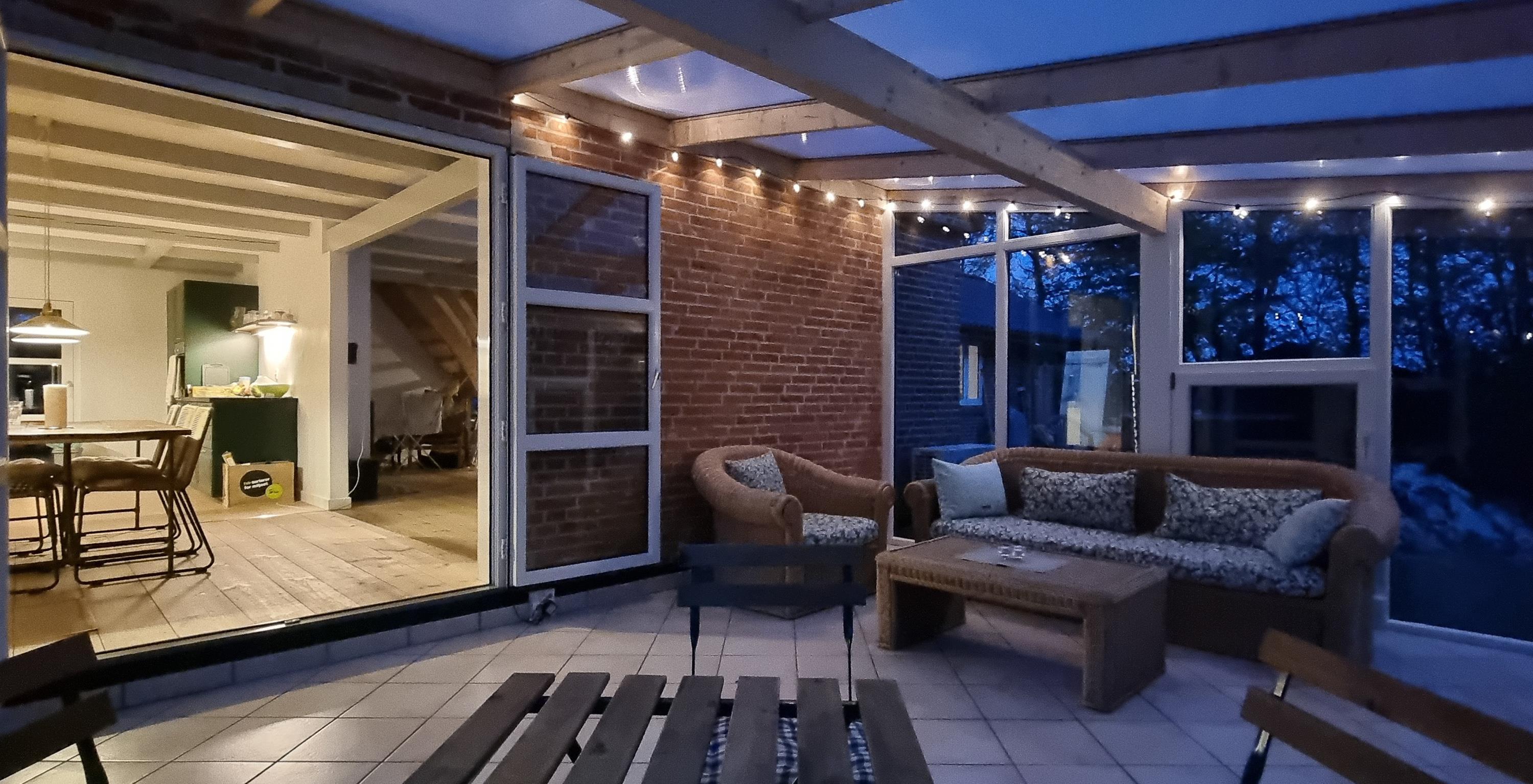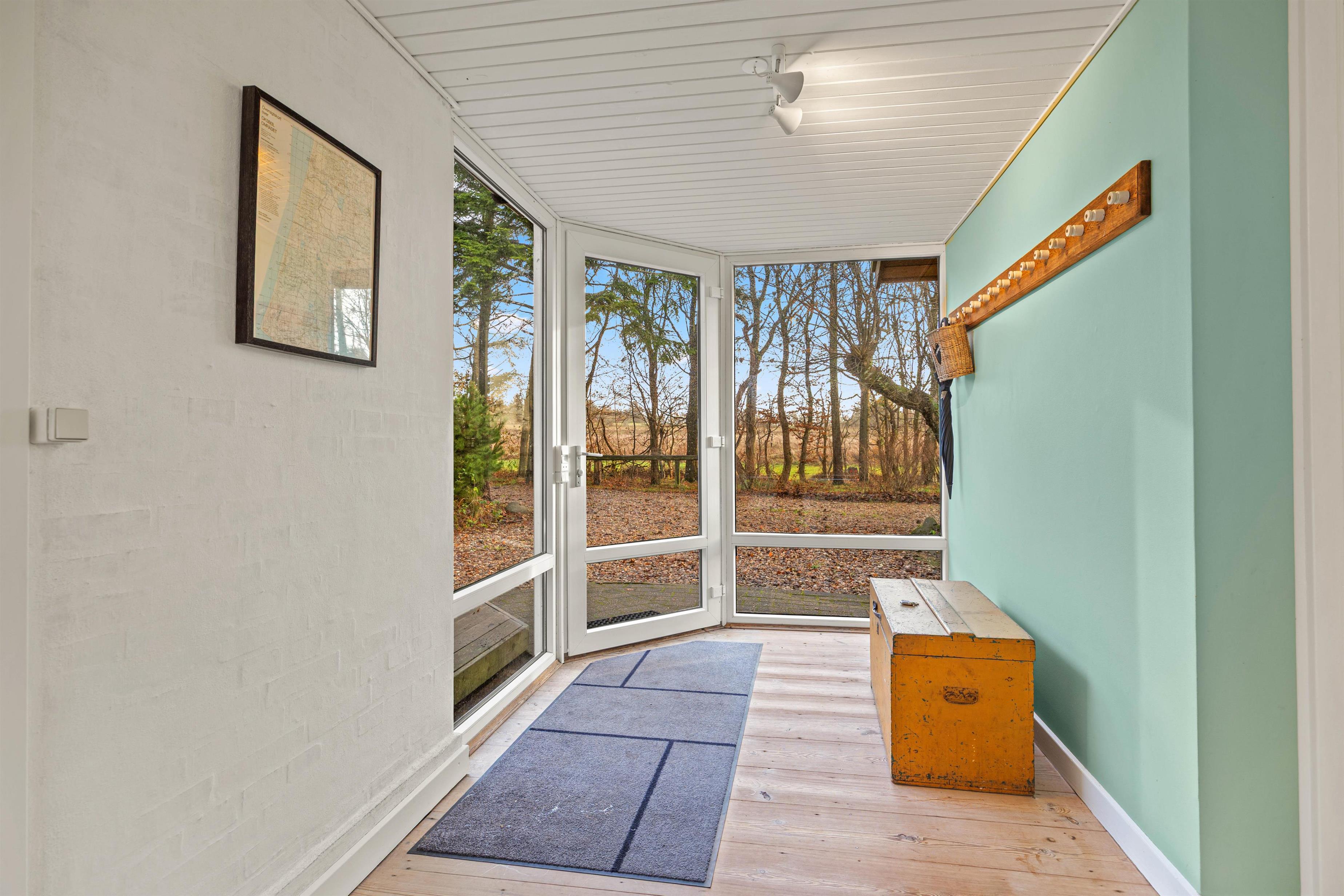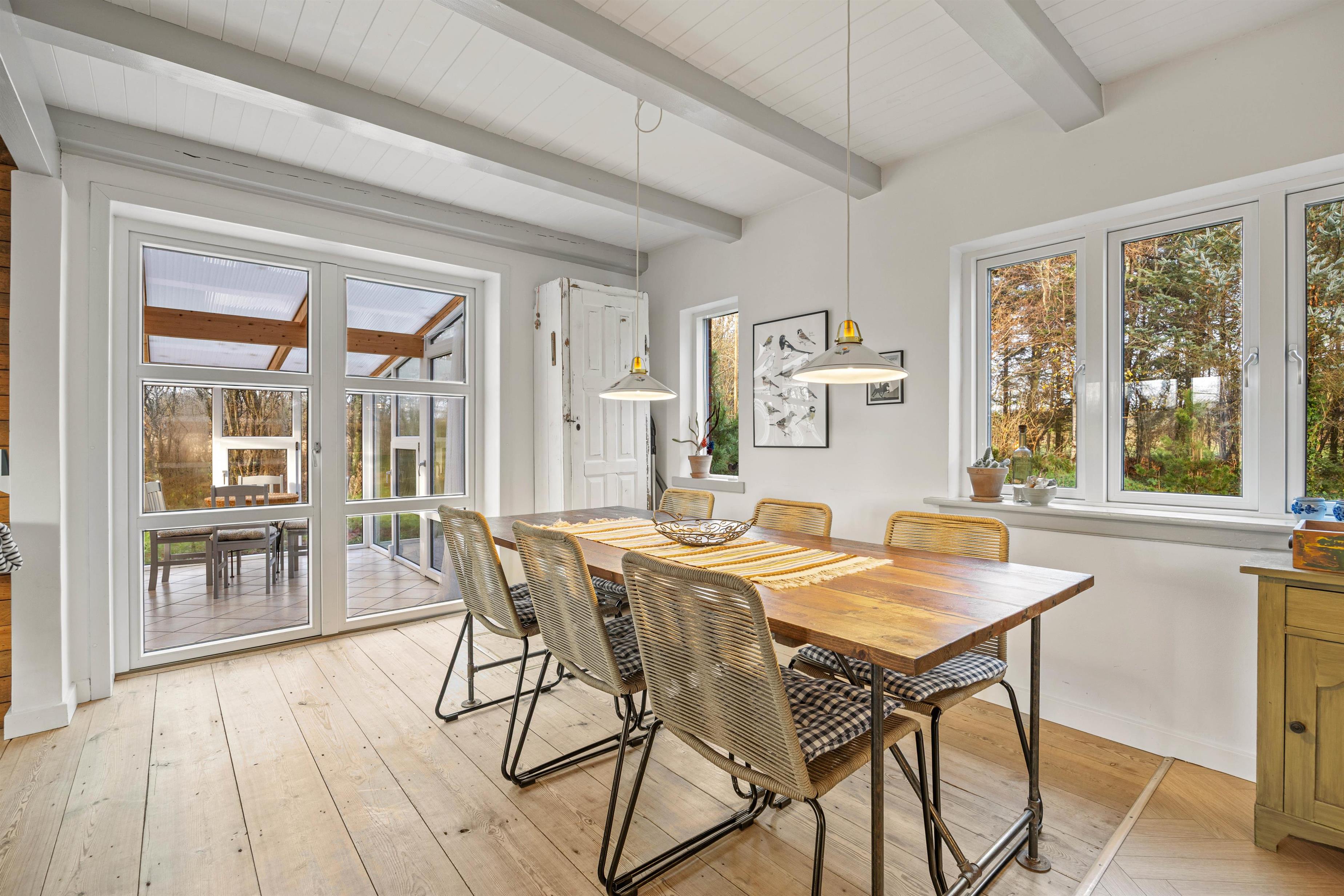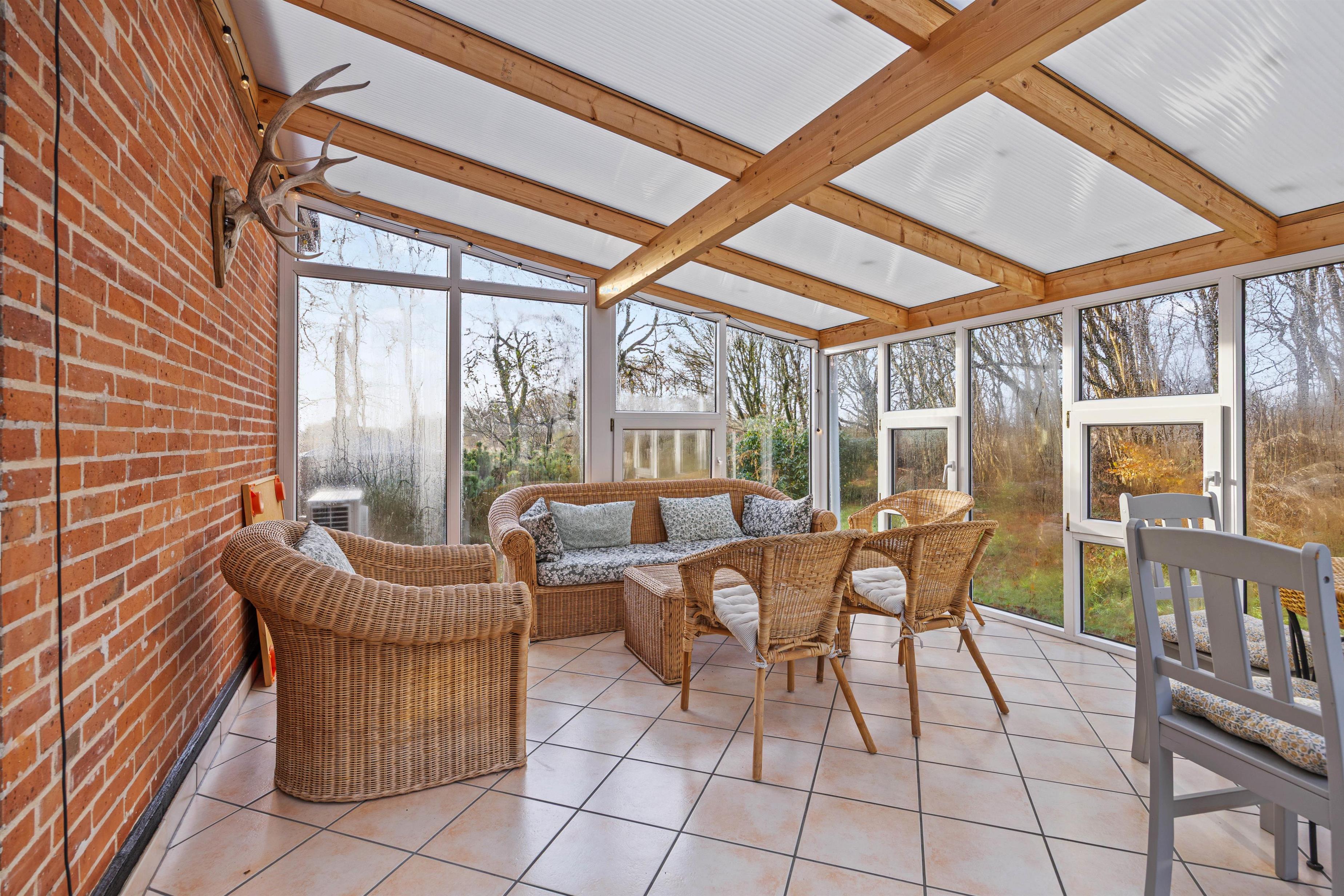 Fra opholdsrummet kan I træde ud i den hyggelige udestue. Herfra har I en skøn udsigt til den smukke omkringliggende natur, og her kan I nyde en god bog, et godt glas vin eller samles til et spil kort omkring bordet.