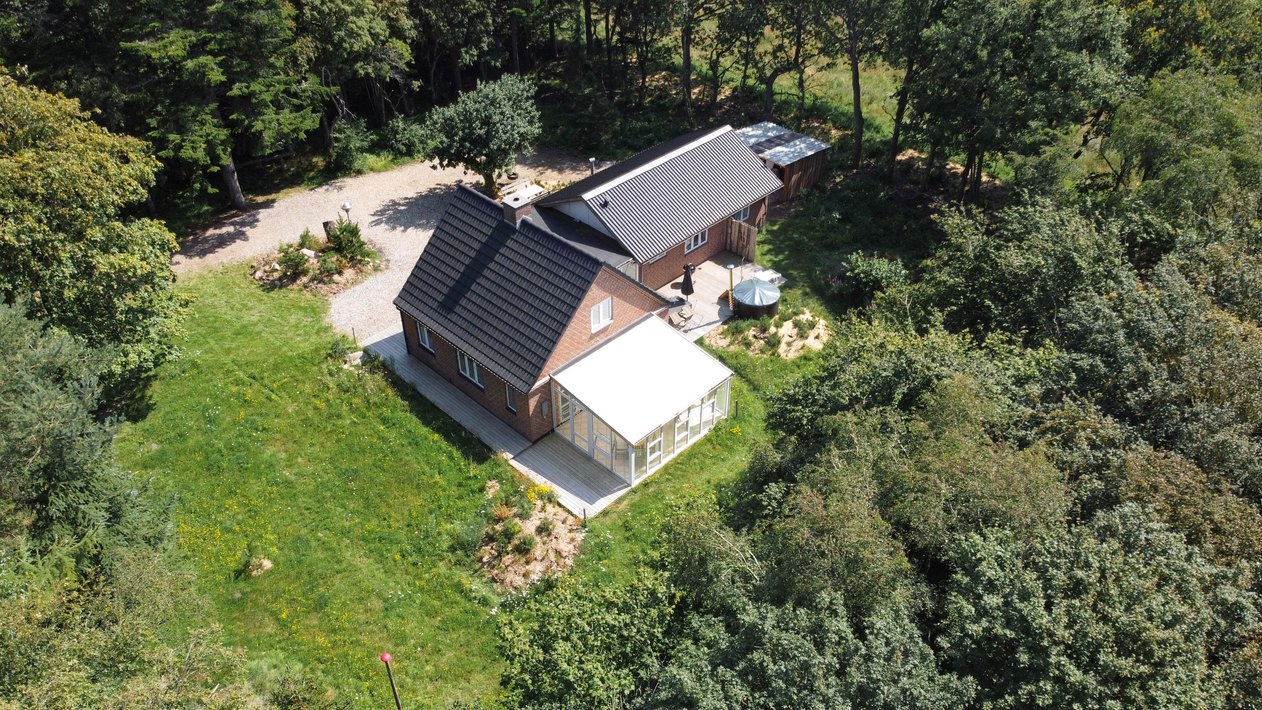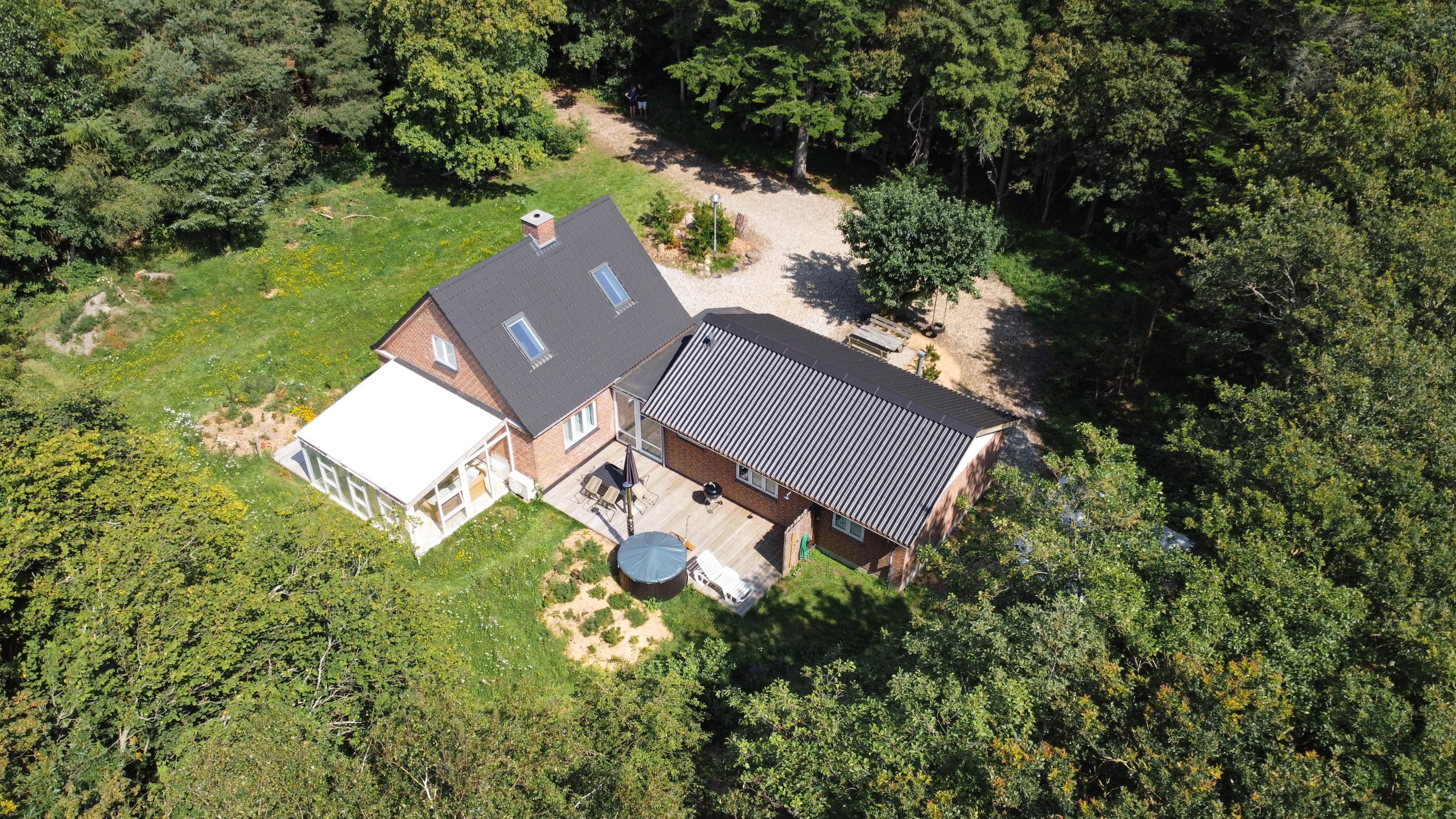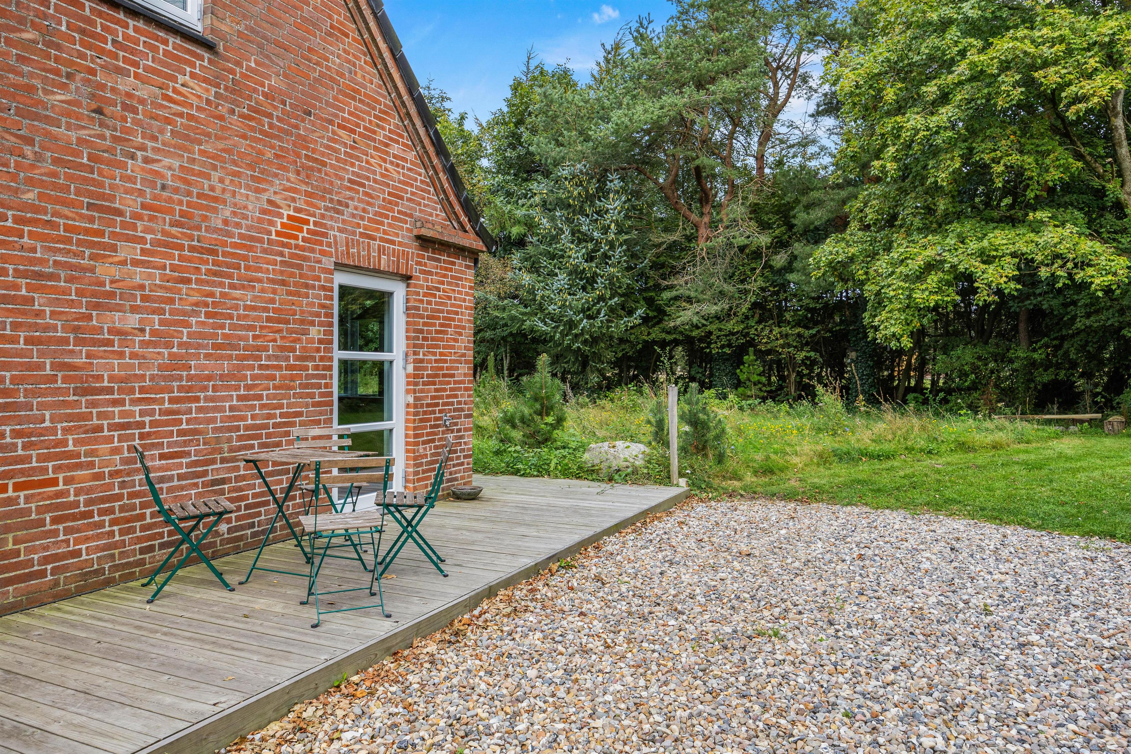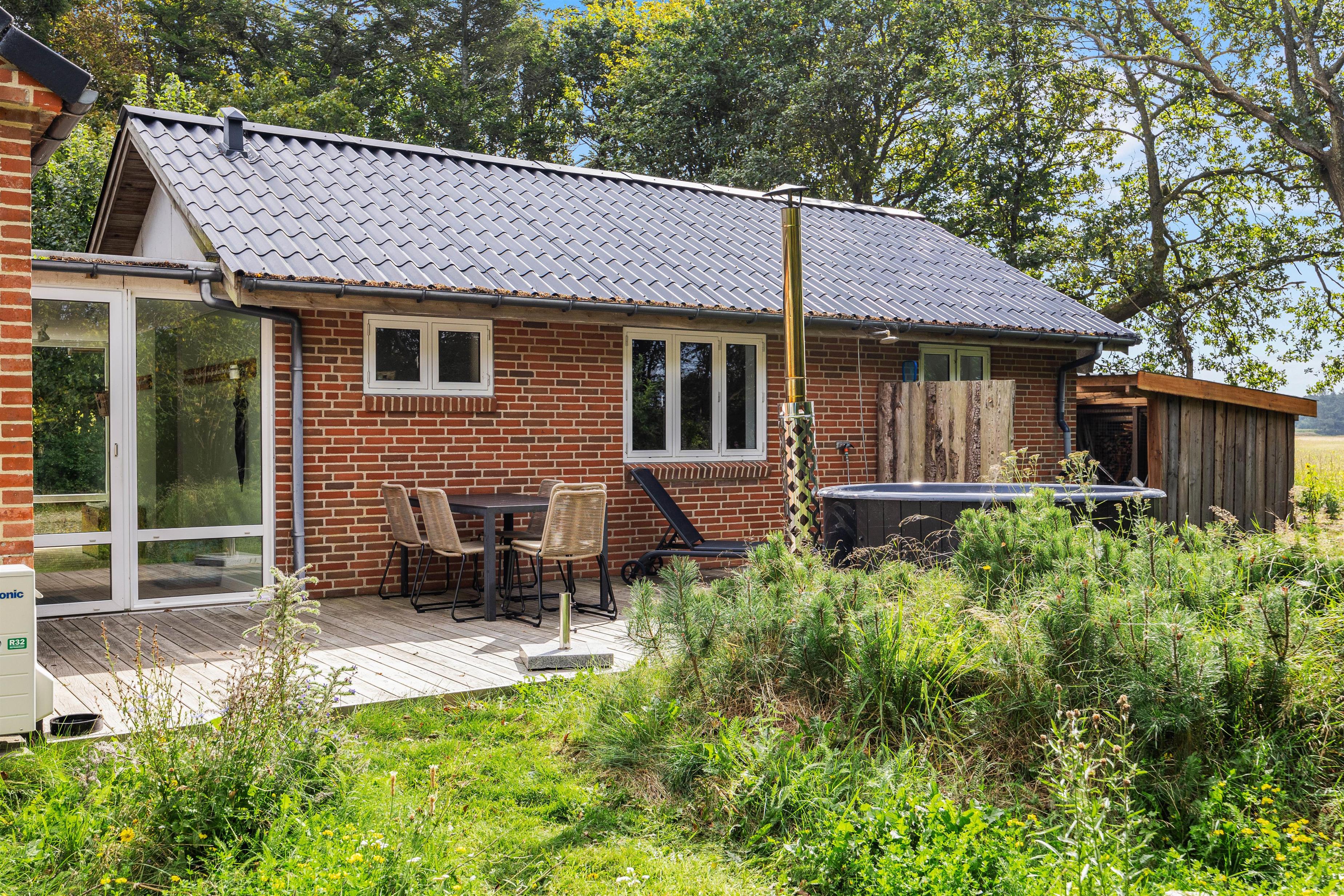 Sommerhuset ligger på en skøn uforstyrret naturgrund, hvor I kan holde ferie i ro og mag. Den skønne natur og de rolige omgivelser kan I nyde på sommerhusets to terrasser, hvor I har havemøbler, liggestole og grill til rådighed, så I kan få mest muligt ud af de varme sommerdage. Efter en hyggelig grillmiddag på terrassen kan I rykke over til bålstedet og riste skumfiduser, mens dagen så småt går på hæld.