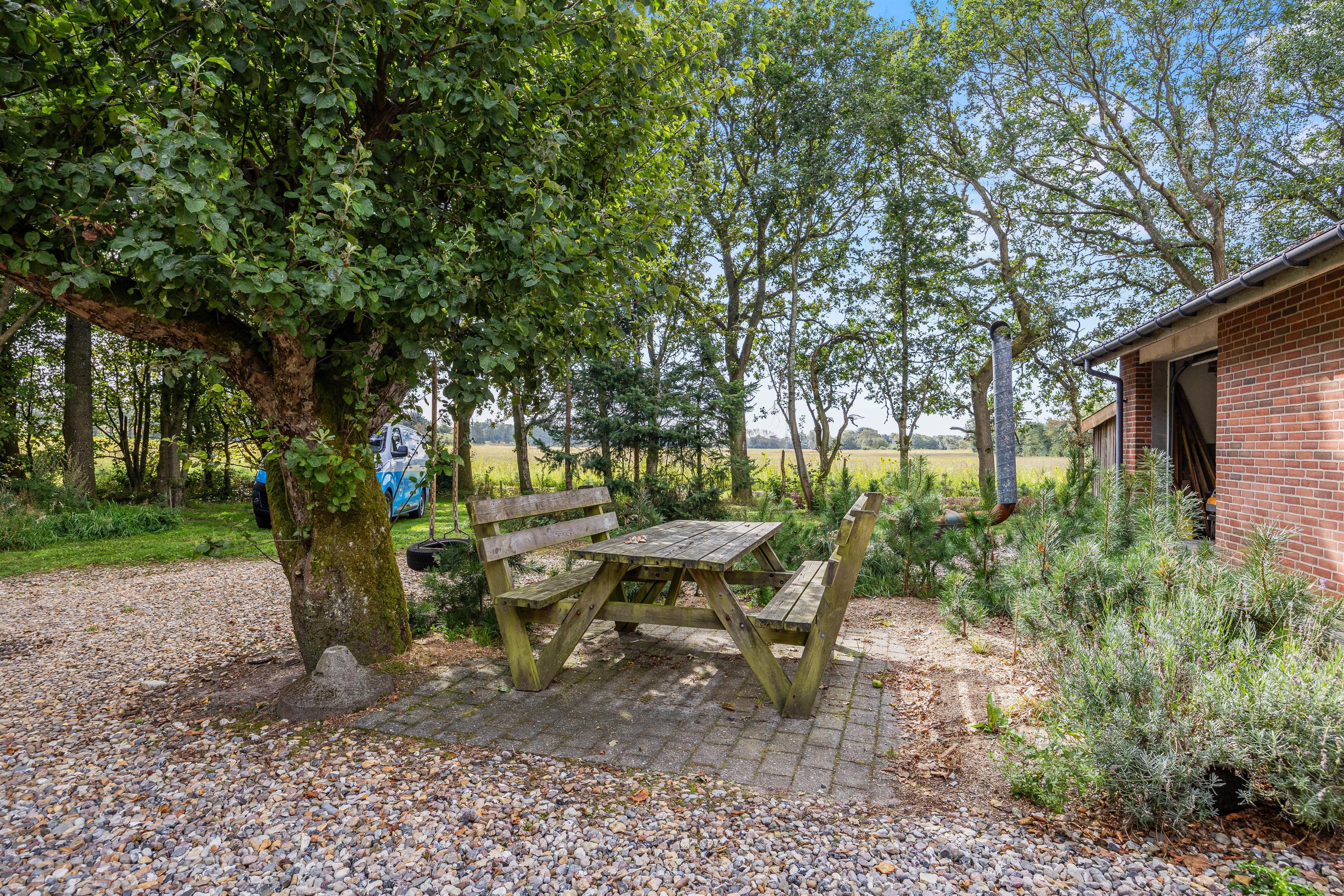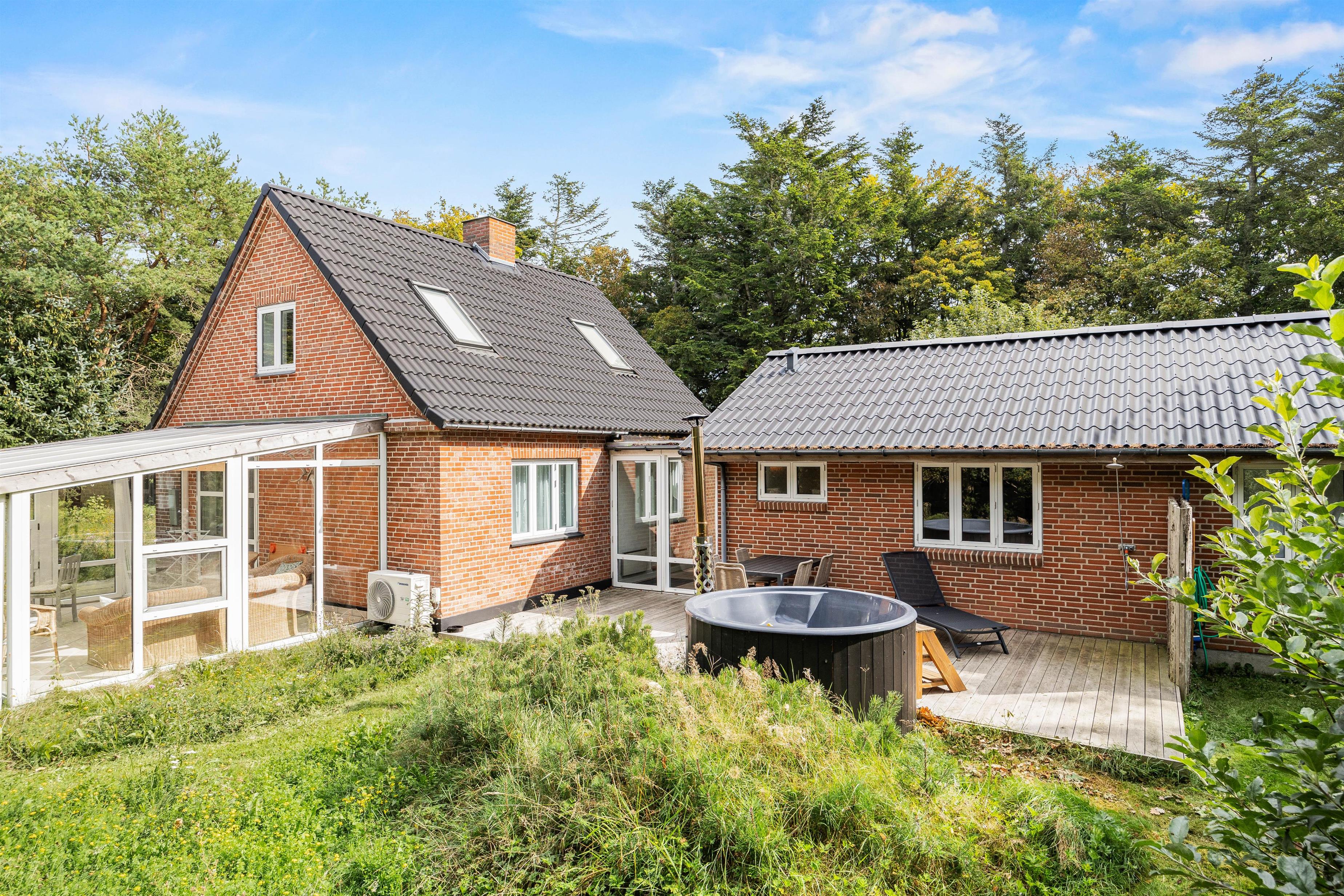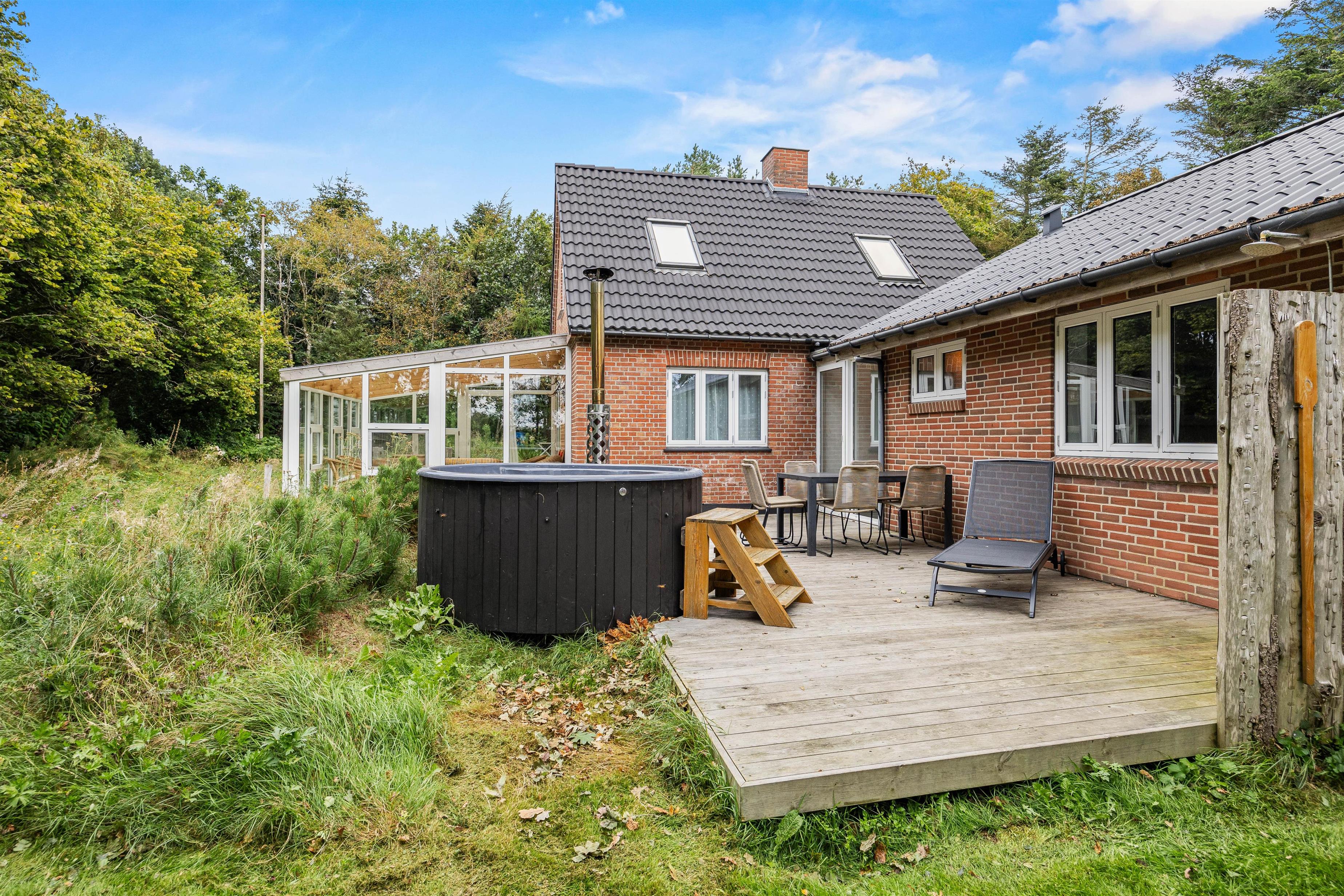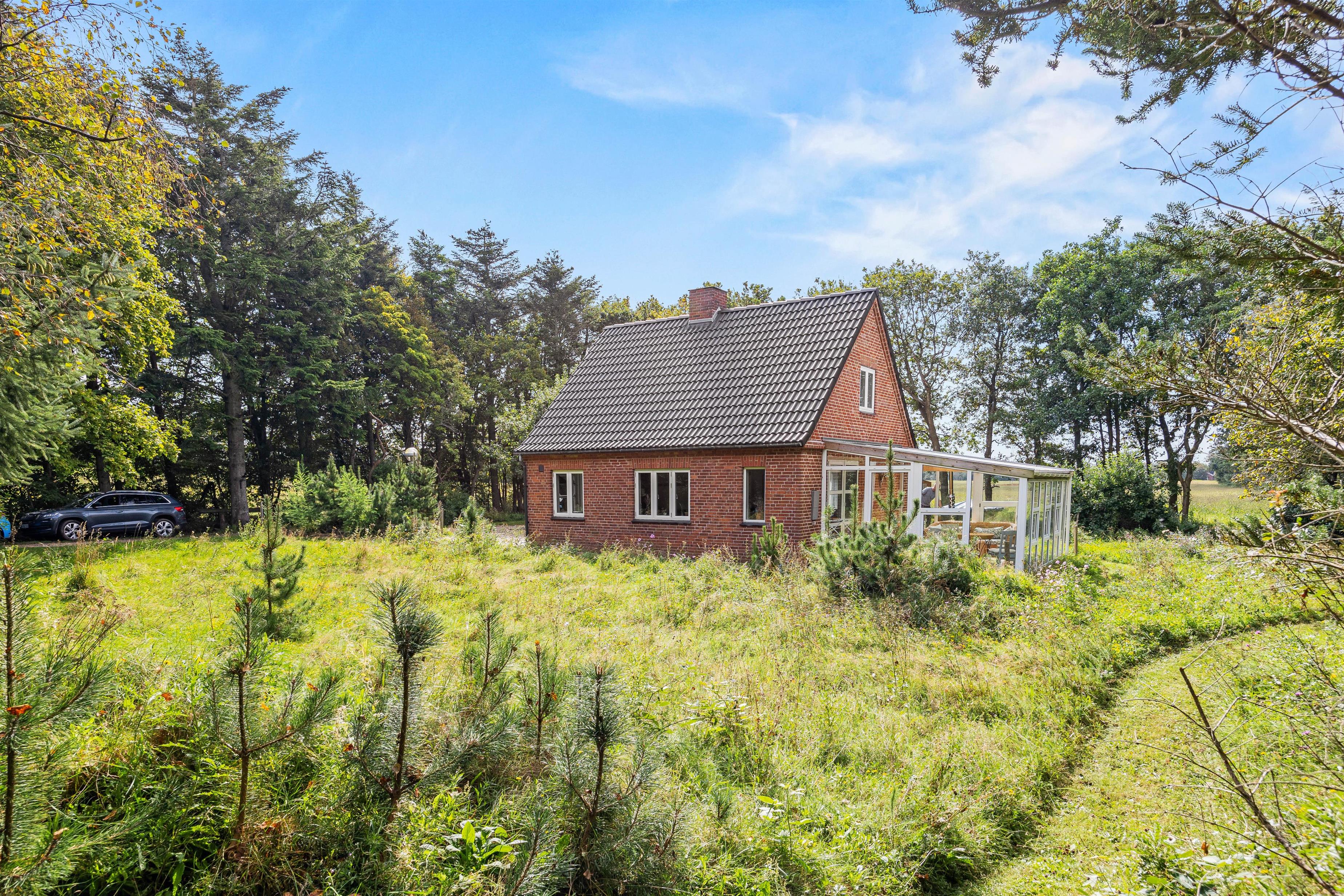 Sommerhuset ligger på en skøn uforstyrret naturgrund, hvor I kan holde ferie i ro og mag. Den skønne natur og de rolige omgivelser kan I nyde på sommerhusets to terrasser, hvor I har havemøbler, liggestole og grill til rådighed, så I kan få mest muligt ud af de varme sommerdage. Efter en hyggelig grillmiddag på terrassen kan I rykke over til bålstedet og riste skumfiduser, mens dagen så småt går på hæld.