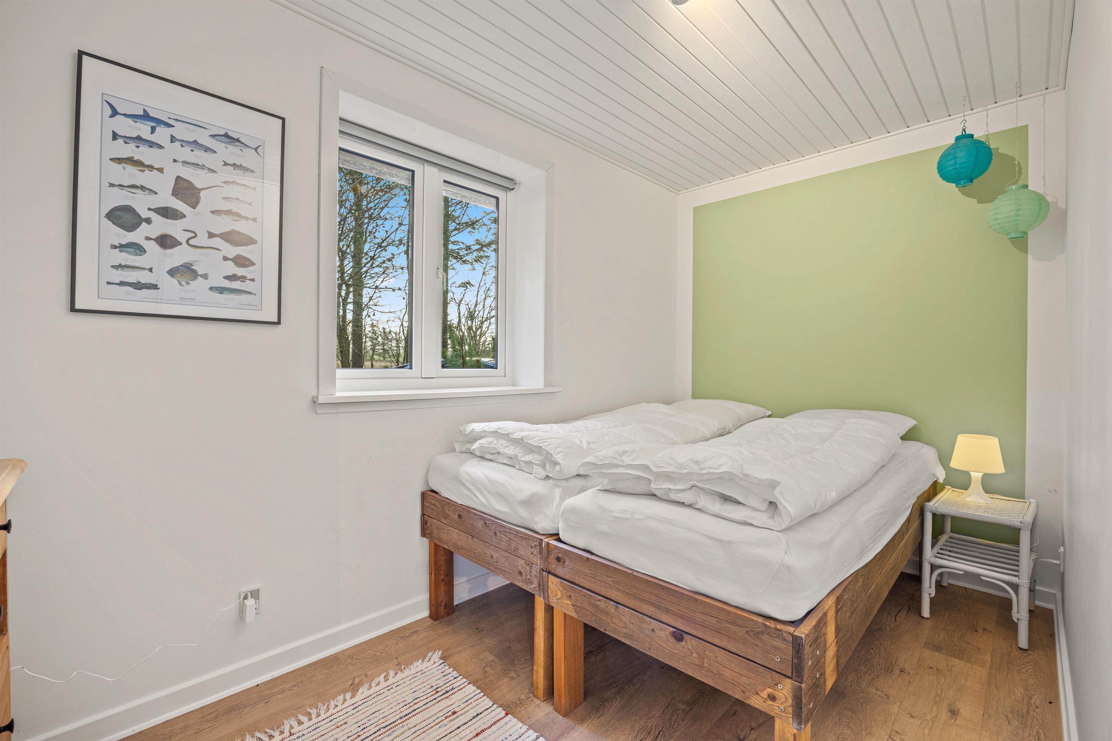 3 lyse soveværelser, alle med dobbeltsenge, er at finde i sommerhuset, hvoraf 2 af dem befinder sig i stueetagen og det tredje ligger på førstesalen. I stueetagen er også badeværelset, der er udstyret med gulvvarme.