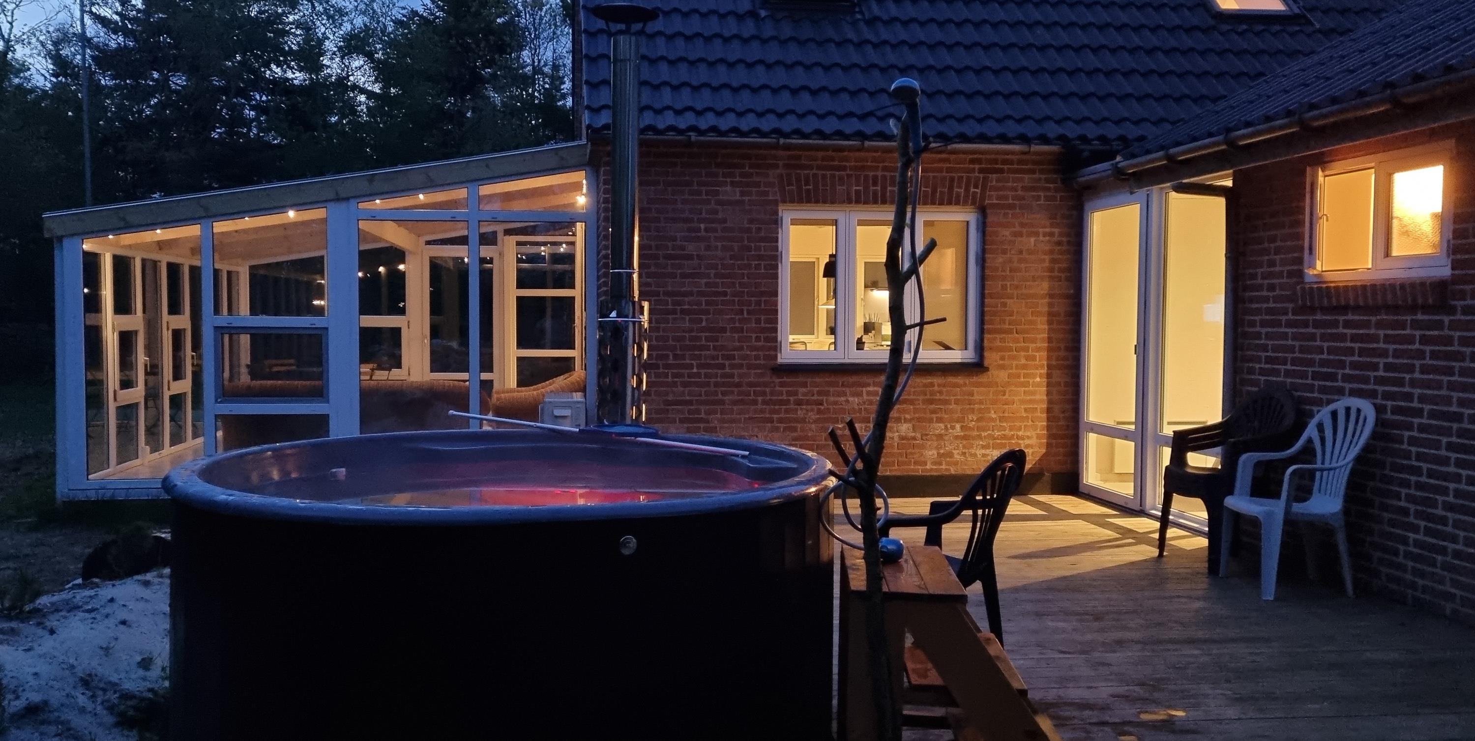 På den ene af terrasserne finder I sommerhusets helt store højdepunkt – nemlig vildmarksbadet, hvor der er plads til alle 6 feriegæster. En tur i vildmarksbadet er perfekt på alle tider af døgnet og året, men især om aftenen er det en helt særlig oplevelse. Her kan I kigge op på stjernehimlen, mens I læner jer tilbage og slapper af i det varme vand. Og skulle det blive for varmt, kan I nemt køle jer af under udendørs-bruseren*.