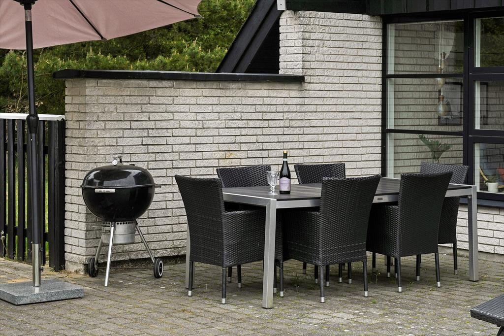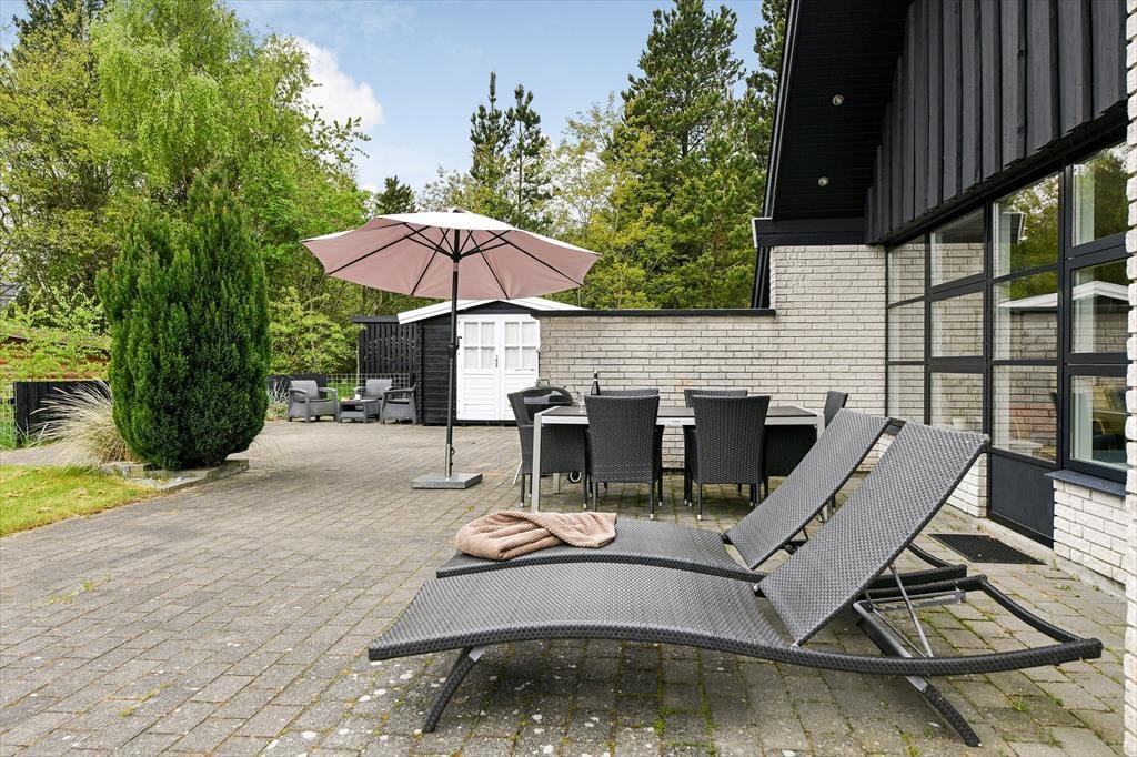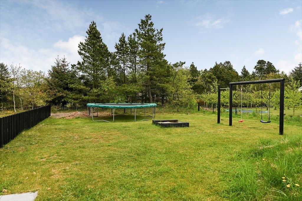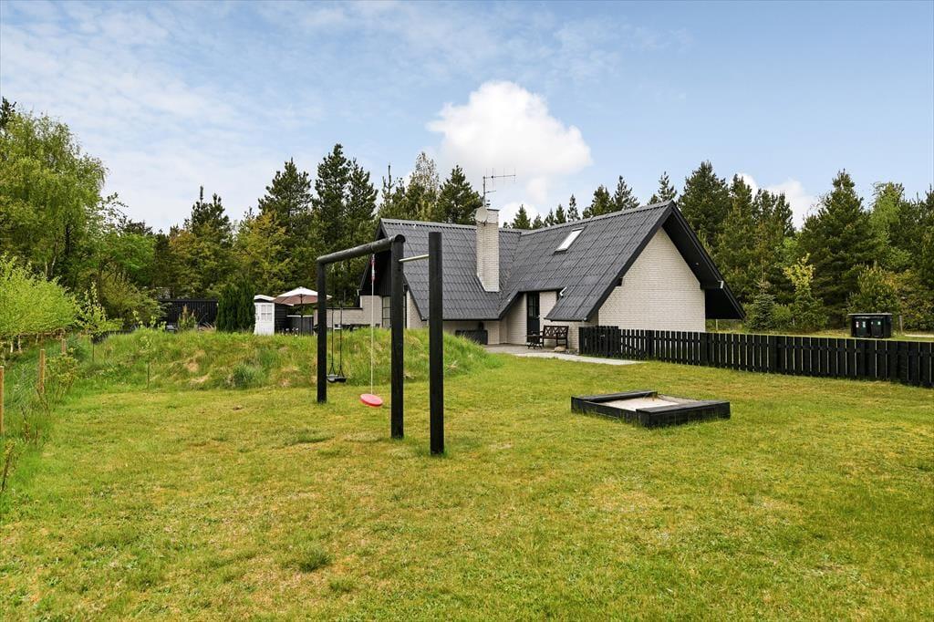 Udenfor venter en skøn, sydvendt terrasse med flere små hyggekroge, hvor du kan læne dig tilbage og nyde solen fra morgen til aften. Den store, indhegnede grund gør det oplagt at tage hunden med på ferie – her er masser af plads at boltre sig på uden bekymringer. Børnene vil elske haven, hvor der både er gynge, trampolin og sandkasse, som indbyder til leg og latter fra morgen til aften. Mens de små bygger sandslotte, kan du finde dig til rette i en liggestol og mærke roen brede sig. Terrassen er det perfekte sted til både morgenkaffe og aftenhygge – måske med et glas vin, mens grillen bliver varm og solnedgangen farver himlen i varme nuancer. Her får I privatliv og fred midt i naturen, med lyden af fuglesang og duften af skov omkring jer.