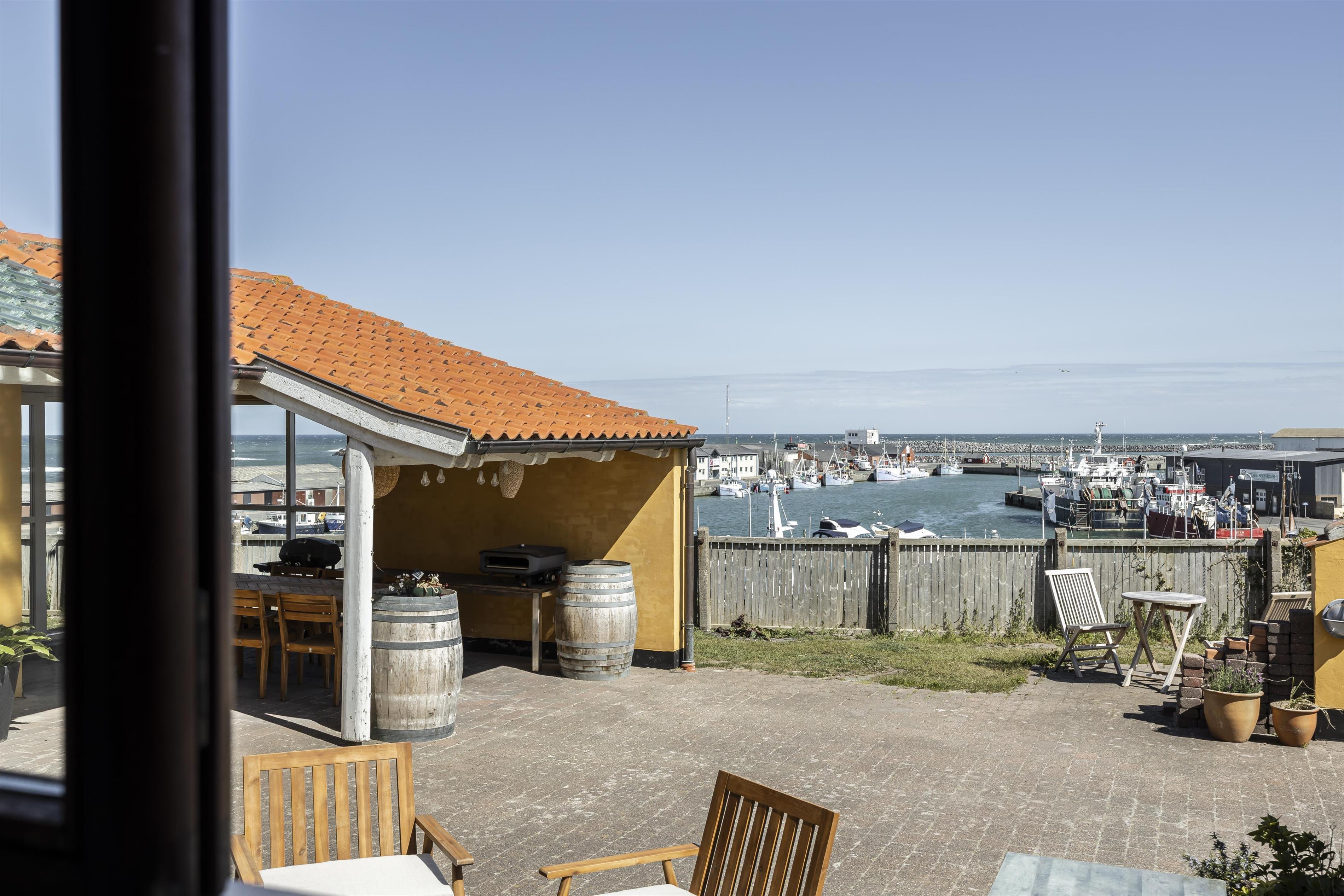 Selvom huset ligger midt i Hirtshals by, er der mulighed for ro og privatliv på de skønne terrasser. Den ene terrasse er overdækket og byder på læ, så du kan nyde udelivet i al slags vejr. Terrassen vender væk fra byens liv, hvilket gør det muligt at slappe af helt ugeneret med udsigt til havet og havnens stemningsfulde liv. Her kan du nyde din morgenkaffe eller et glas vin i aftensolen, mens du følger skibene og færgerne sejle ind og ud af havnen.