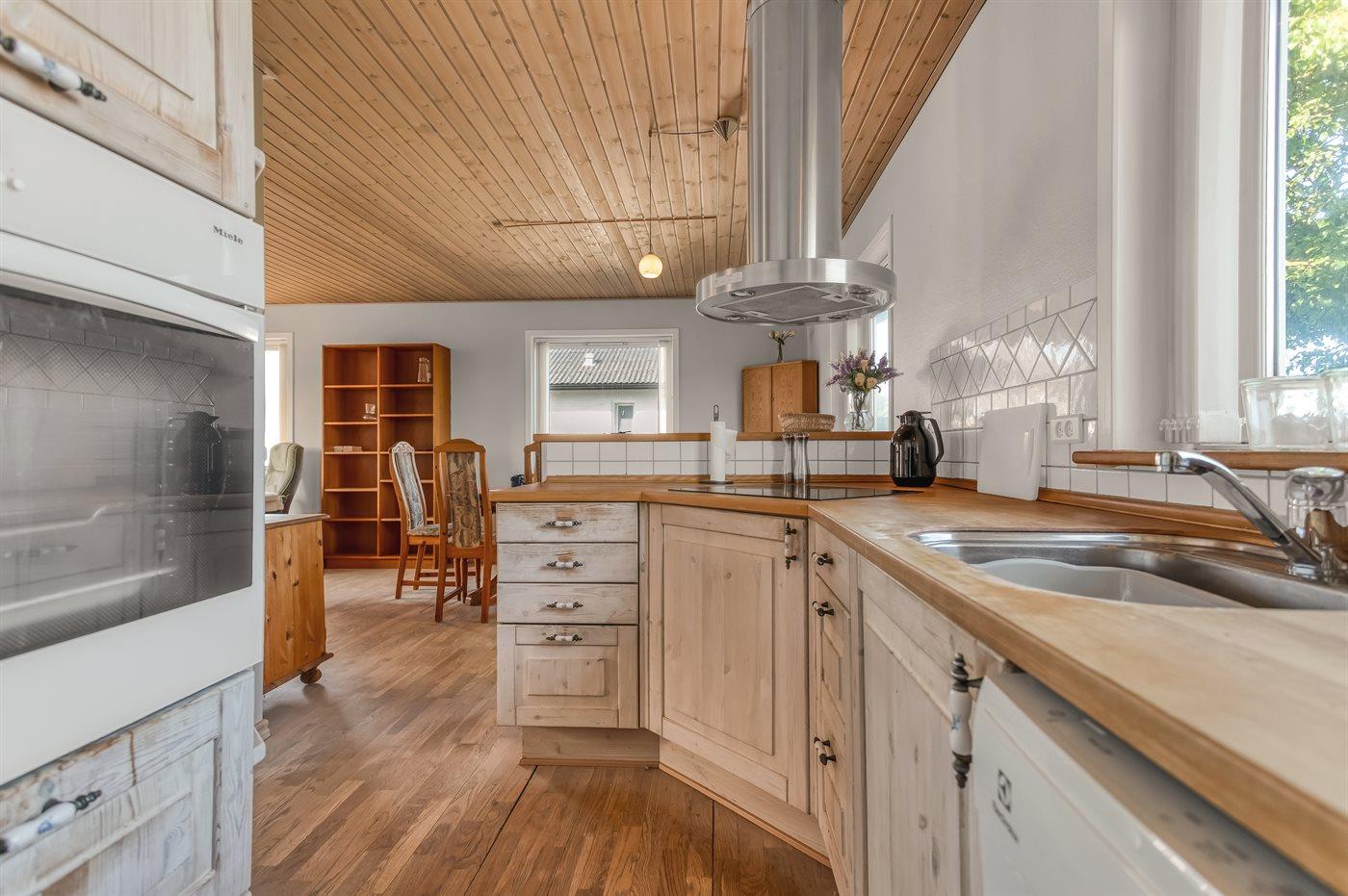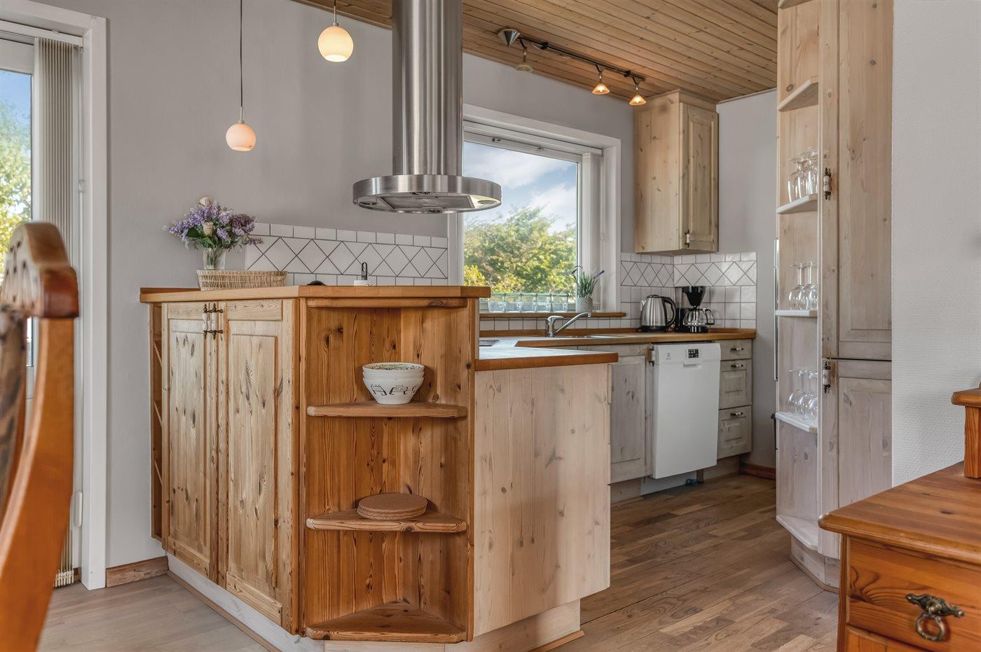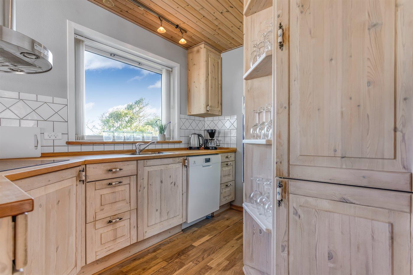 Køkkenet er udstyret med 1 køleskab. Der er 4 induktionskogeplader, varmluftovn samt opvaskemaskine.