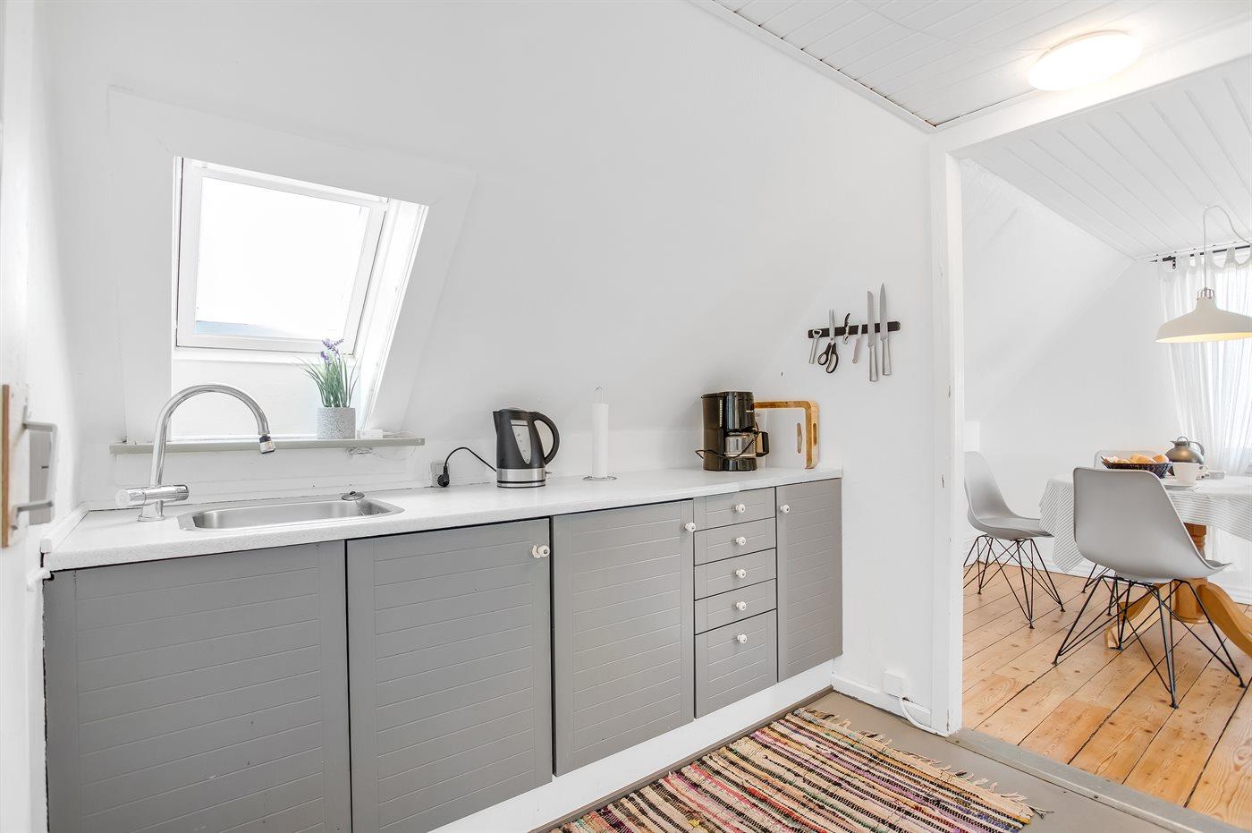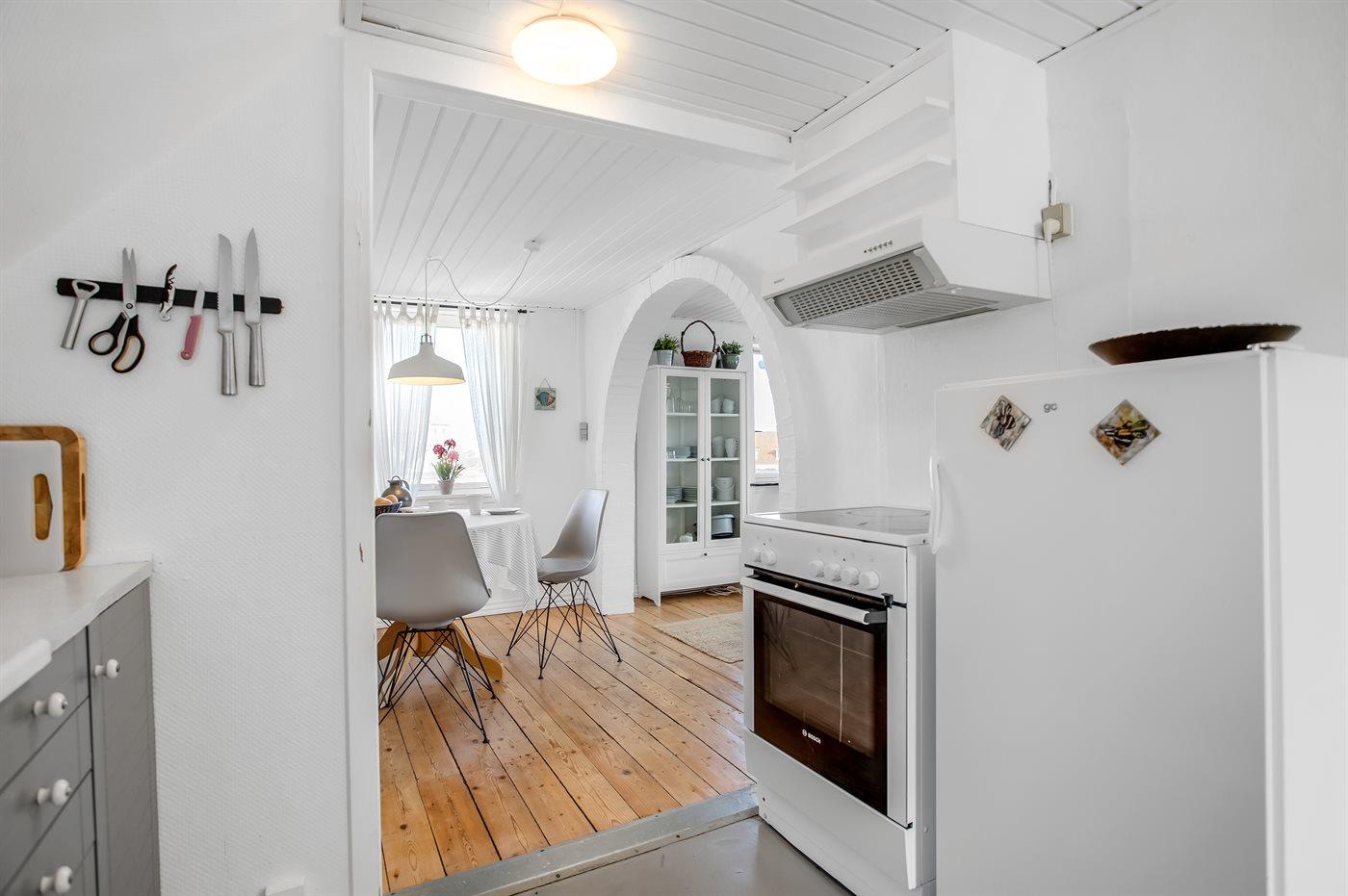 Køkkenet er udstyret med 1 køleskab. Der er 4 keramiske kogeplader, varmluftovn.