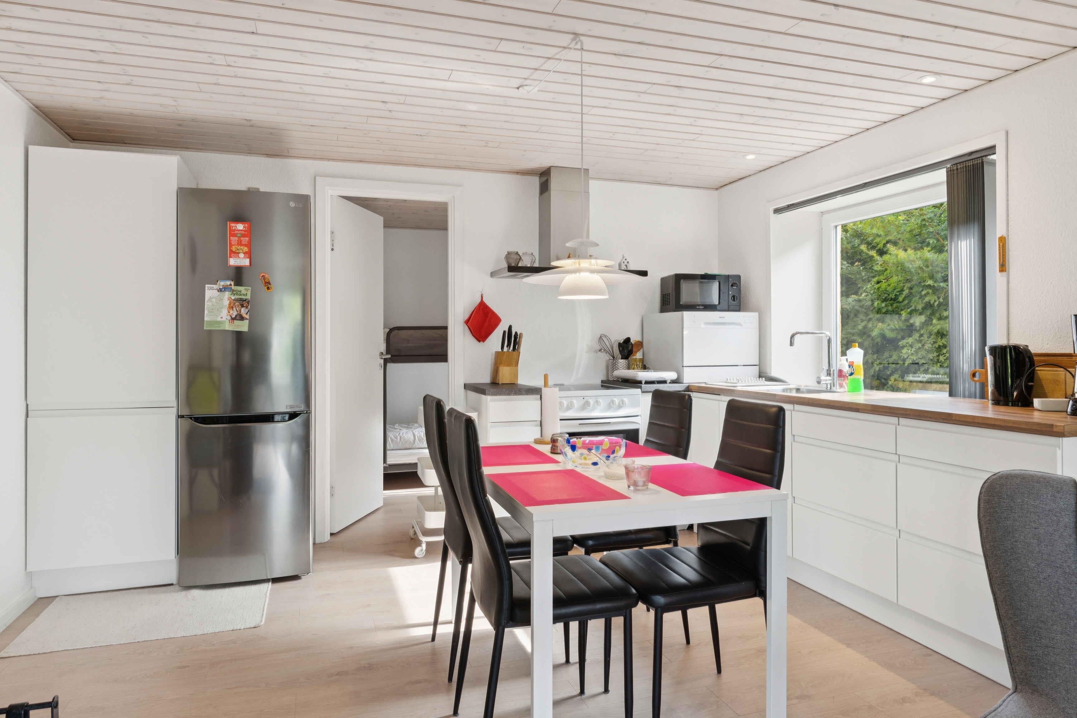 Dette sommerhus på 96 m² er et oplagt valg til en afslappende ferie med familie eller venner. Huset rummer to soveværelser og fire sovepladser og giver jer en god base med ro og plads til at nyde ferien både inde og ude. Indretningen er enkel og personlig med åbent køkken-alrum, god spiseplads og en stue. Der er direkte udgang til terrasse, hvor I kan nyde solen og måltiderne i det fri. Boligen har både vaskemaskine og opvaskemaskine, så praktikken glider let i ferien. Derudover er der fri adgang til brænde. Beliggenheden inviterer til naturferie i det nordjyske. Her er I tæt på Hjørrings handelsliv, men stadig med god afstand til trafik og støj. I nærområdet er der mulighed for vandreture, cykling og naturoplevelser i rolige omgivelser. 14 km mod vest venter Vesterhavet og nogle af Danmarks flotteste sandstrande. Her er badevandet klart, og der er god plads til leg, afslapning og lange gåture. Området byder også på charmerende kystbyer som Lønstrup og Løkken med kunsthåndværk, isboder og lokale caféer. Sommerhuset er velegnet til jer, der søger fredelige omgivelser og et godt udgangspunkt for at opleve det bedste af Nordjylland. Her er hverken for langt til byliv eller natur – og masser af muligheder for at gøre ferien til jeres egen. Obs, udlejes ikke til erhversmæssigt brug.