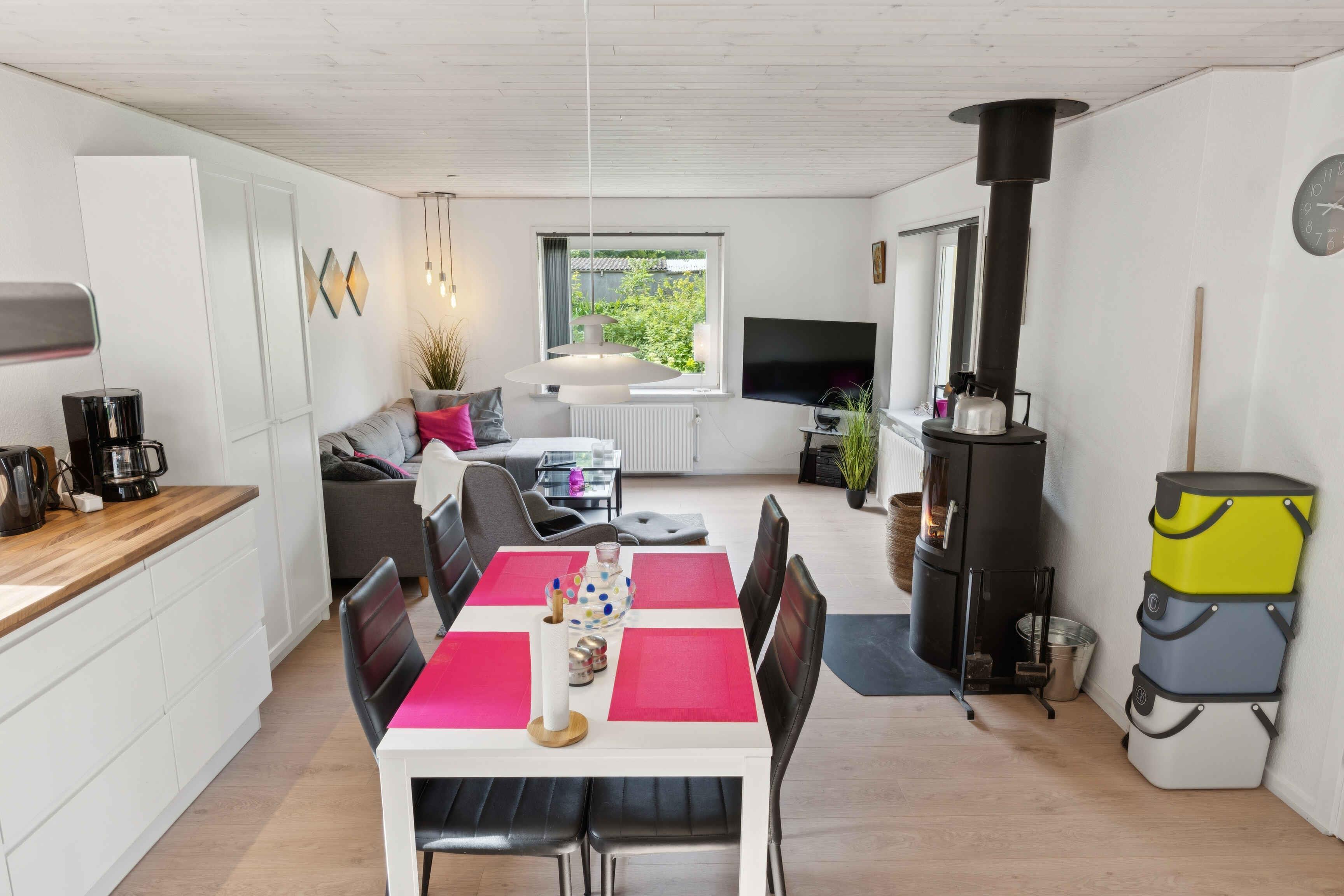 Personligt sommerhus på 96 m² med 2 soveværelser, terrasse, vaskemaskine, opvaskemaskine og tilgængeligt brænde. Fredelig beliggenhed tæt på natur, strand og hyggelige byer.