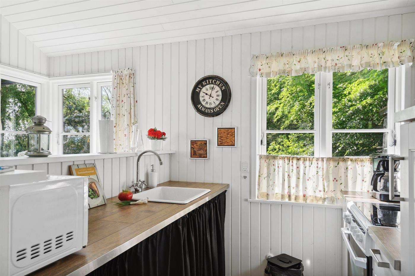 Køkkenet er udstyret med 1 køleskab. Der er 4 keramiske kogeplader, varmluftovn, mikrobølgeovn.