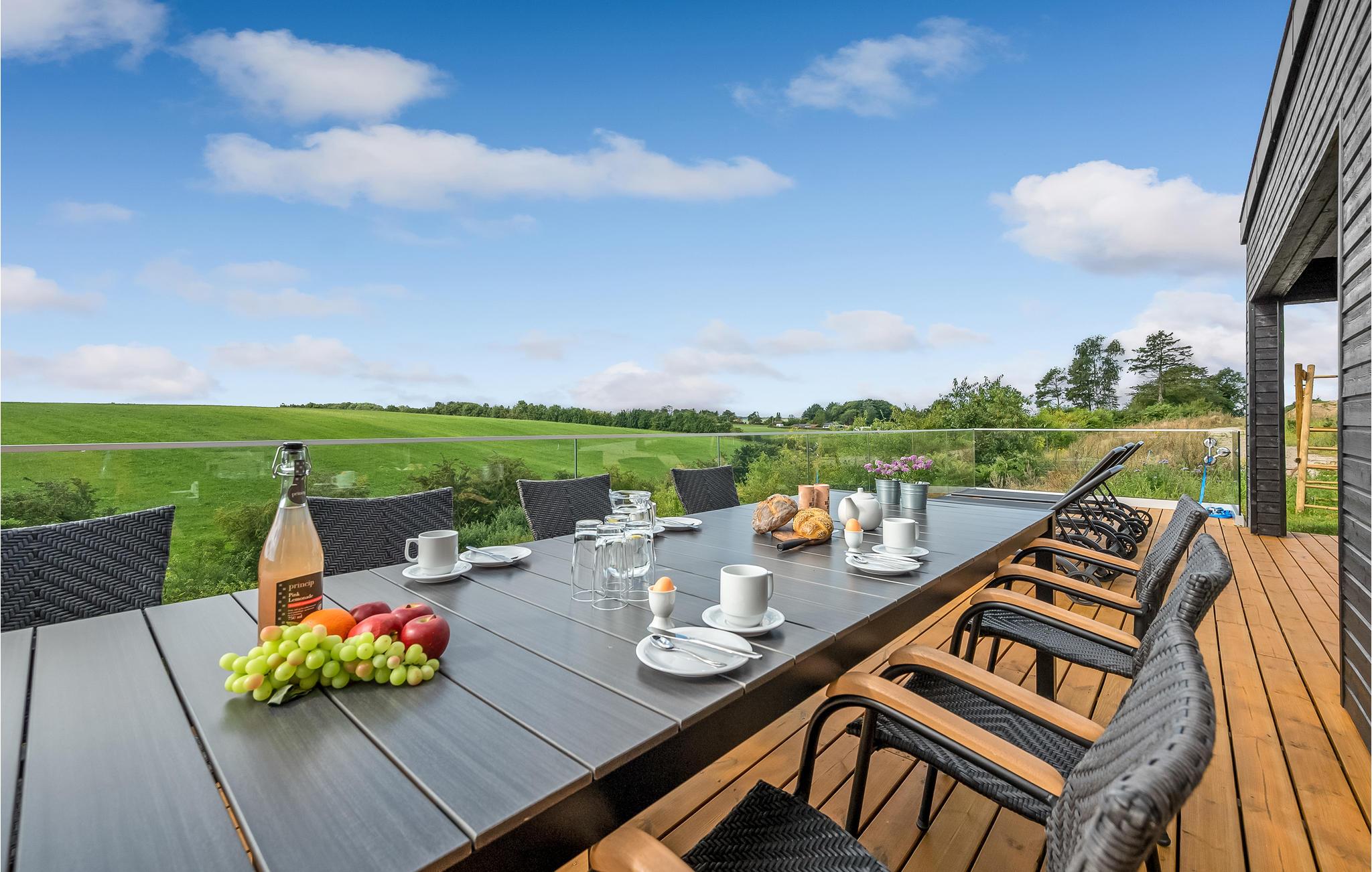Moderne sommerhus nær Hjarbæk Fjord med boblebad, legeplads og naturskønne omgivelser.