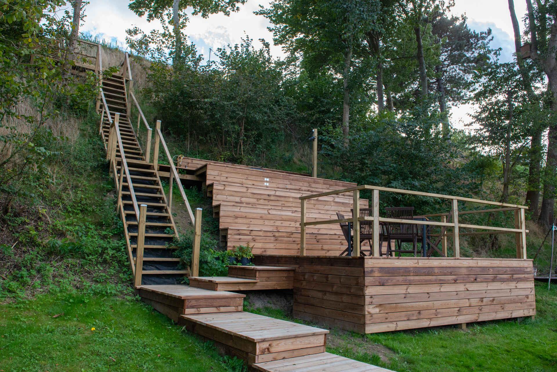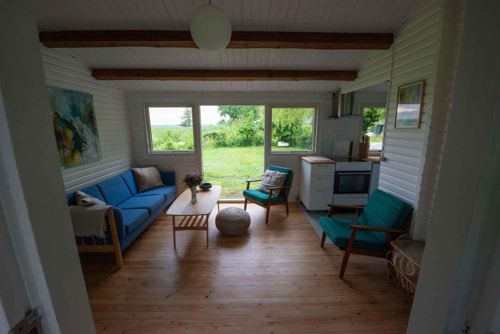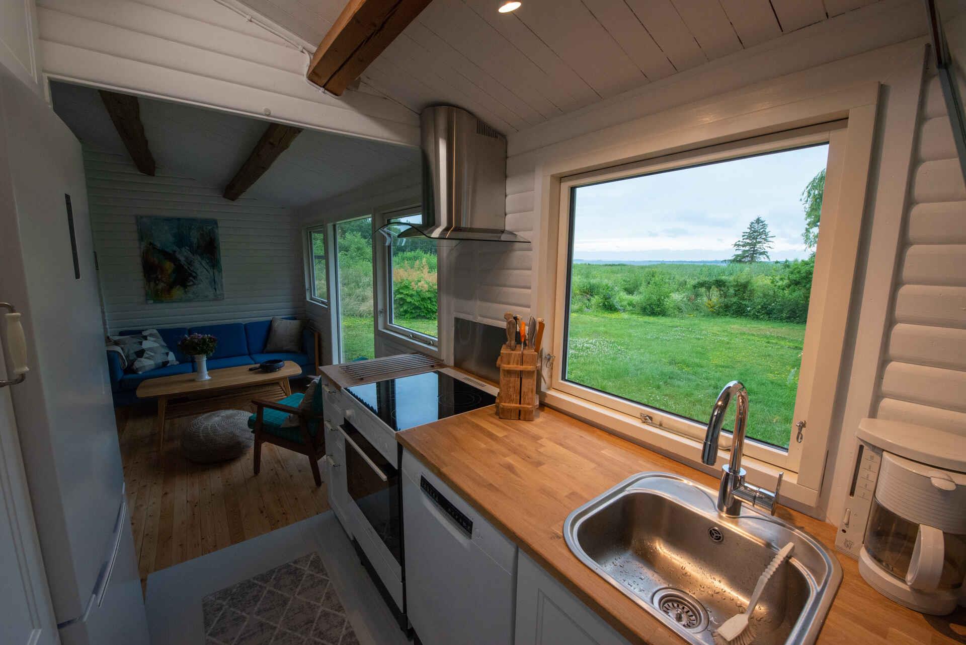 Hyggeligt bjælkehus med vildmarksbad og panoramaudsigt over Lammefjorden, tæt på Kisserup Strand og natur.