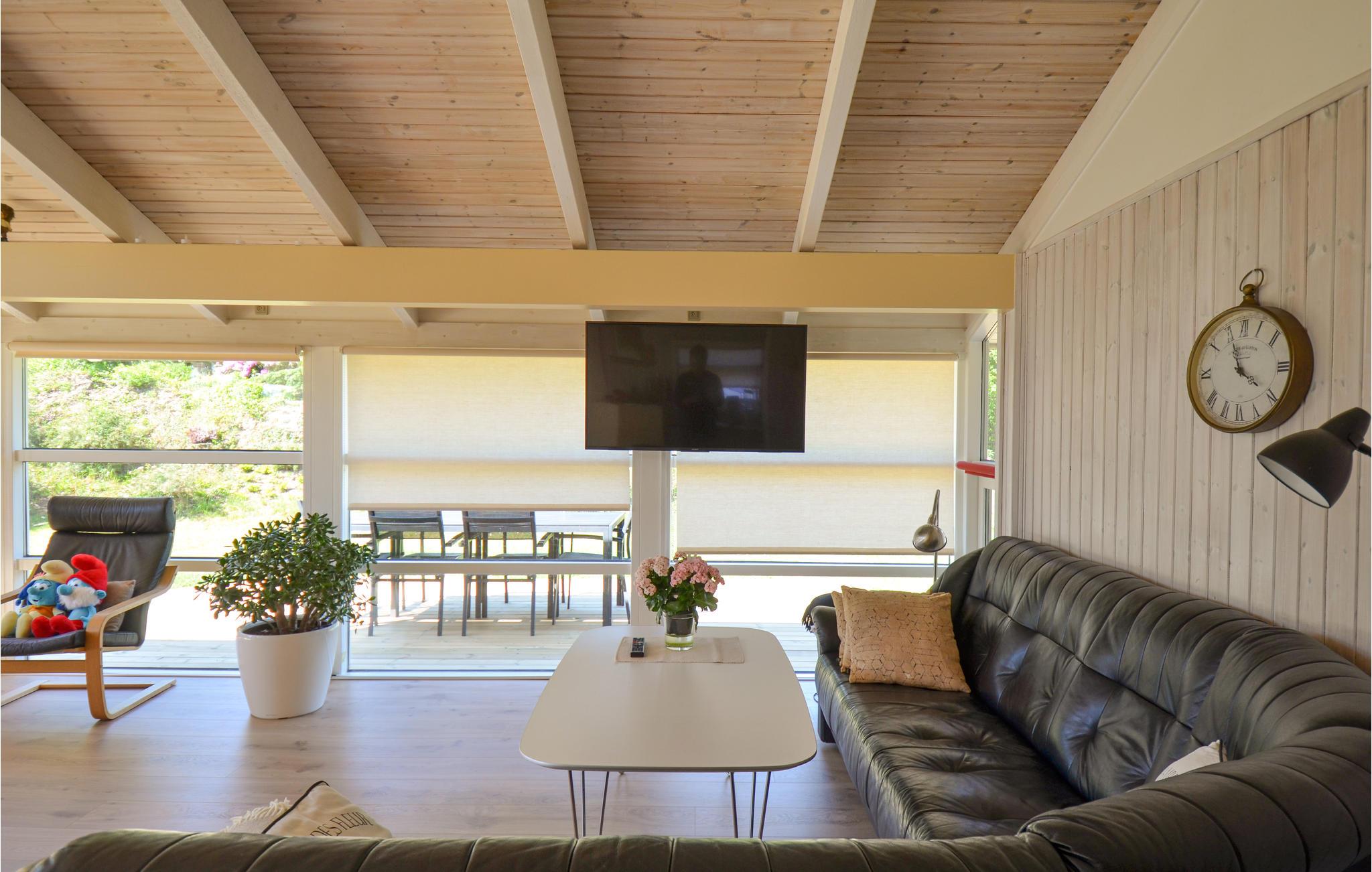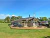 Hyggeligt træhus nær Holme Strand med spa, sauna og stor terrasse til afslapning og aktiviteter.
