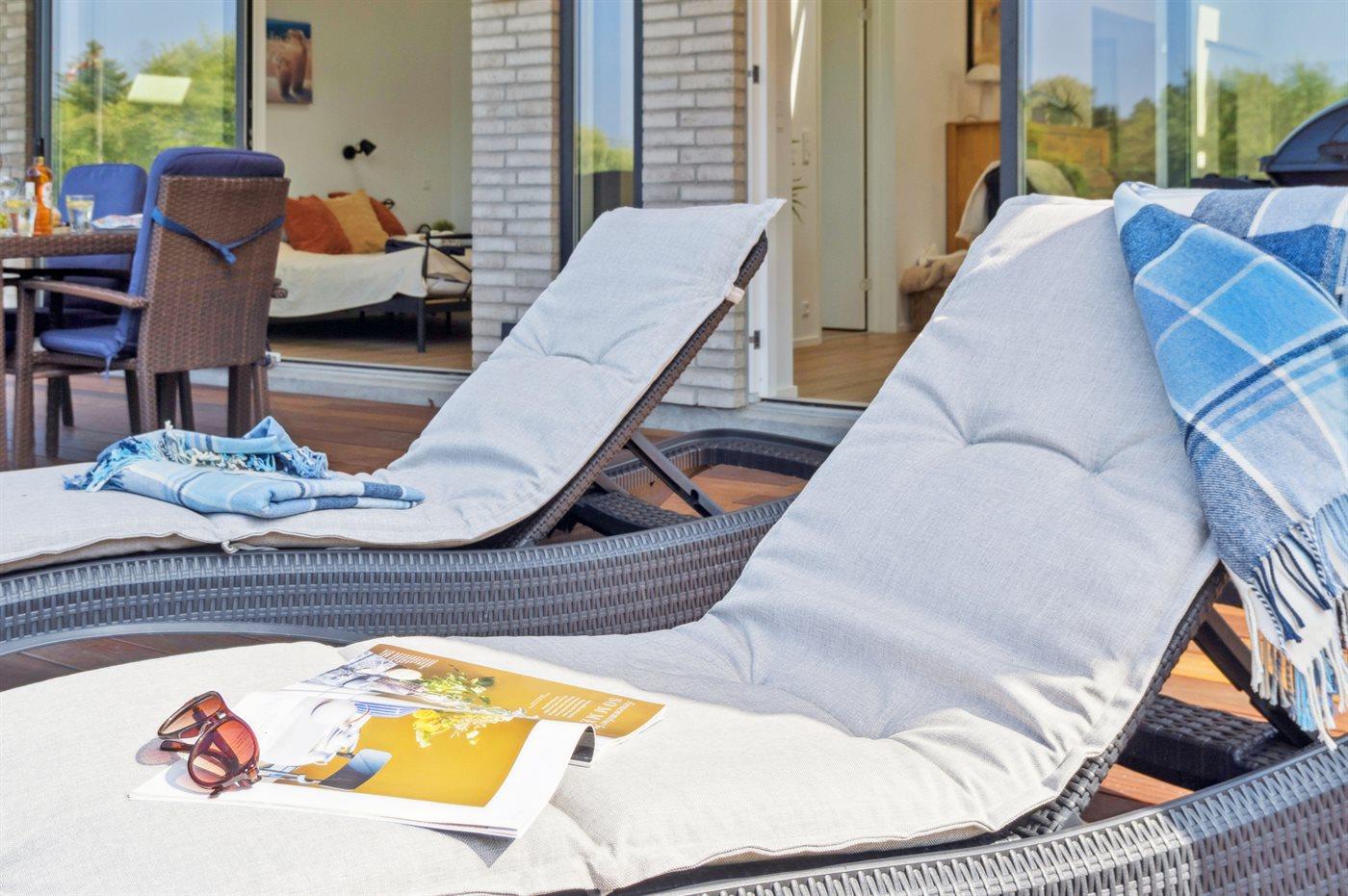 Udendørs finder du en stor træterrasse og en have, hvor solen kan nydes hele dagen. Her er plads til afslapning, grill og leg i fredelige omgivelser.