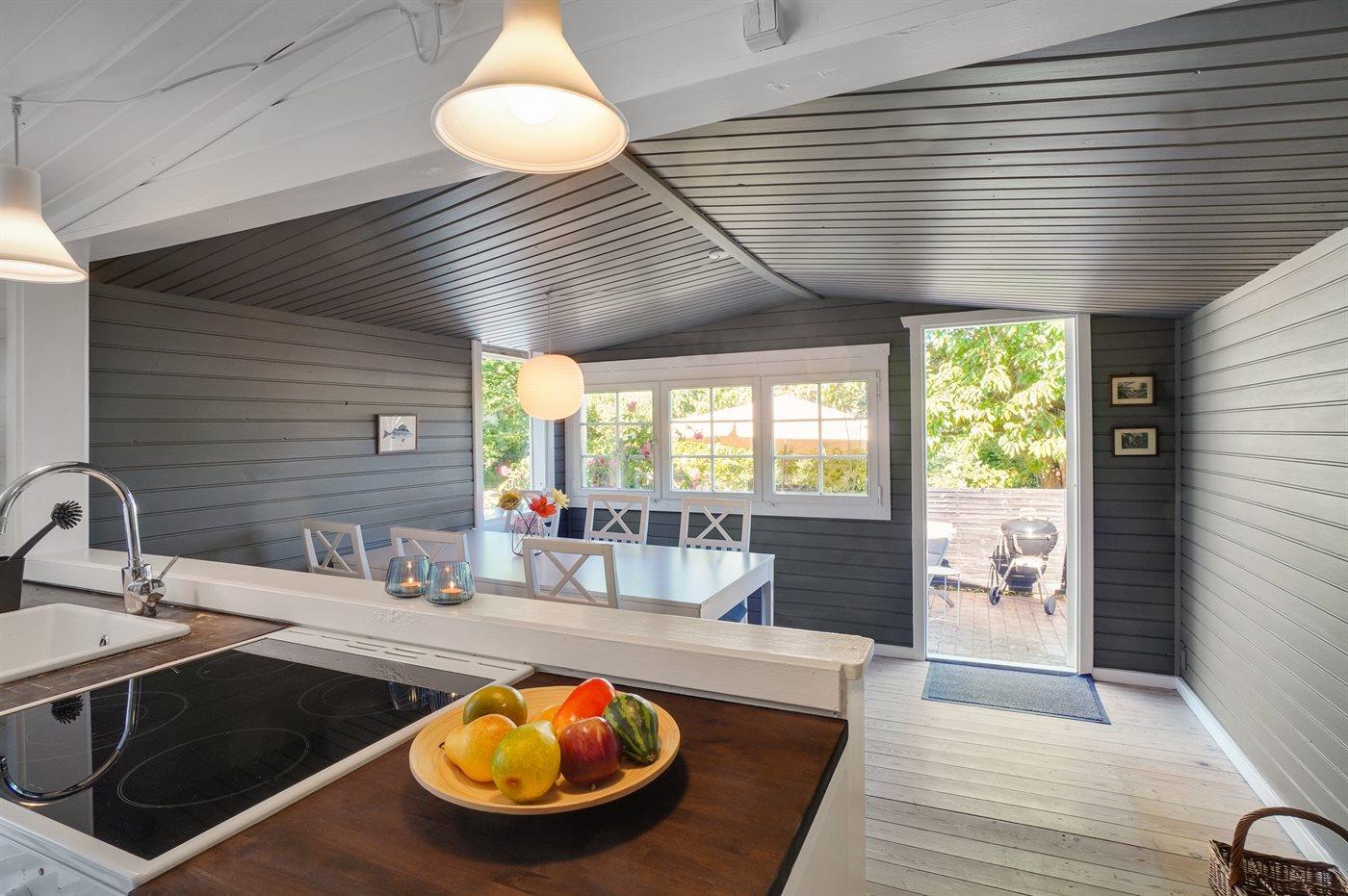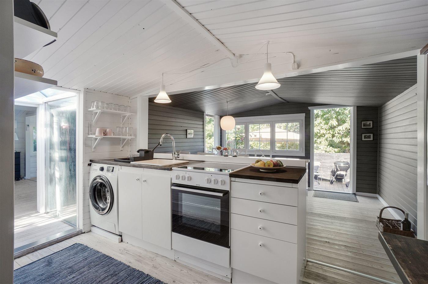 Køkkenet er udstyret med 1 køleskab. Der er 4 keramiske kogeplader, varmluftovn.