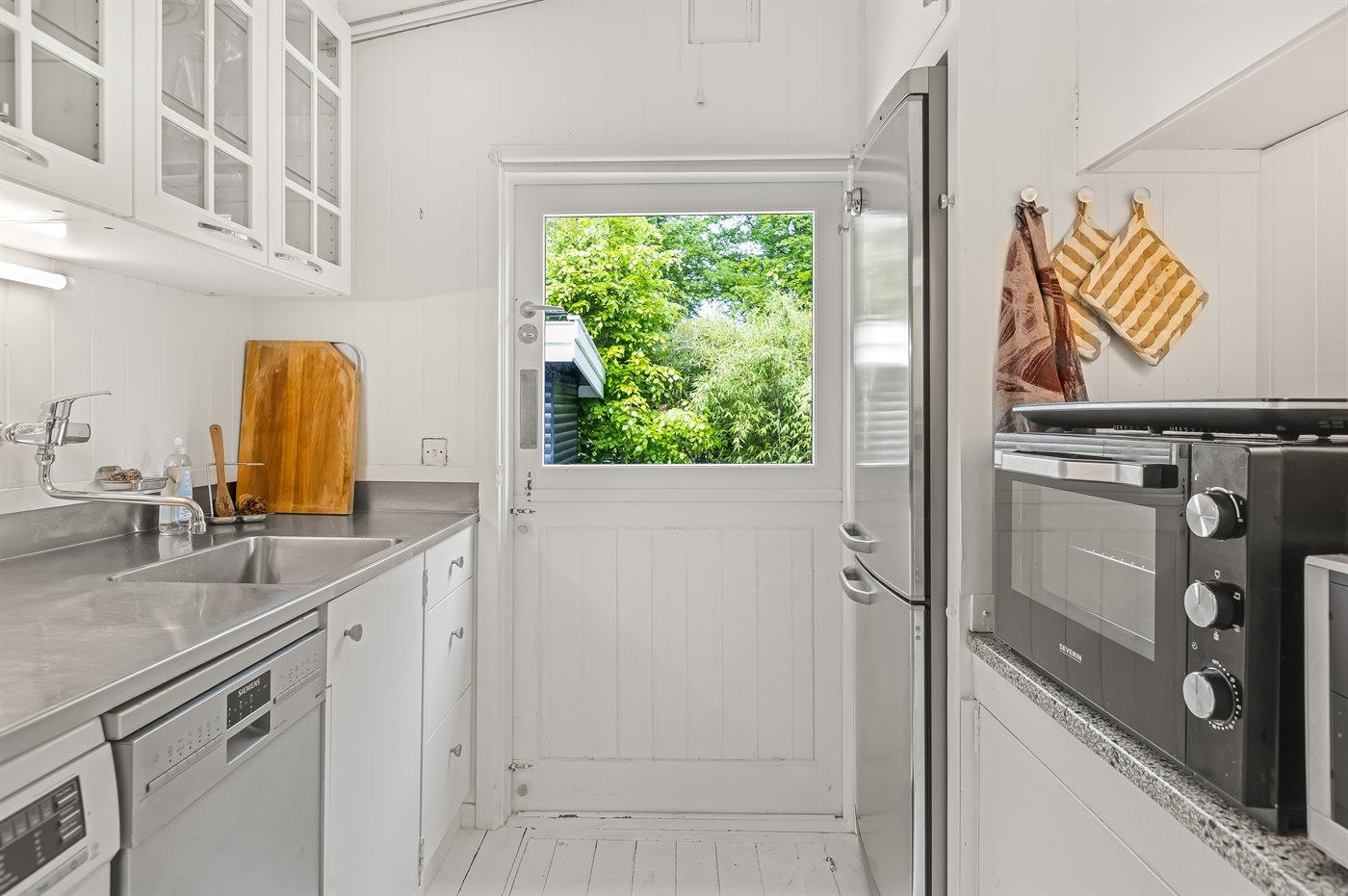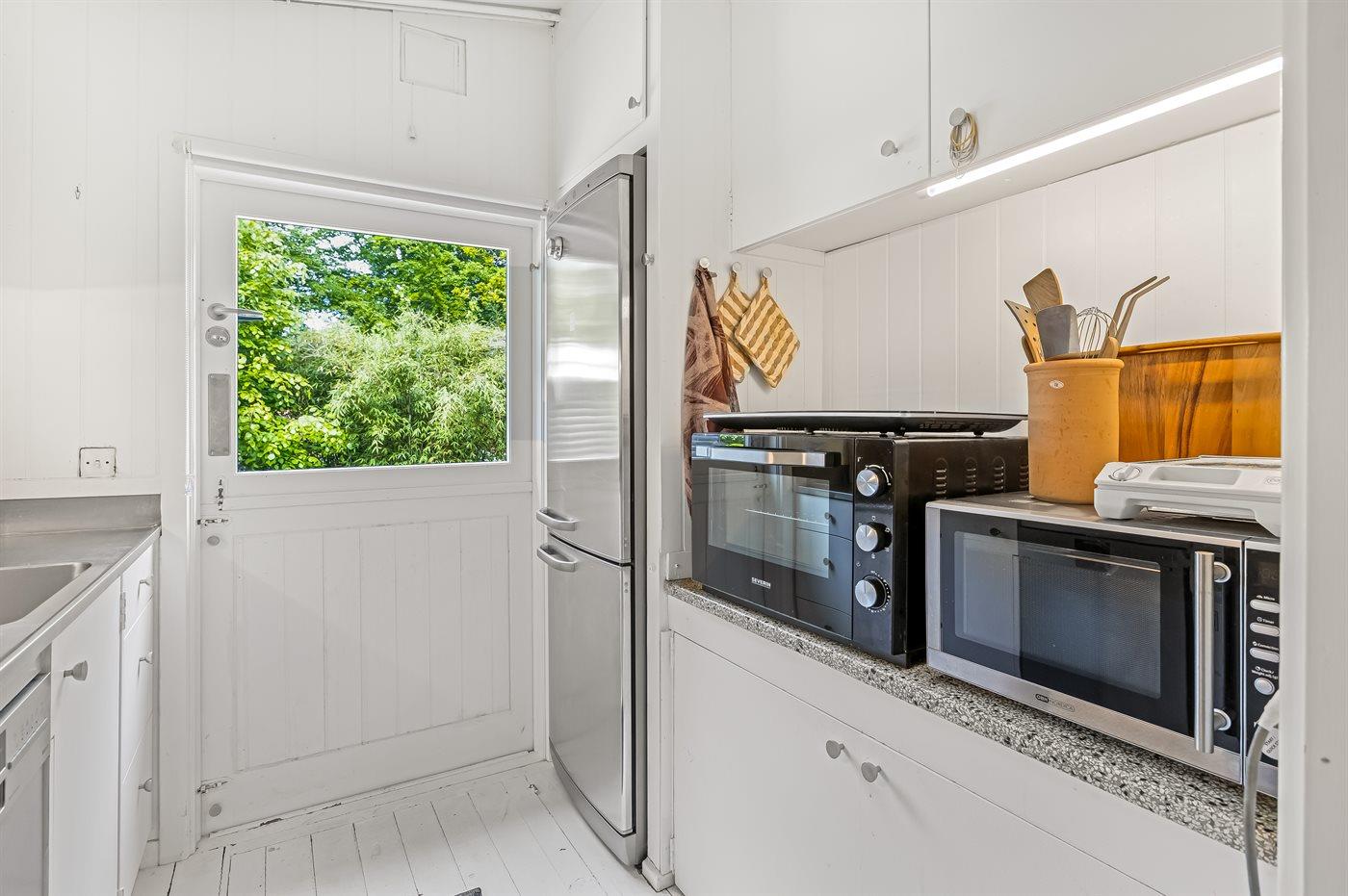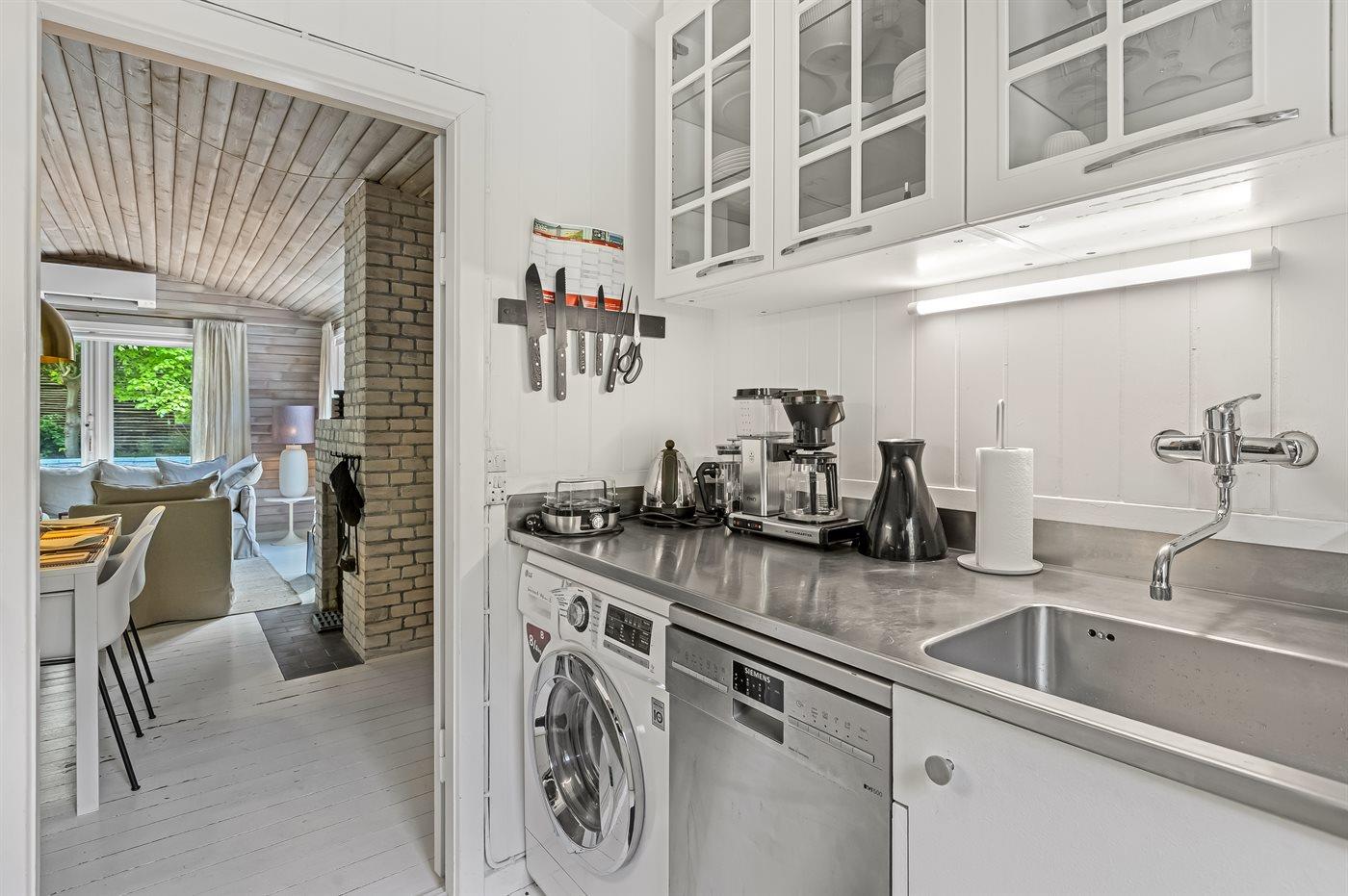 Køkkenet er udstyret med 1 køleskab. Der er 2 induktionskogeplader, miniovn, mikrobølgeovn samt opvaskemaskine.