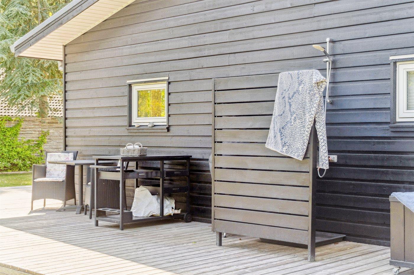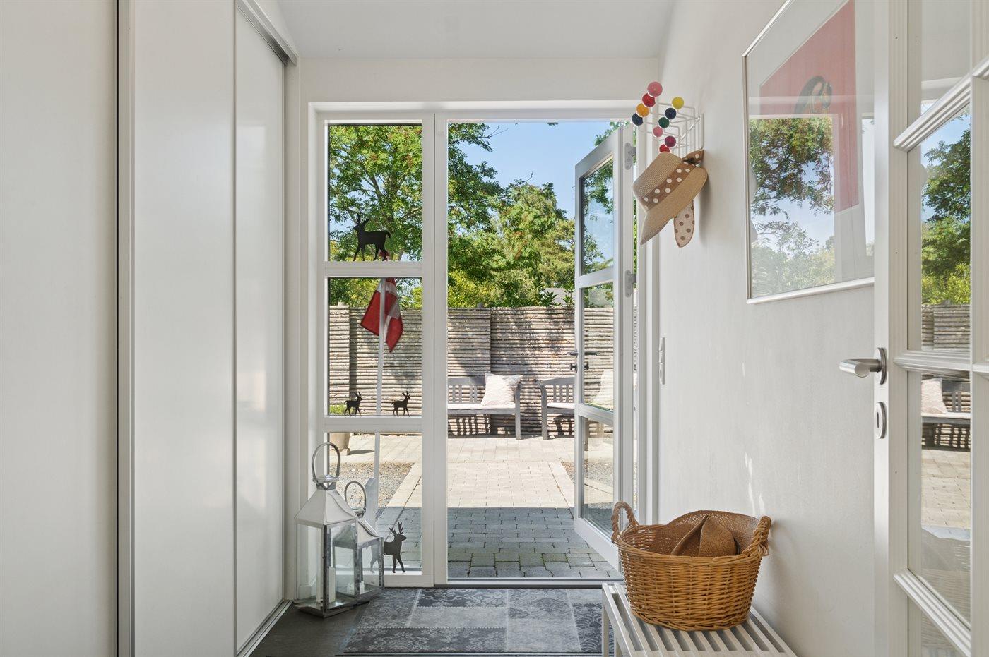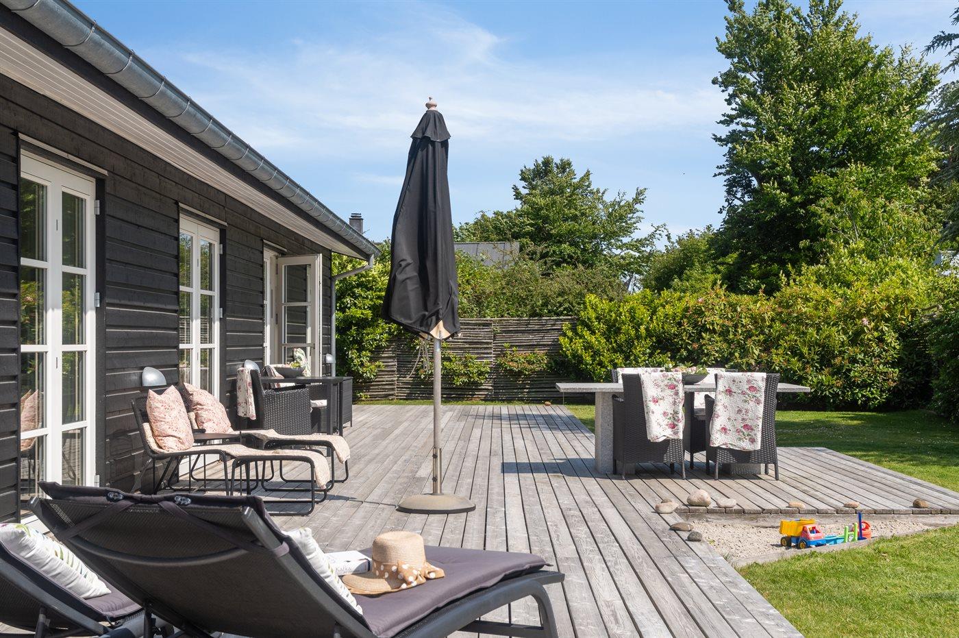 Fra opholdsrummet er der direkte adgang til en stor terrasse, hvor du kan nyde både morgensolen og de lune aftener. En del af terrassen er overdækket, så udelivet kan nydes i både sol og læ. Haven er privat og uforstyrret, med plads til både afslapning og leg.