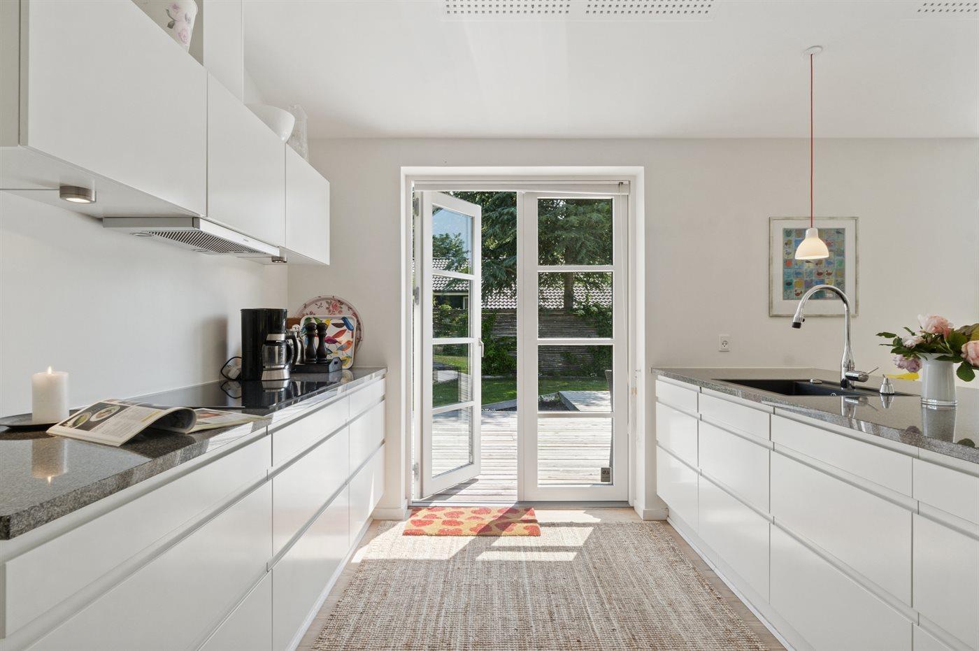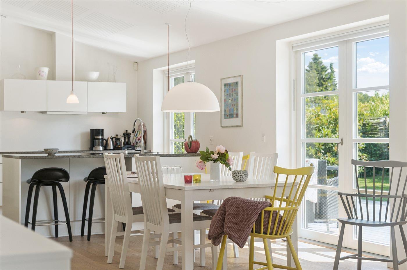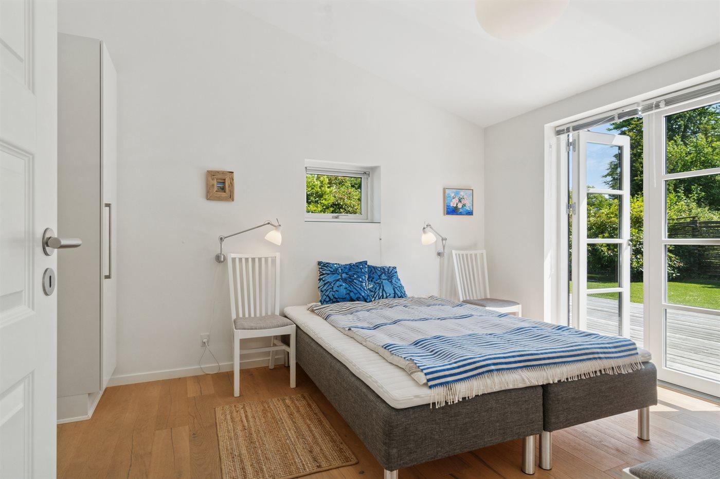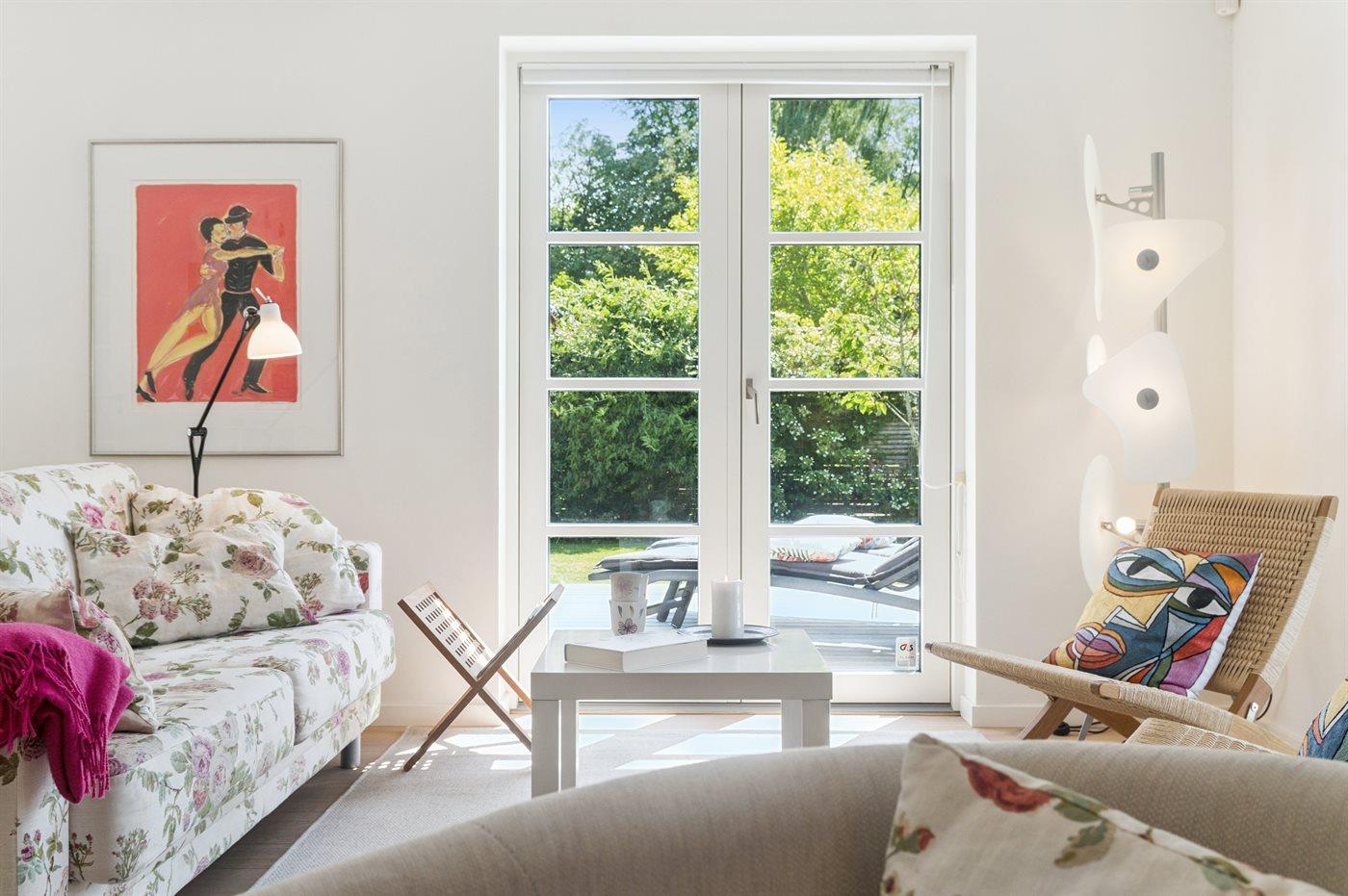 Fra opholdsrummet er der direkte adgang til en stor terrasse, hvor du kan nyde både morgensolen og de lune aftener. En del af terrassen er overdækket, så udelivet kan nydes i både sol og læ. Haven er privat og uforstyrret, med plads til både afslapning og leg.