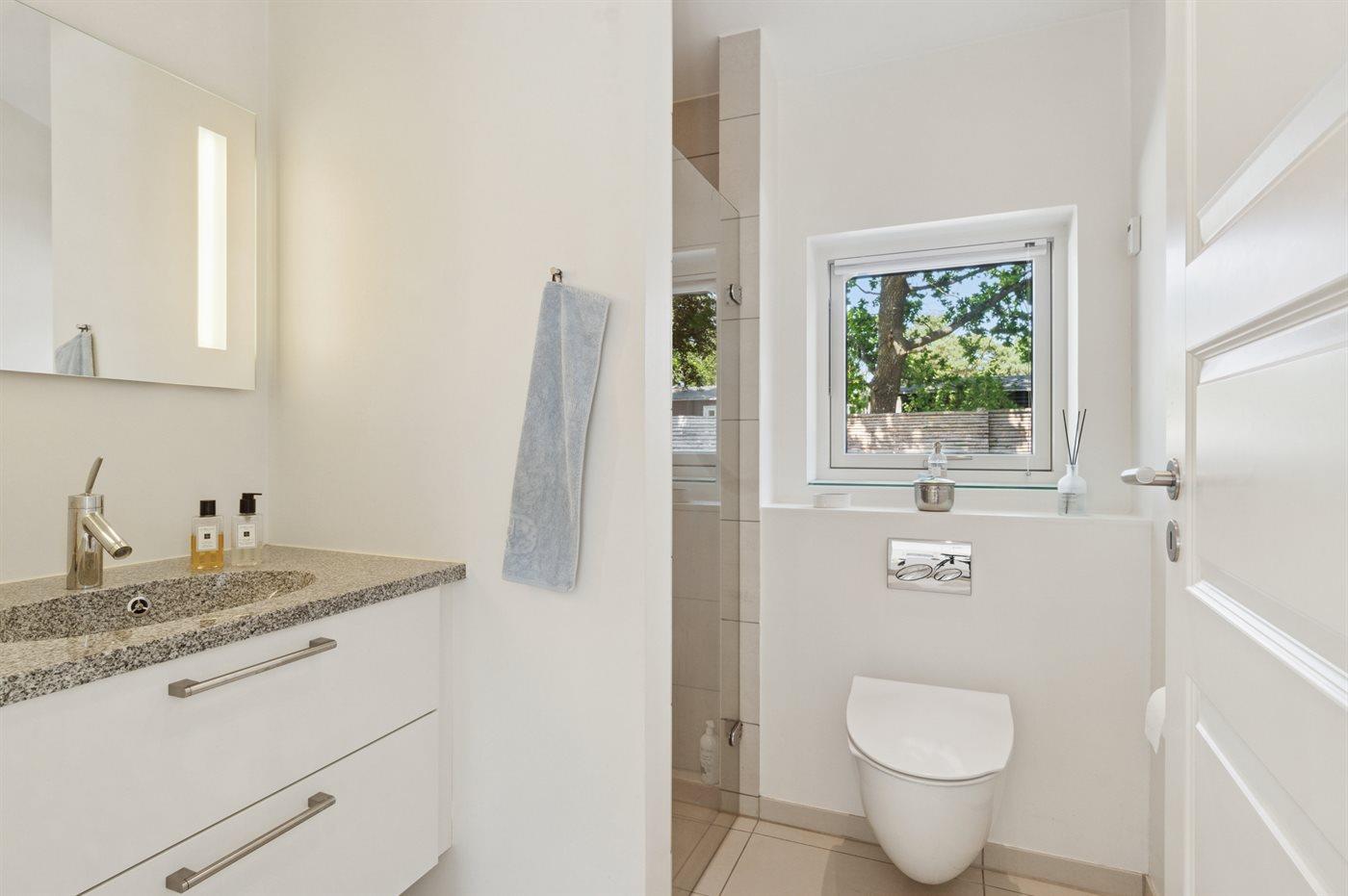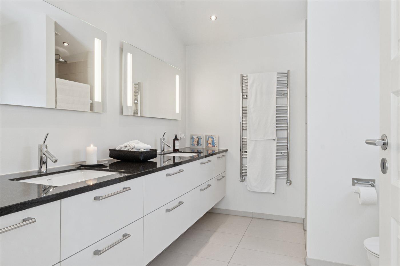 Der er 2 badeværelser med bruseniche og 2 toiletter. Der er gulvvarme på 2 badeværelser.