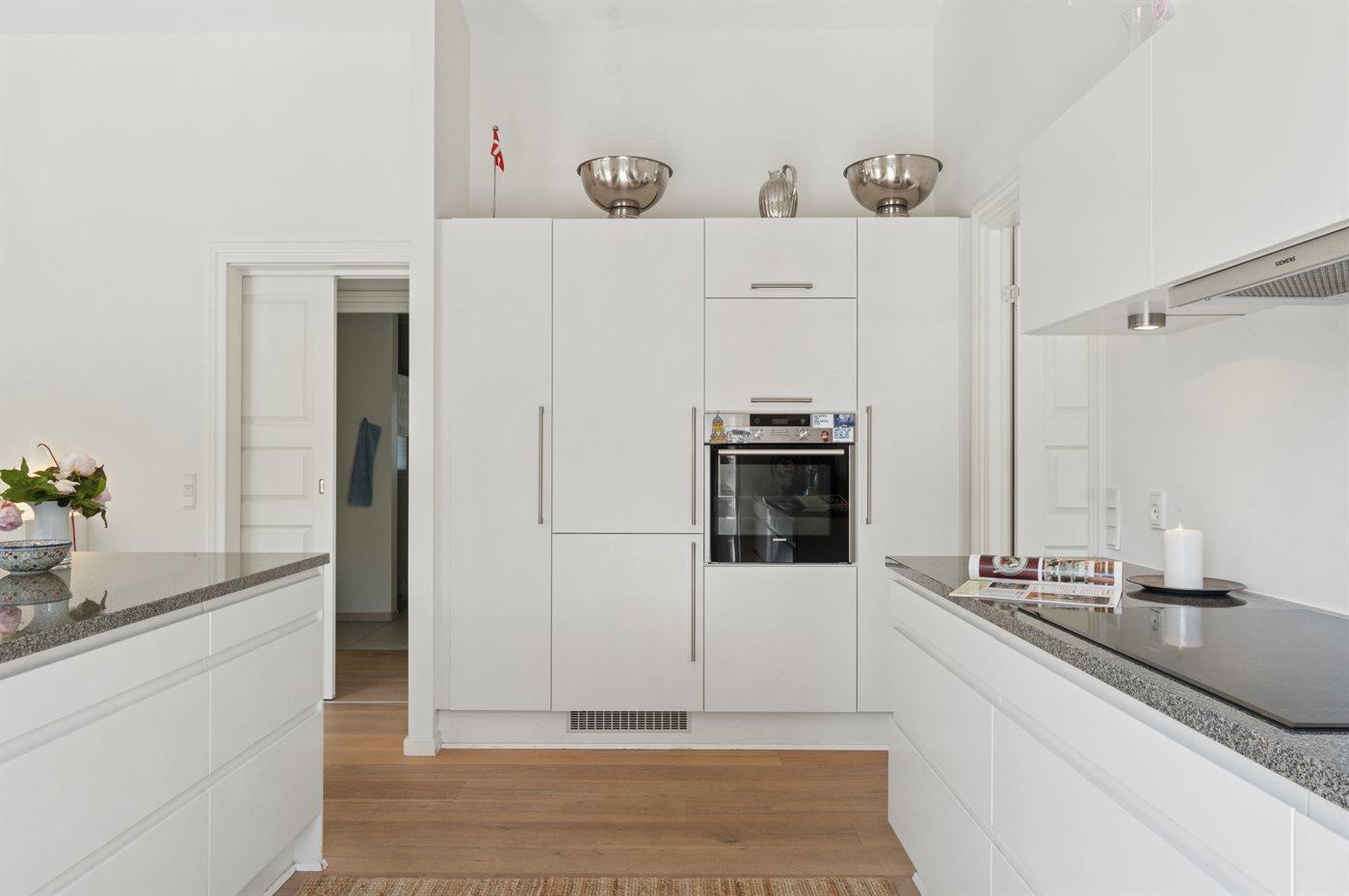 Køkkenet er udstyret med 1 køleskab. Der er 4 induktionskogeplader, varmluftovn, mikrobølgeovn samt opvaskemaskine.